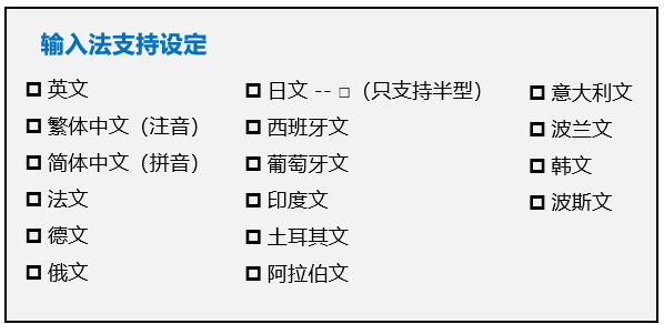 | 軟件功能 | 多語(yǔ)輸入 | ||||