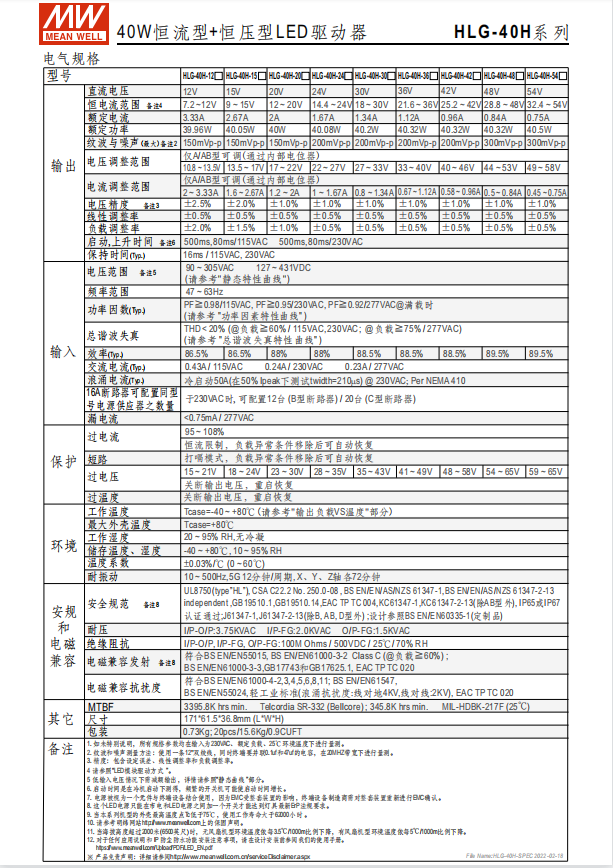 瓦數(shù): 40W~600W 功能特性 90~305VAC交流輸入,內(nèi)建主動(dòng)式功率因子矯正功能(active PFC) 96%超高效率(HLG-600H) 金