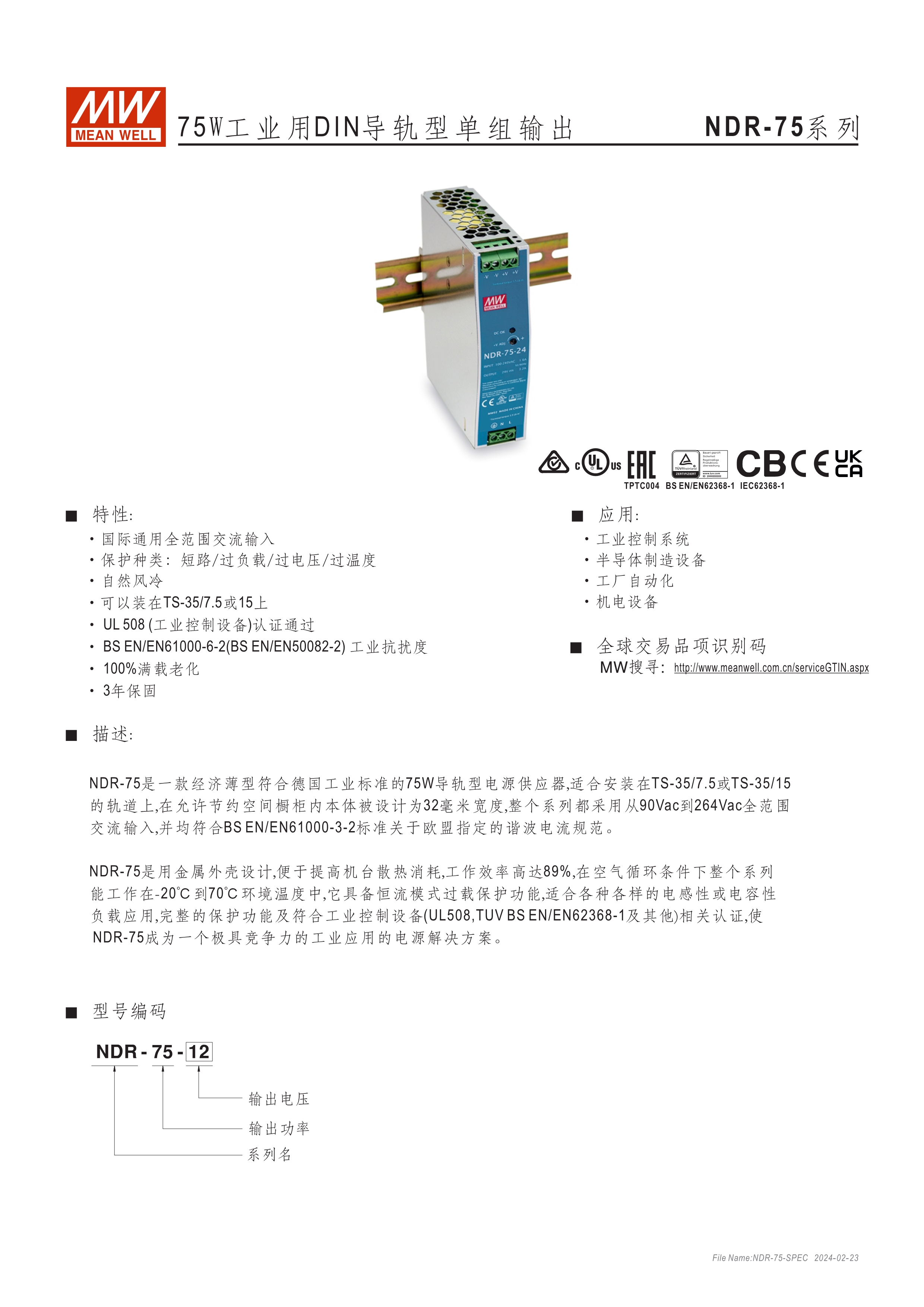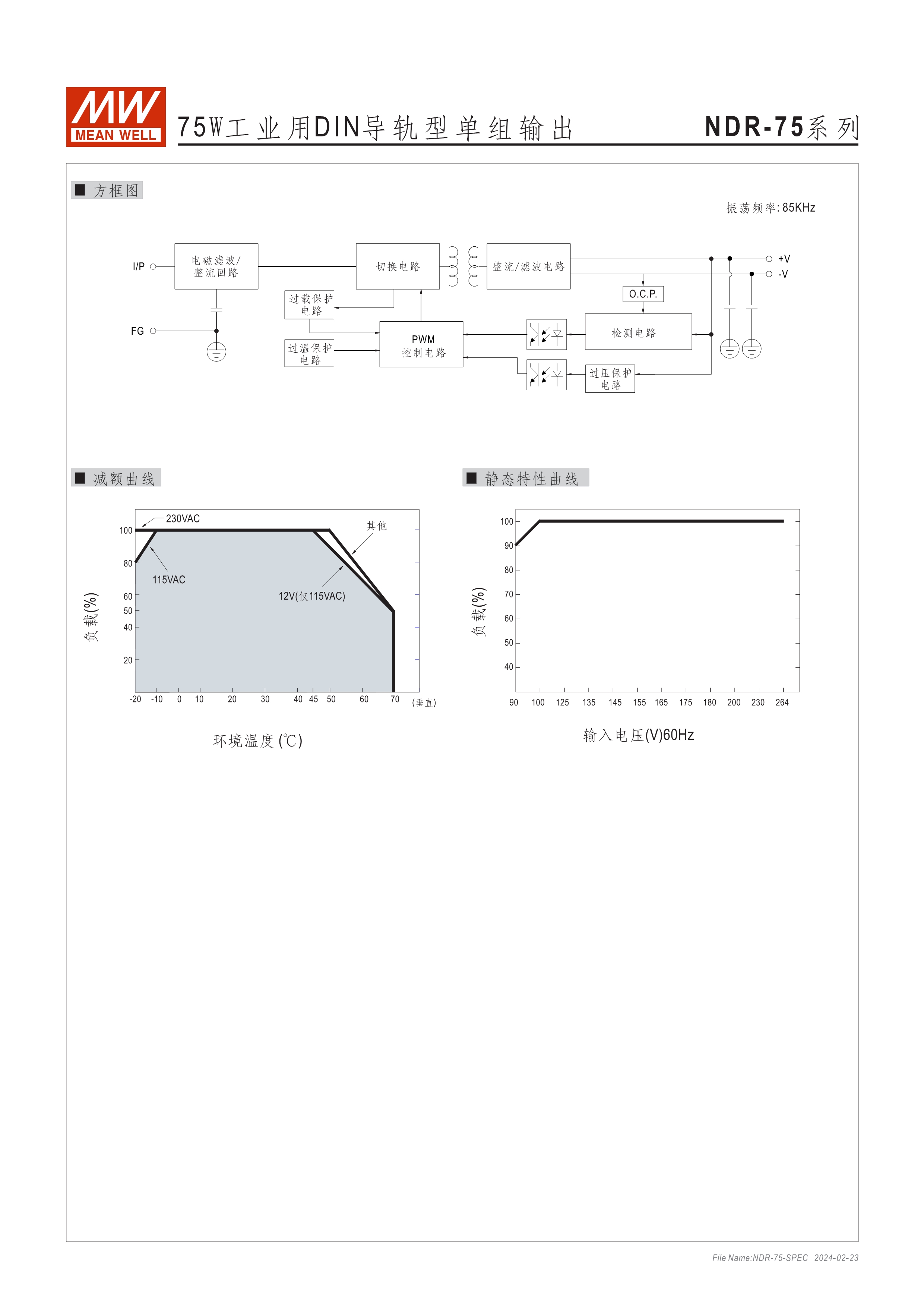 金屬殼,經(jīng)濟款 單相, 90~264Vac, 全范圍輸入 窄面寬設(shè)計:32~85.5mm EMC EN55022 class B 適合安裝于DIN rail TS-35 / 7.5或15 3年保固期