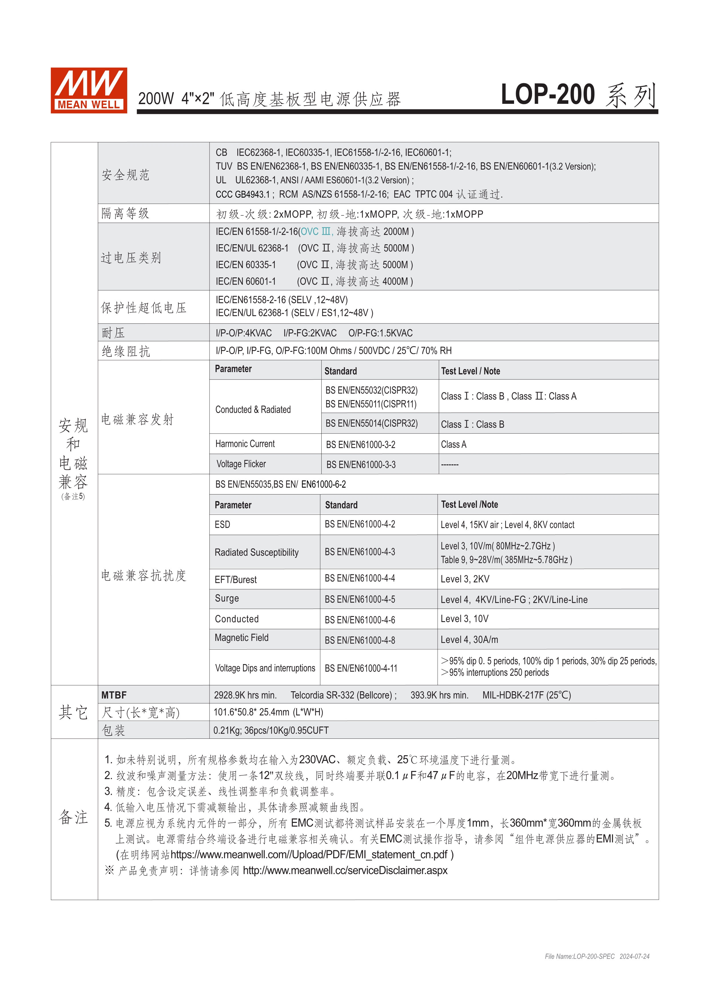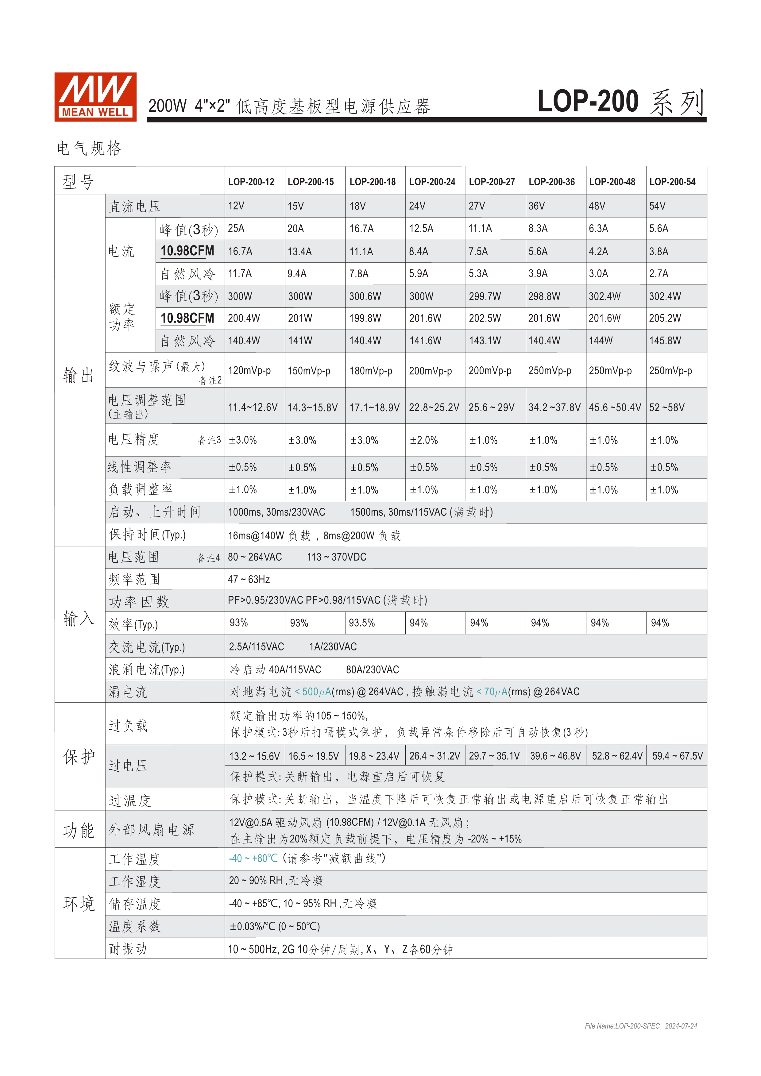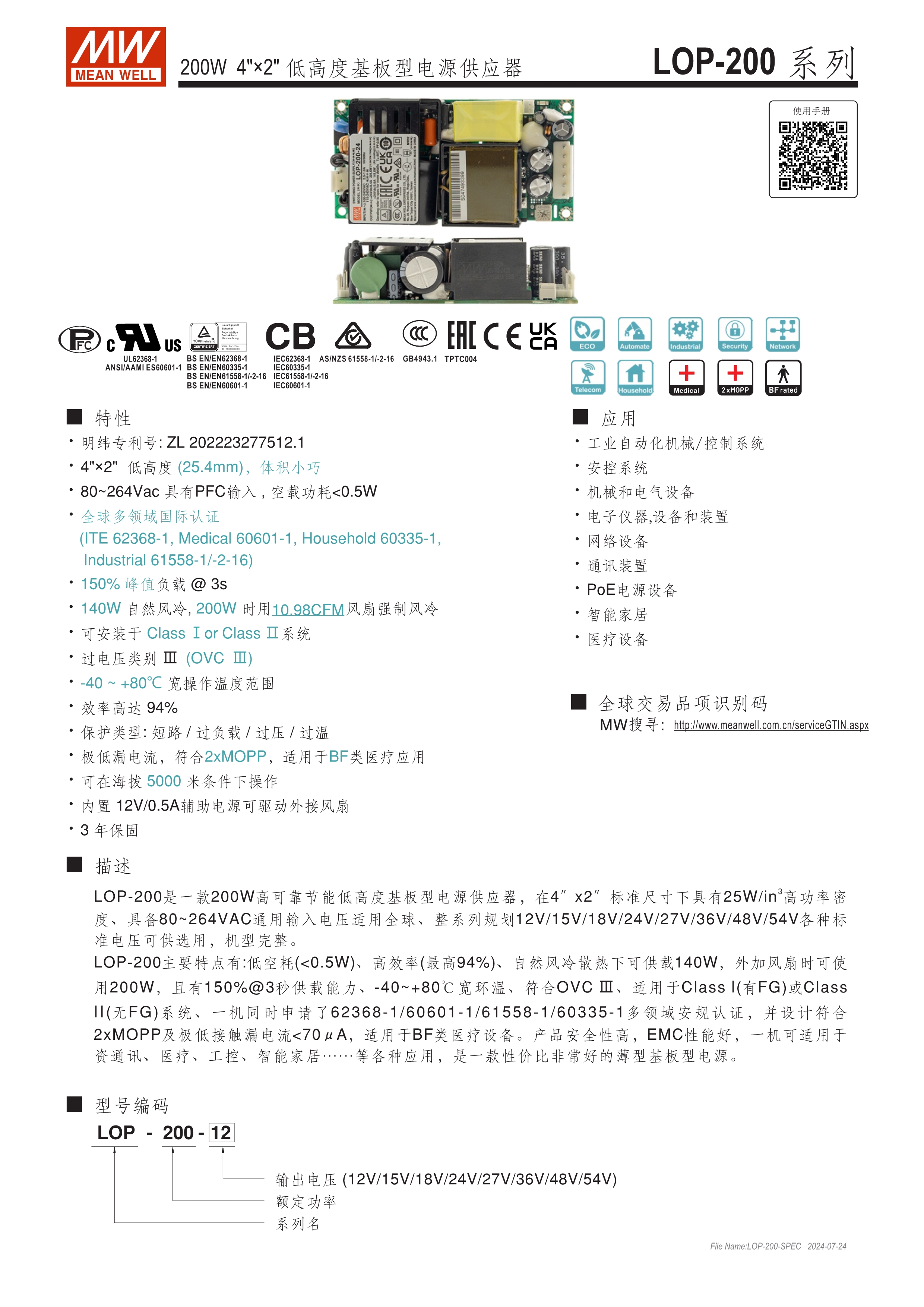明緯專利號:ZL 202223277512.1 4"x2" 和 5"x3" 低高度小巧外型 (25.4mm~33.5mm) 全球安規(guī)多領(lǐng)域認(rèn)證 (資通訊62368-1, 醫(yī)療60601-1, 家用60335-1, 工業(yè)用61558-1/-2-16) 150%峰值負(fù)載@3秒 符合Class I或Class II 過電壓類別III (OVC III) -40℃ ~ +80℃寬操作溫度範(fàn)圍