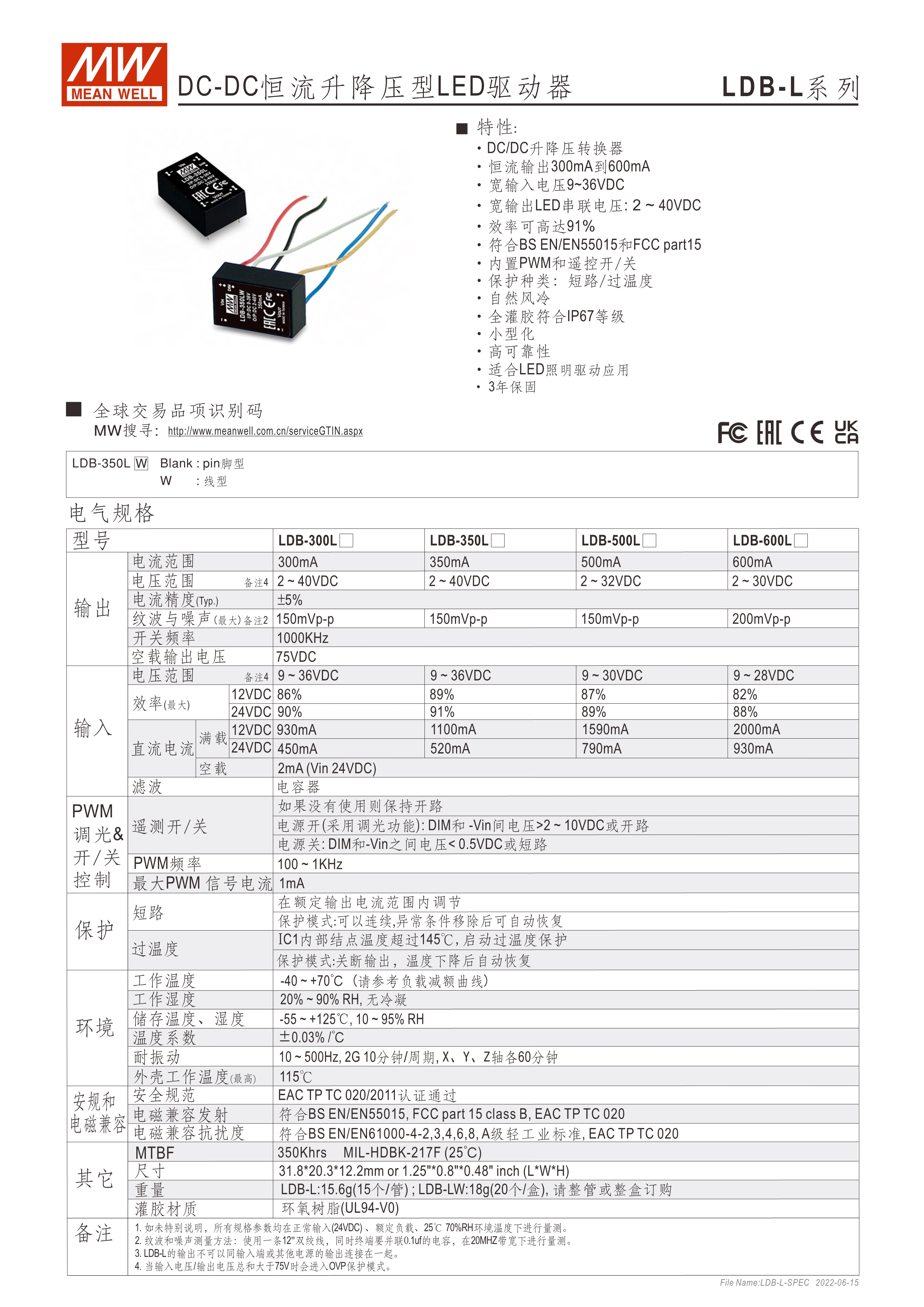 DC/DC升降壓式恒流輸出LED驅動器 91%高效率 不需外接任何組件即可符合EN55015及FCC 具PWM調光及開關遙控功能 適合降壓-升壓型照明系統(tǒng) (需插件于PCB母板上) 具備插pin及出線兩種型式
