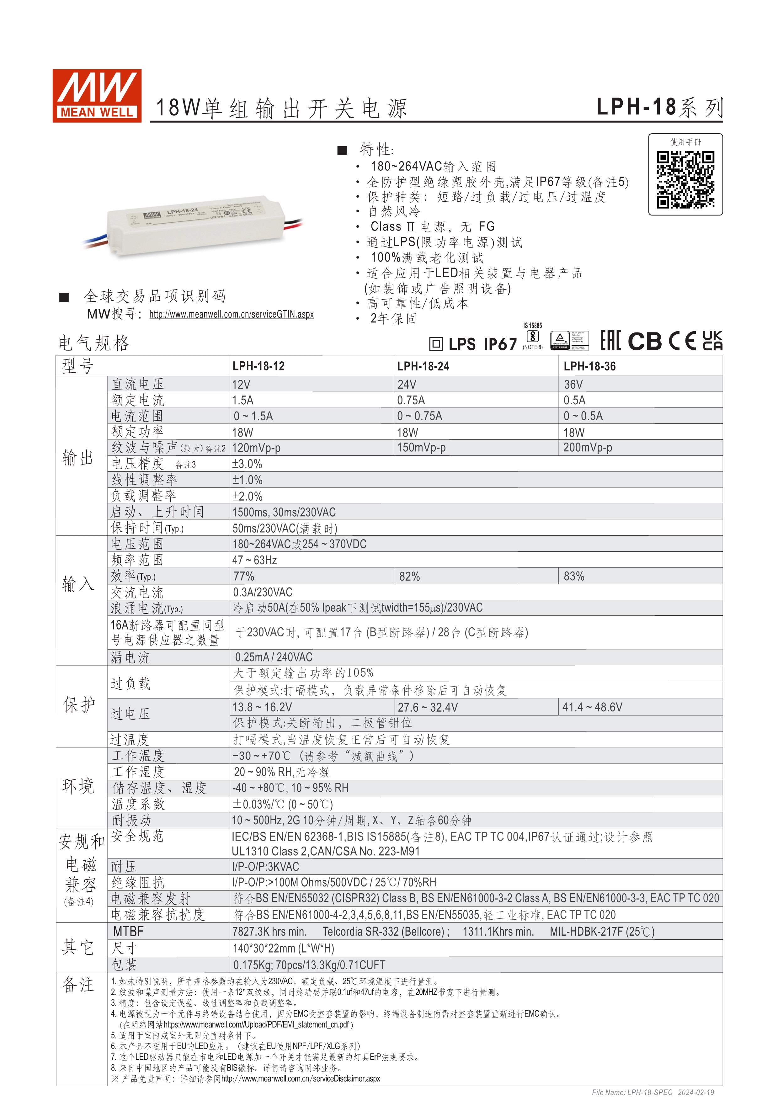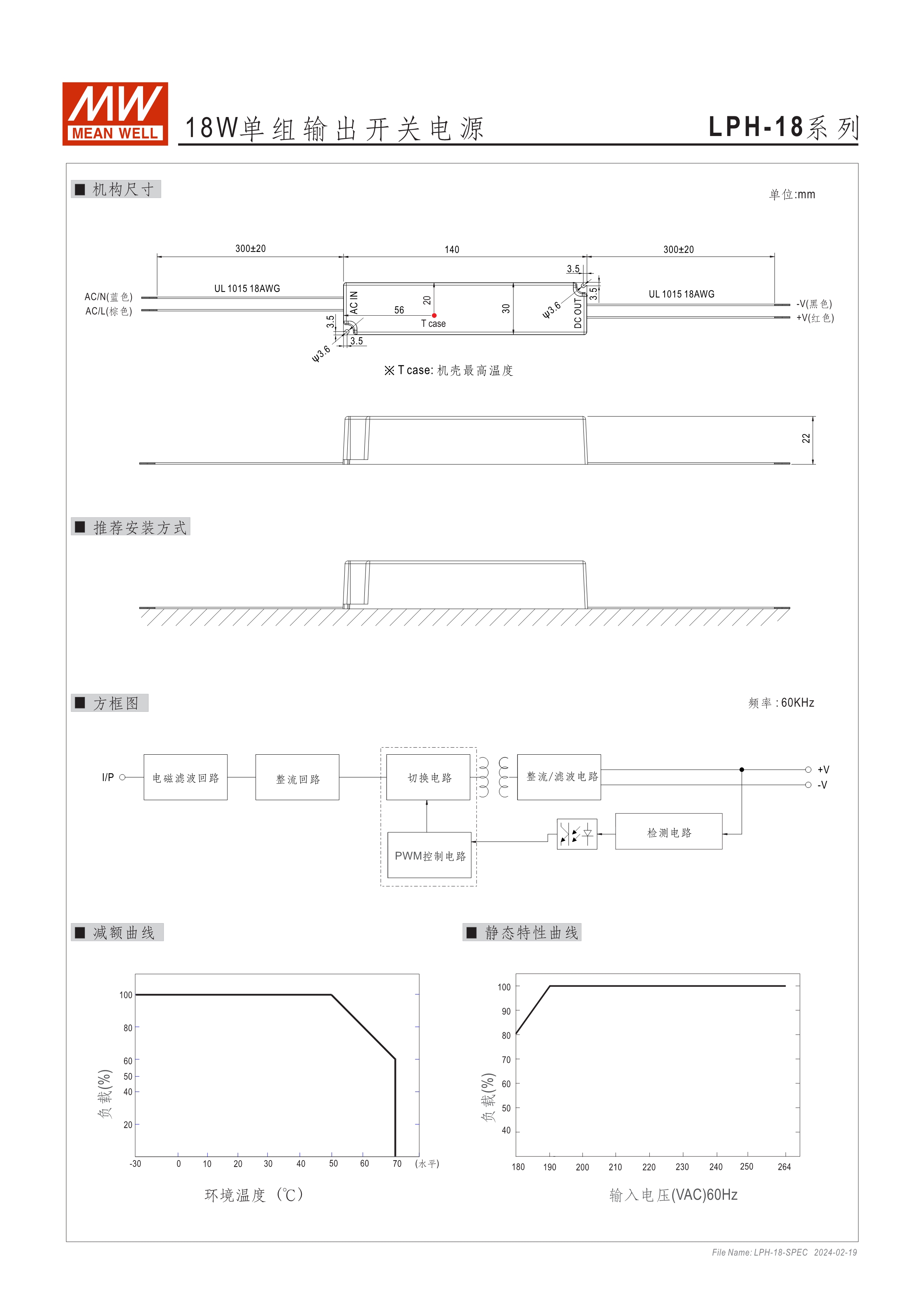 90~264VAC 交流輸入 (18W及150W除外) 長條型塑料外殼,IP67防護等級 經(jīng)濟型系列 可承受300VAC突波輸入達5秒(LPV/C-20/35/60/100) -30~70℃寬工作環(huán)溫范圍 Type "HL" LED電源適用在安裝于Class I, Division 2 類 危險地點之照明燈具(僅LPVL-150) 適合于經(jīng)濟型LED照明及LED電子廣告牌相關(guān)應(yīng)用