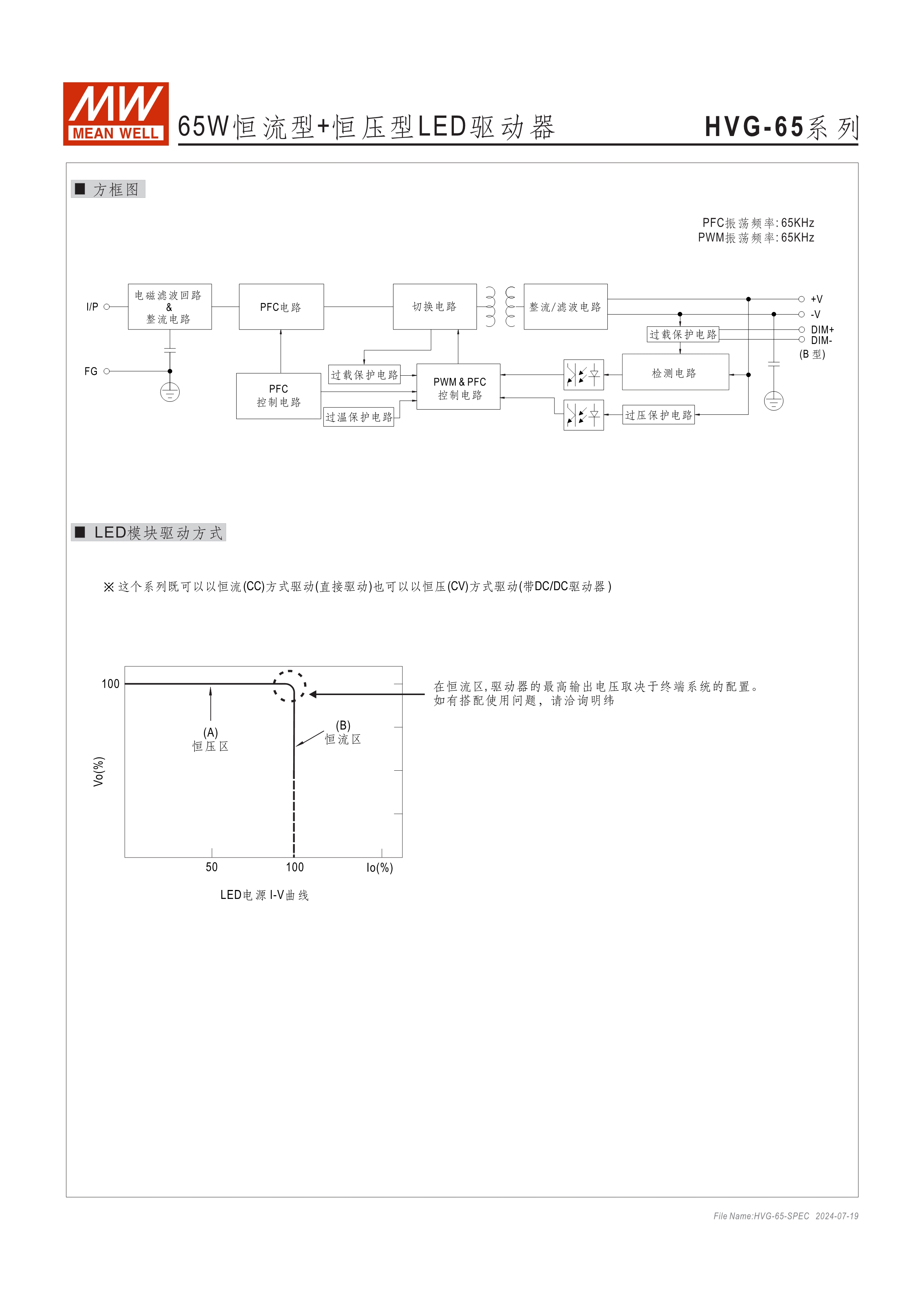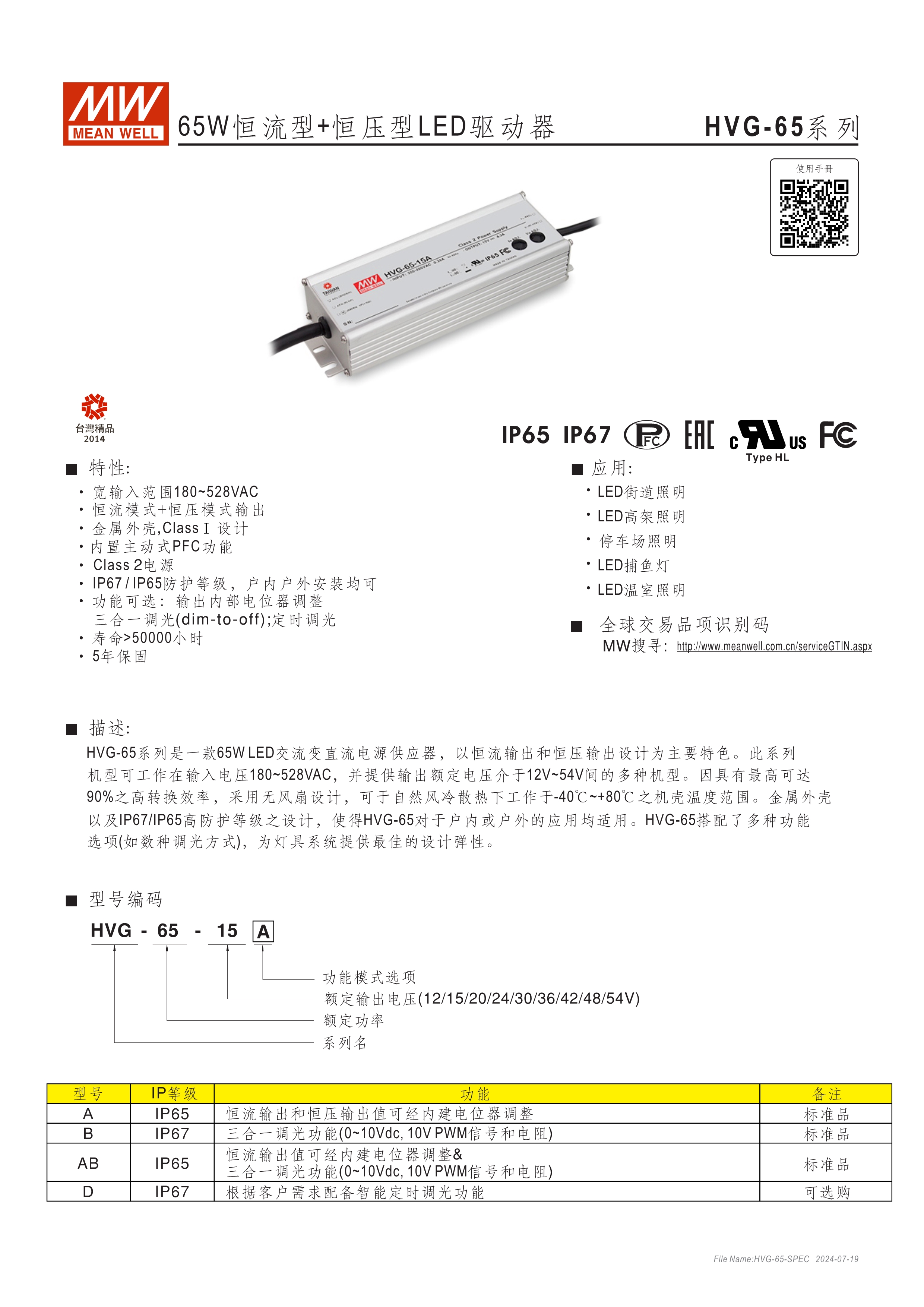 寬輸入范圍180~528VAC 金屬外殼,IP67/IP65防護等級可用于戶外與室內(nèi) 內(nèi)建主動式功率因子矯正功能(active PFC) 功能選項 : 輸出可經(jīng)由電位器調(diào)整;三合一調(diào)光(0~10Vdc或10V PWM信號或電阻,可關(guān)斷);定時調(diào)光;智能定時調(diào)光 Type "HL" LED電源適用在安裝于Class I, Division 2 類 危險地點之照明燈具(HVG-65及HVGC-65/100除外) 適合于LED路燈及戶外LED照明等應(yīng)用 5年保固期