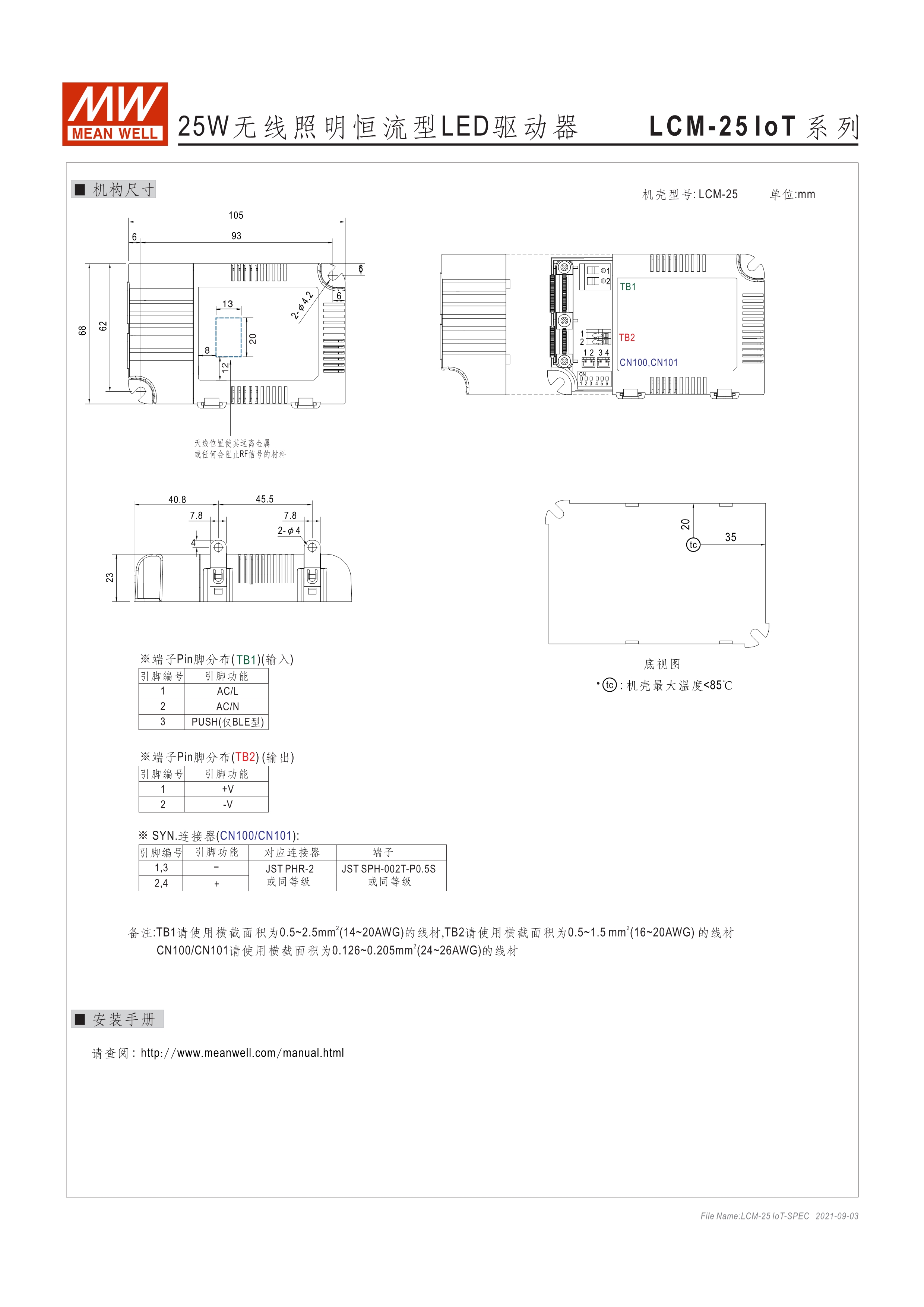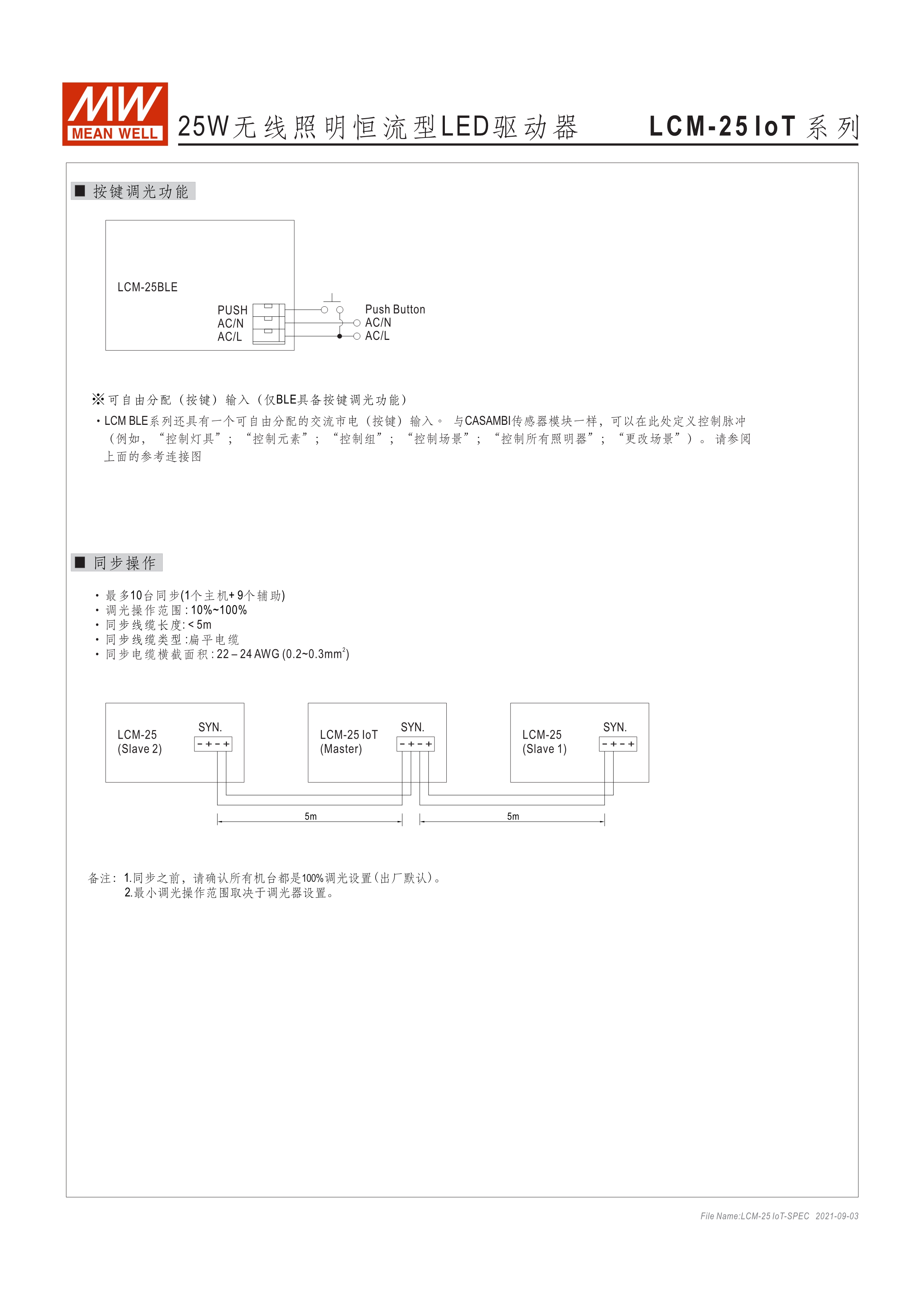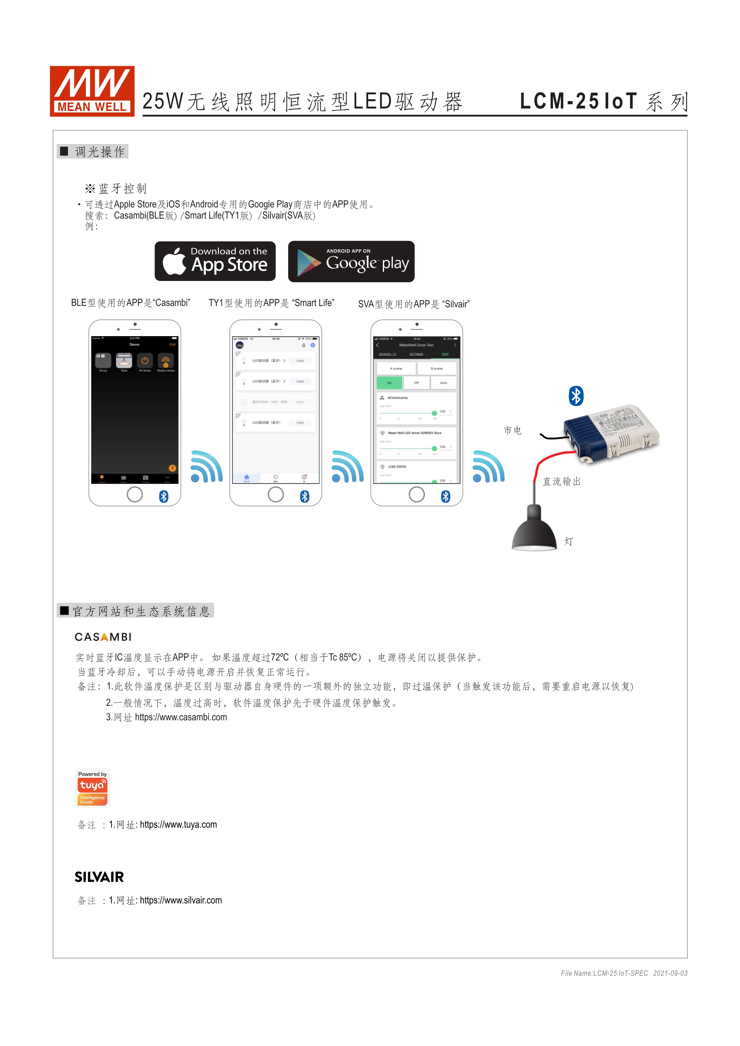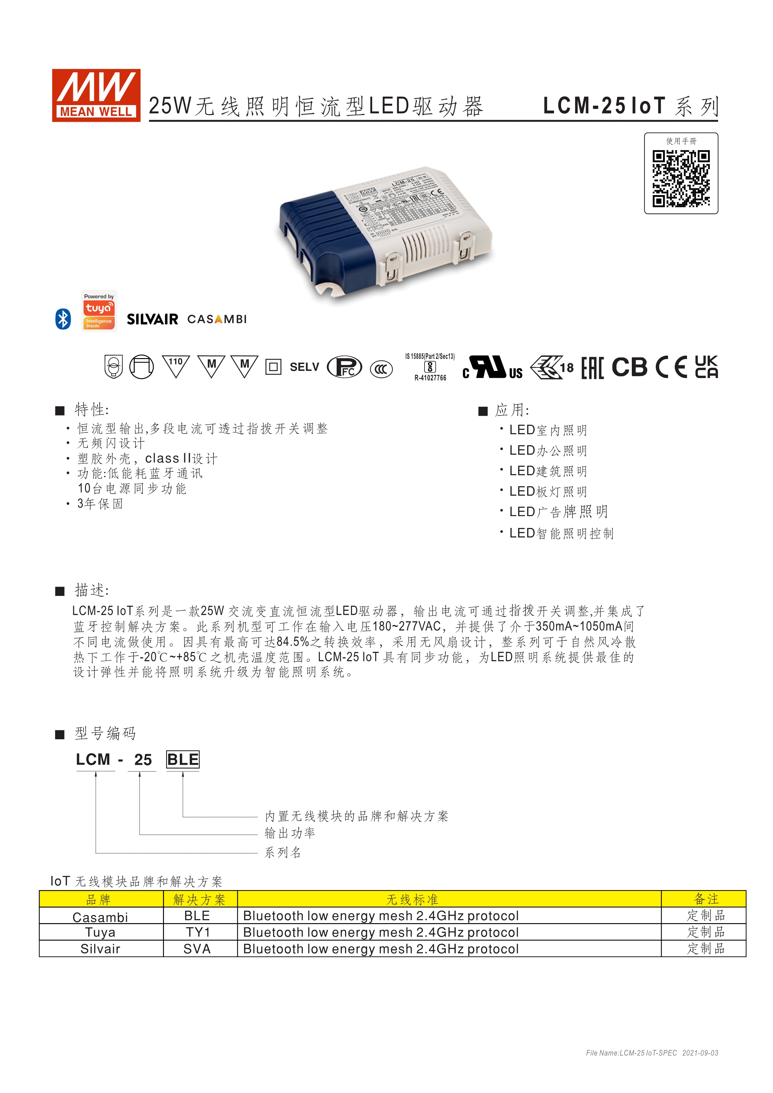 恒流輸出模式多段可選 無(wú)頻閃設(shè)計(jì) 塑料外殼及符合Class II無(wú)地線設(shè)計(jì) 主動(dòng)式PFC設(shè)計(jì) 調(diào)光功能:全系列藍(lán)芽智能控制及Push Dim(僅LCM系列) 雷擊保護(hù)耐壓設(shè)計(jì)2KV(L-N) 保護(hù)功能:短路、過(guò)電壓、過(guò)溫度
