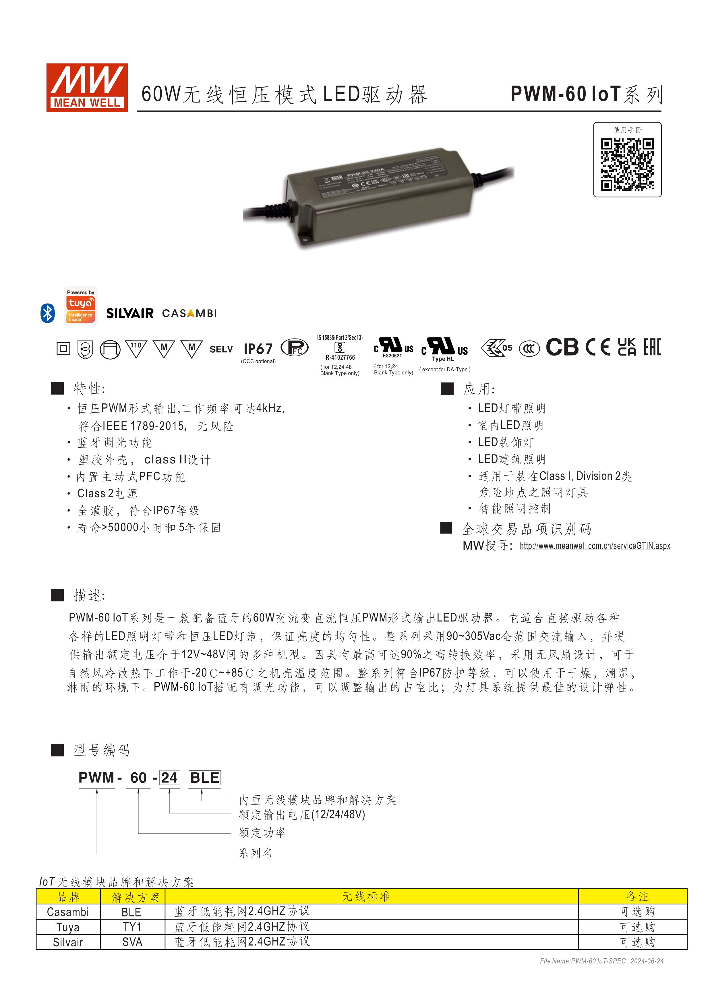 恒壓輸出模式多種可選 (PWM系列) 無頻閃設(shè)計 塑料外殼及符合Class II無地線設(shè)計 主動式PFC設(shè)計 雷擊保護耐壓設(shè)計2KV(L-N) 保護功能:短路、過電壓、過溫度