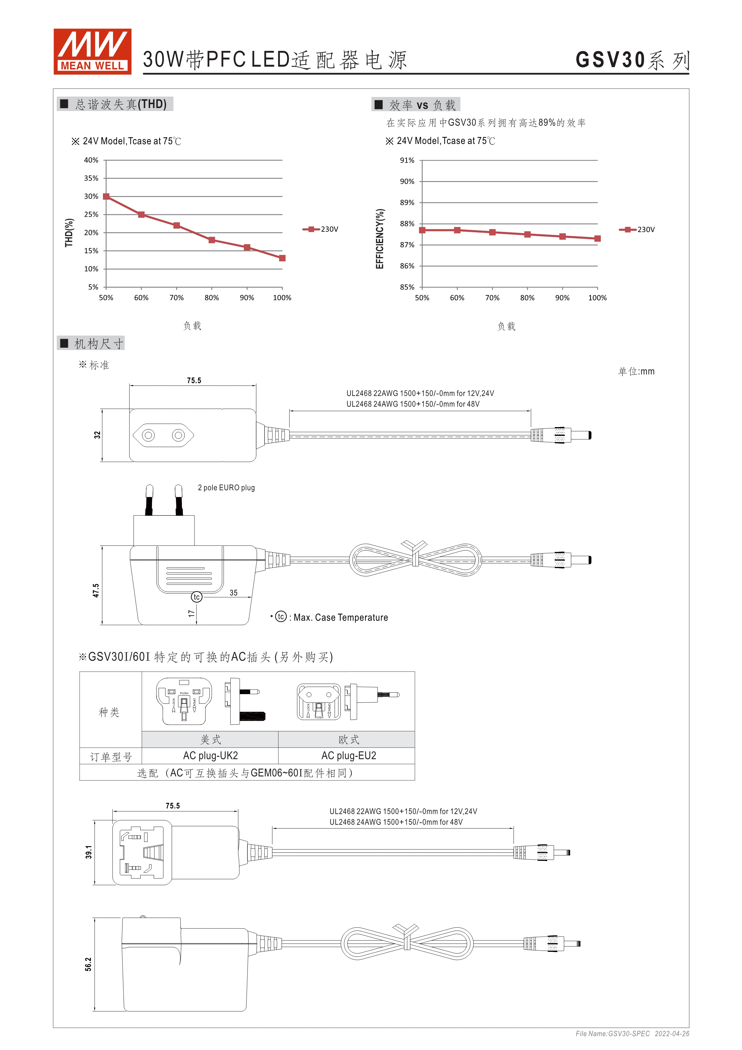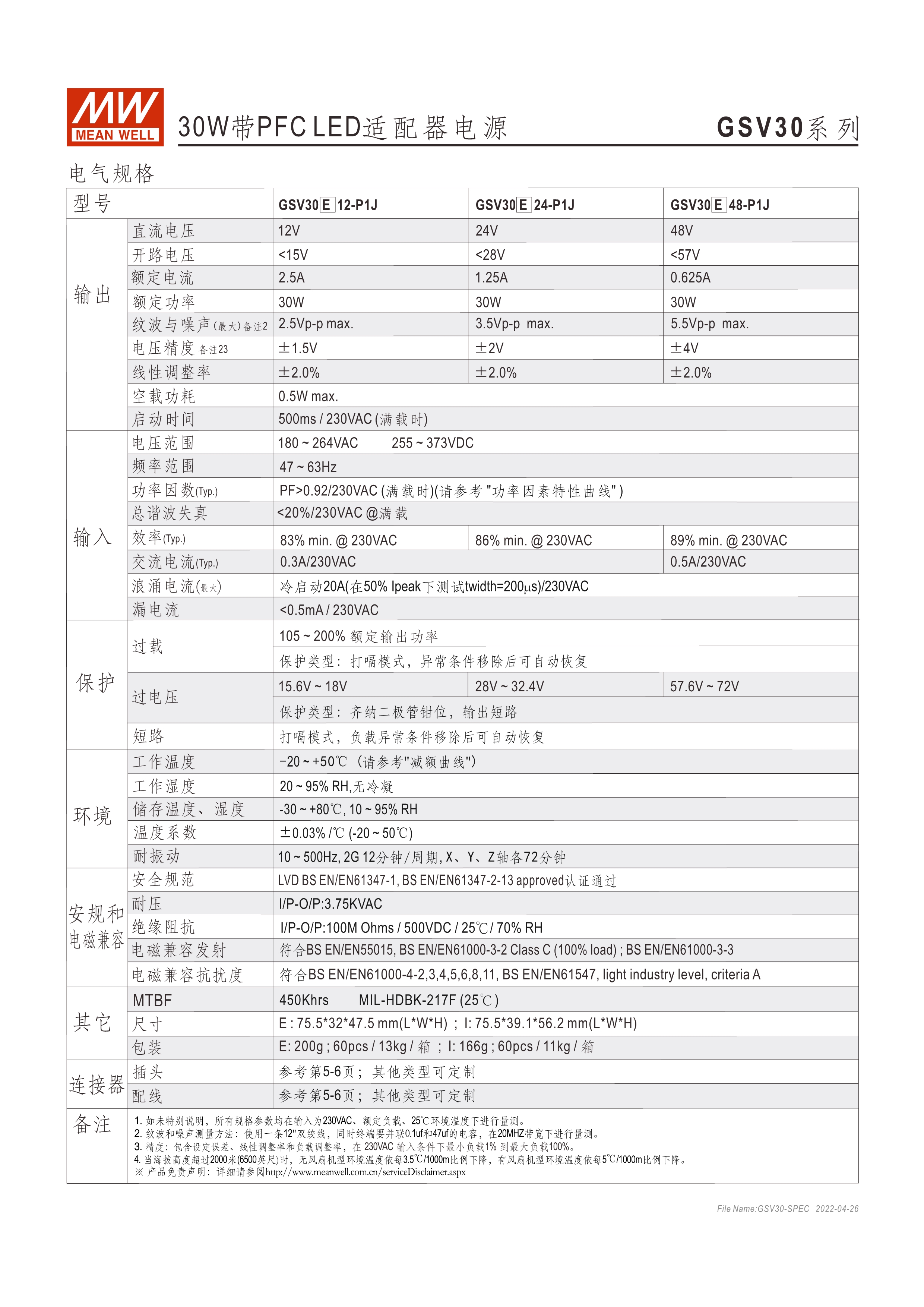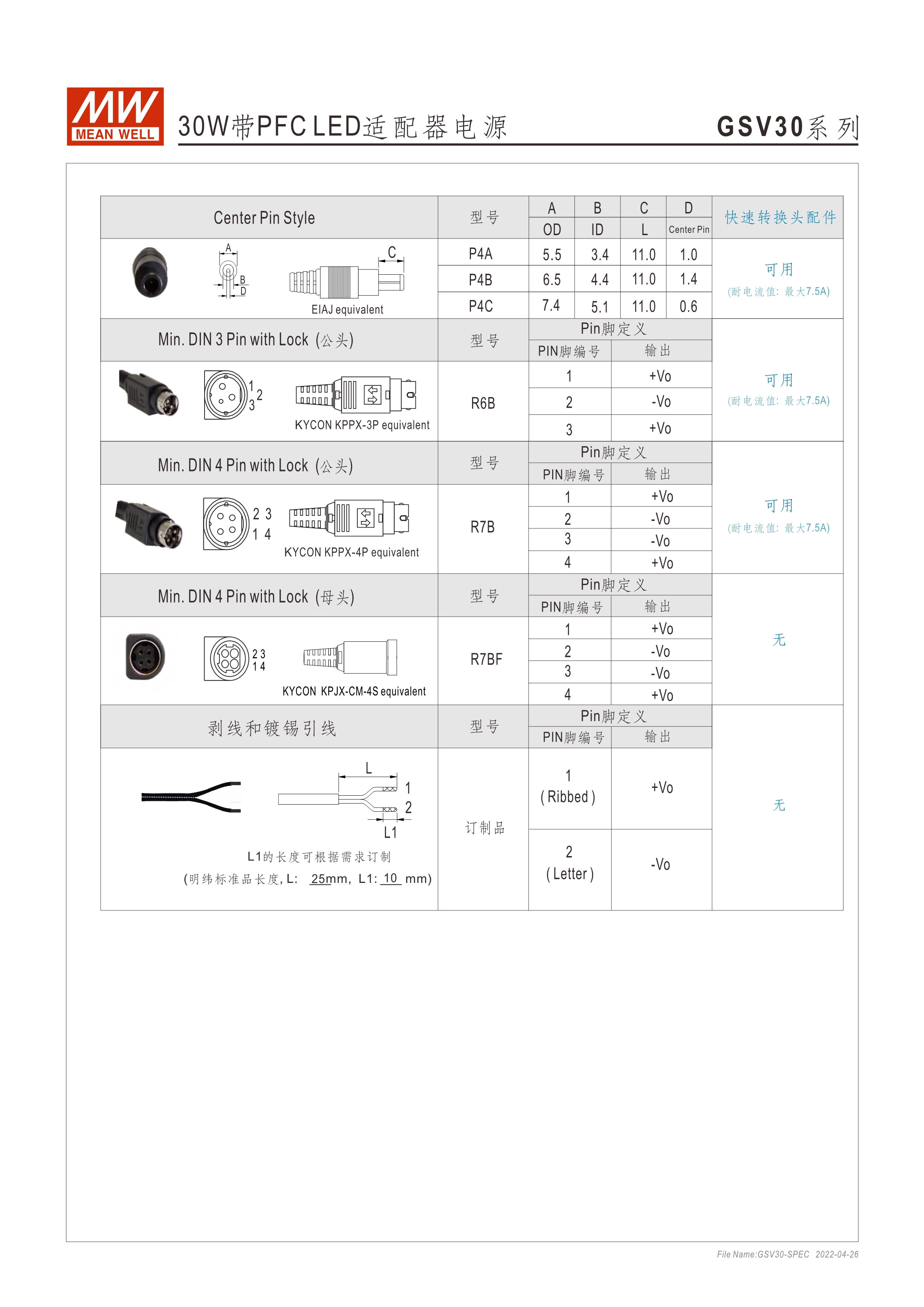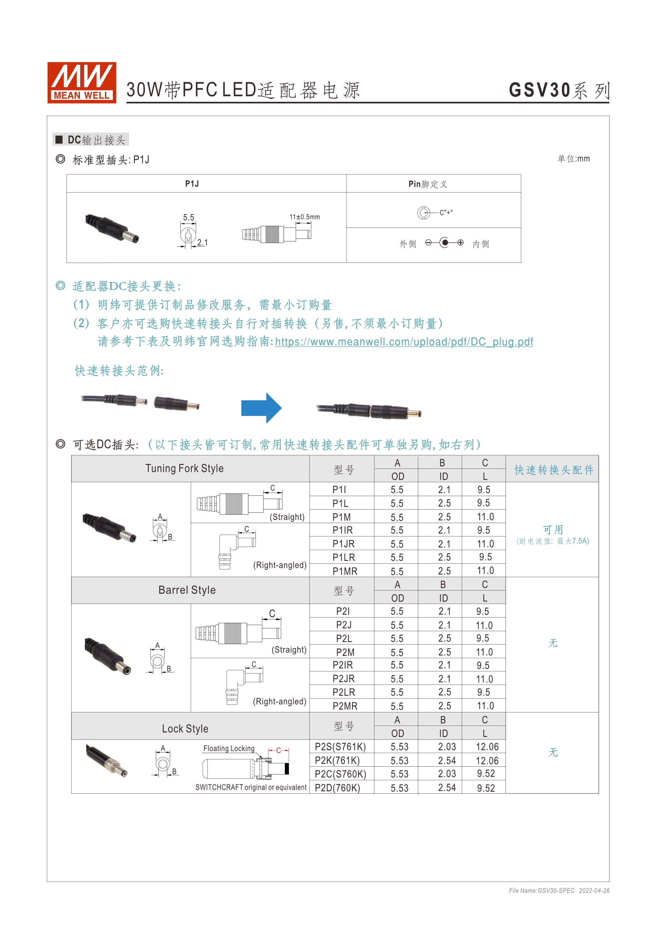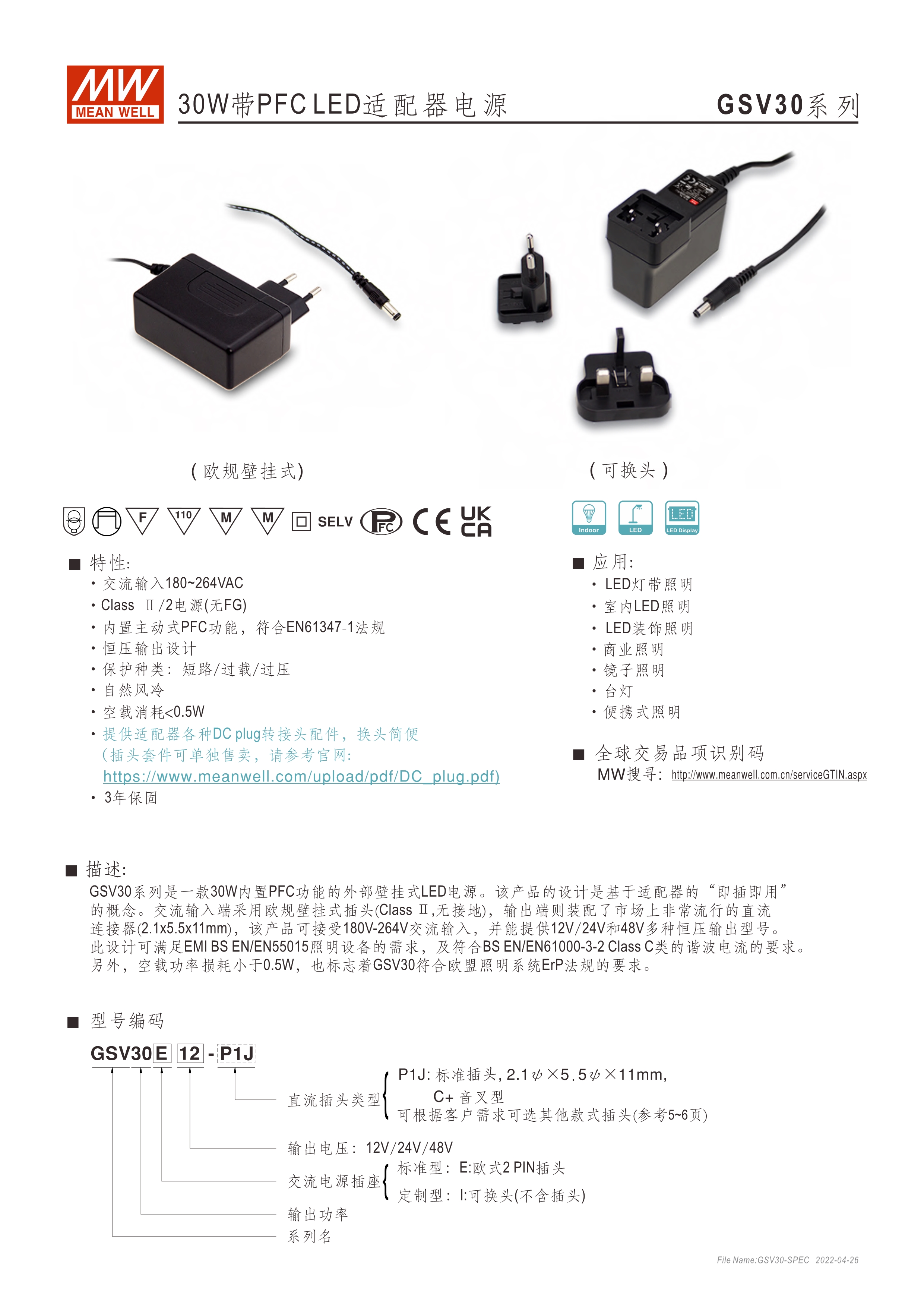 多種DC輸出轉(zhuǎn)接頭可更換 Class II/2 , no FG 恒壓設(shè)計 內(nèi)建PFC功能,符合EN61347-1法規(guī) 空載損耗<0.5W
