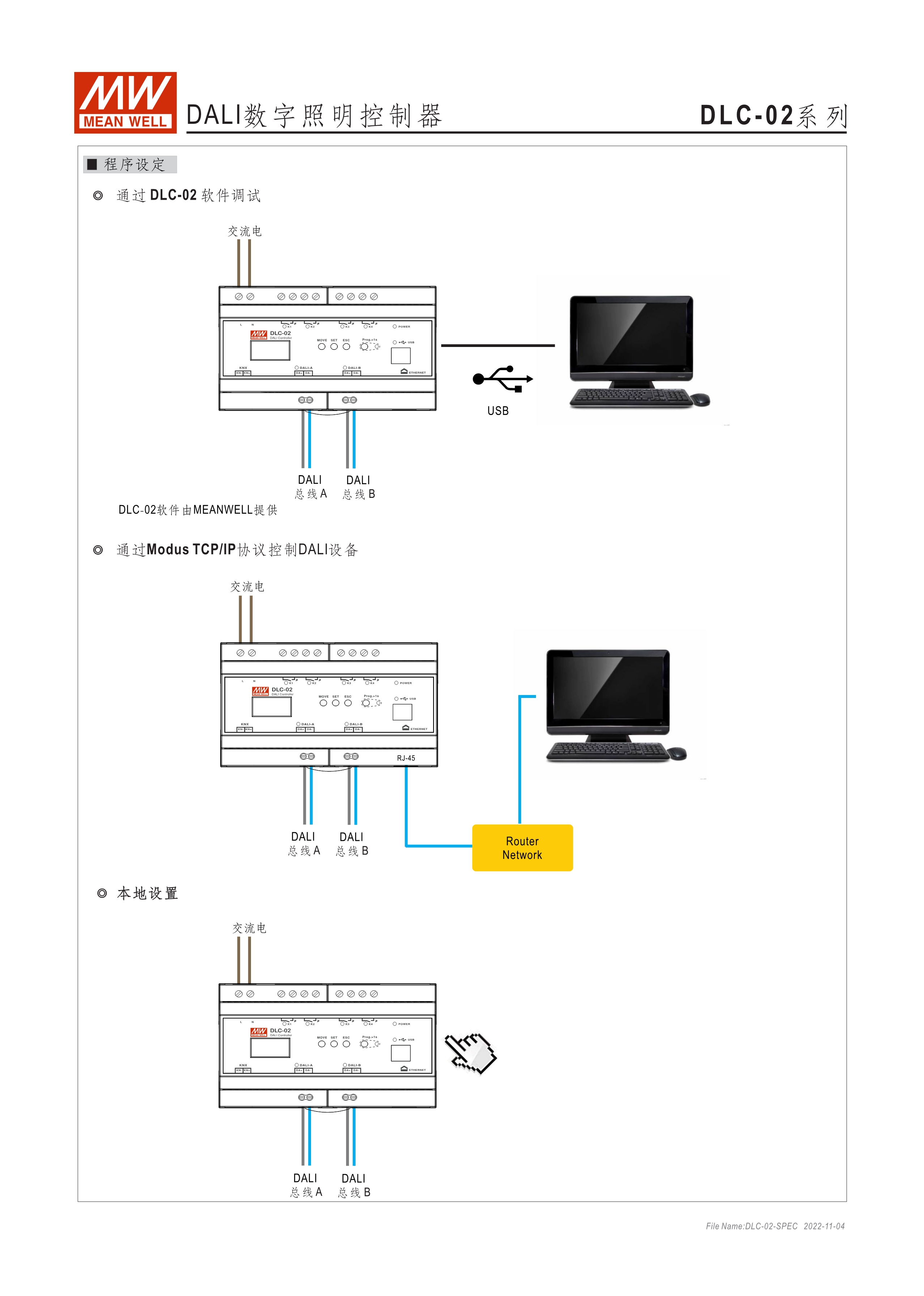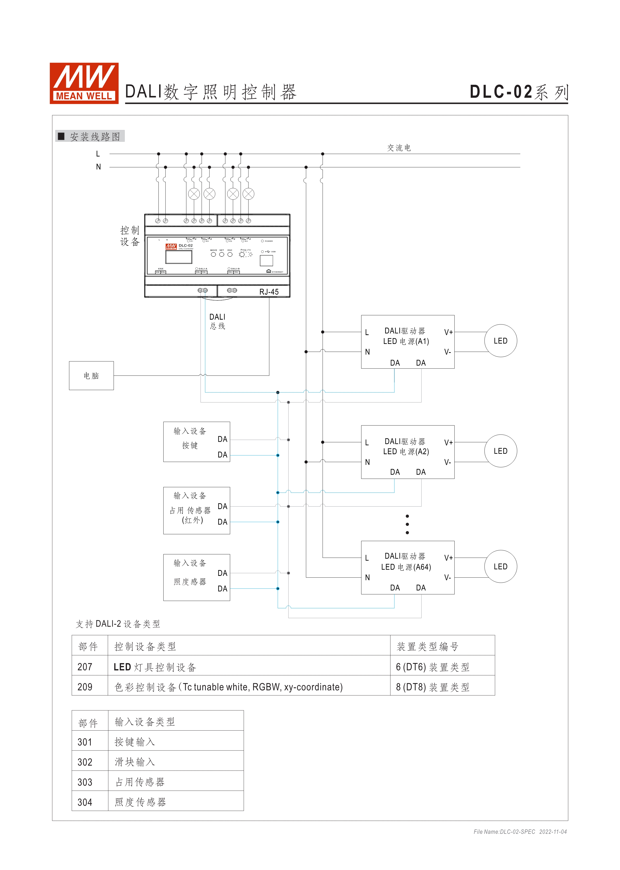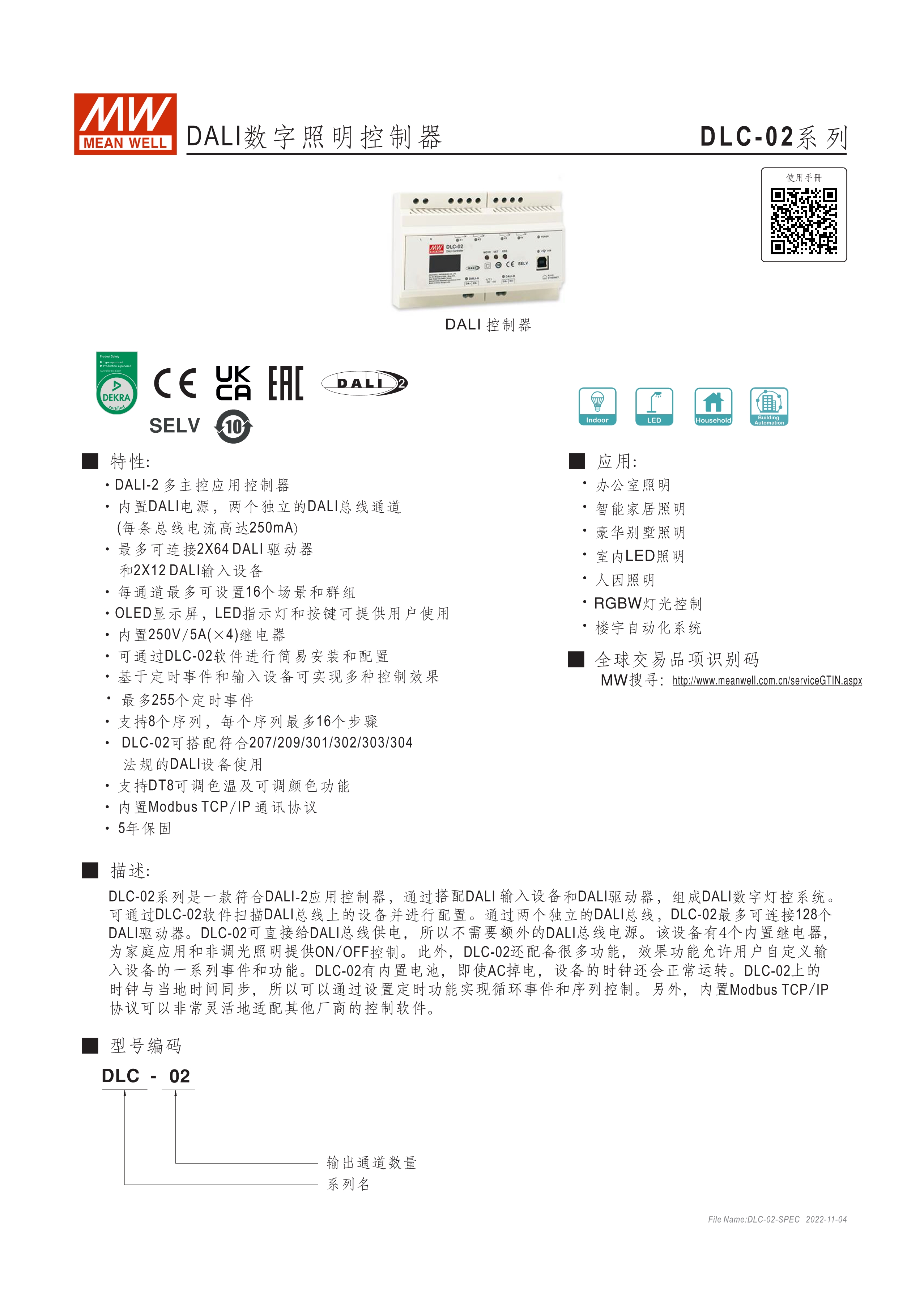 符合IEC 62386 DALI-2,Part 101/103/207/208/301/302/303/304標(biāo)準(zhǔn) 2組獨(dú)立DALI總線,可接Control Gear及Control Device搭配使用 4路可控繼電器,接觸容量5A,可當(dāng)電器開(kāi)關(guān)或兩組電動(dòng)窗簾使用 可搭配DLC軟體做現(xiàn)場(chǎng)系統(tǒng)設(shè)定,或透過(guò)網(wǎng)路線從遠(yuǎn)端做修改設(shè)定 透過(guò)本體液晶顯示螢?zāi)患安倏匕粹o,可做簡(jiǎn)單設(shè)定和狀態(tài)查詢(xún) 內(nèi)建Timer晶片,可搭配DLC軟體做行程控制設(shè)定 通訊介面接口:RJ-45及KNX,可與其他樓宇自動(dòng)化系統(tǒng)做連線擴(kuò)充使用 采導(dǎo)軌式設(shè)計(jì),體積小巧僅8SU寬度(144x 90x 58.4mm)