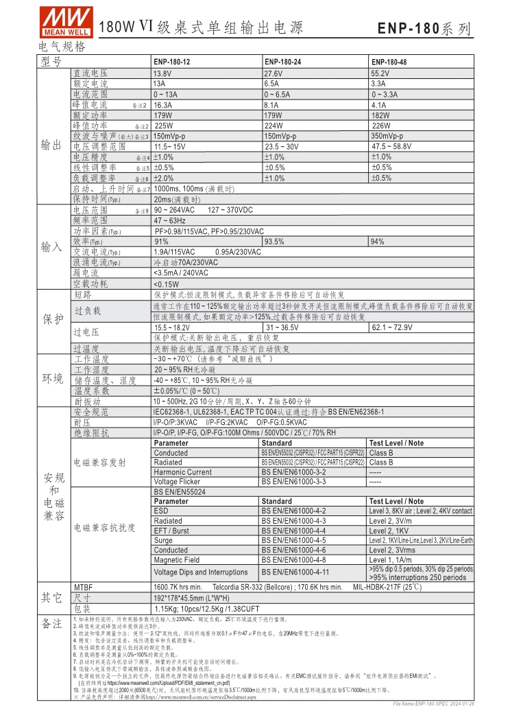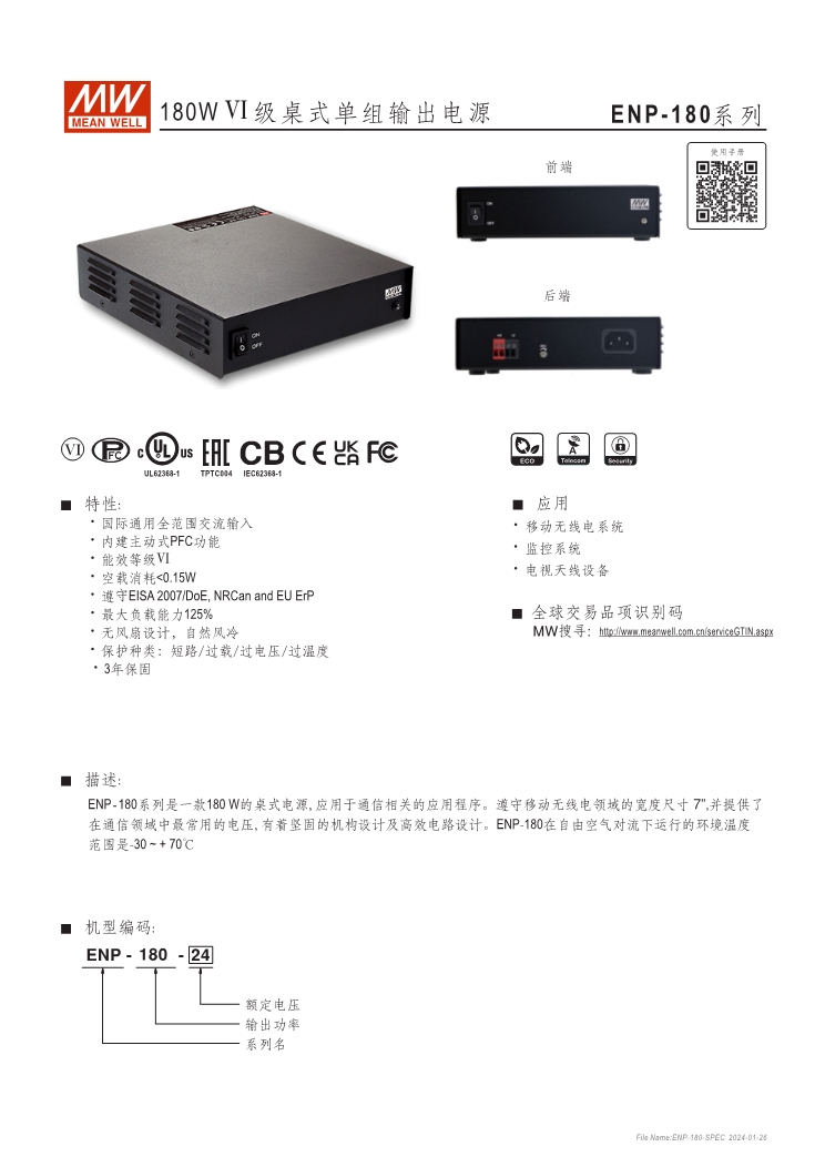 ENC:可編程充電器, ENP:Level VI電源供應器 可透過SBP-001編程器設定充電電壓、電流、停充時間 NTC溫度補償功能 (ENC系列) 無風扇設計、靜音 保護功能:短路、過壓、過溫度保護(ENC/ENP系列); 電池過低、過高、極性反接(僅ENC系列) 適用于鉛酸電池 3年保固