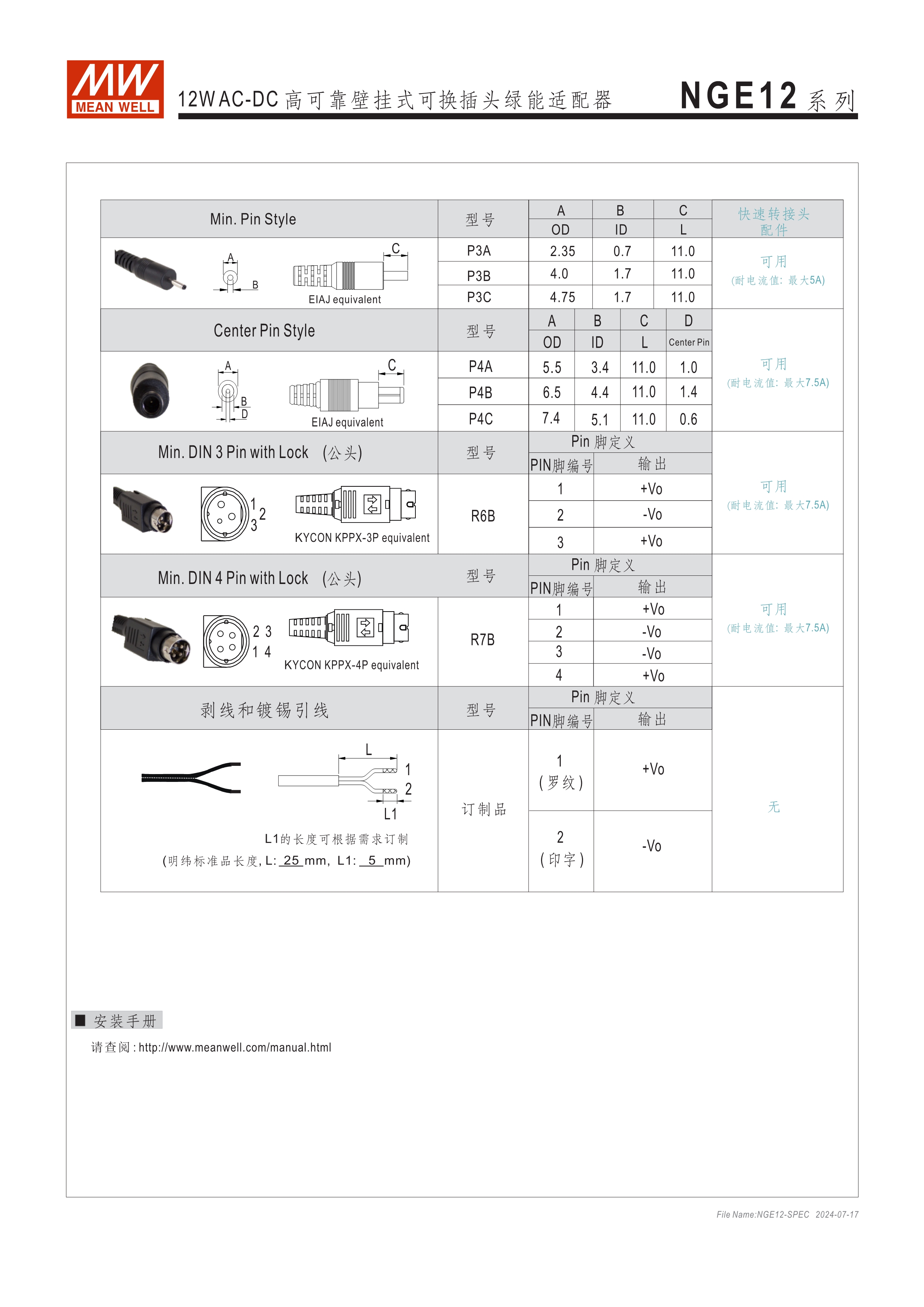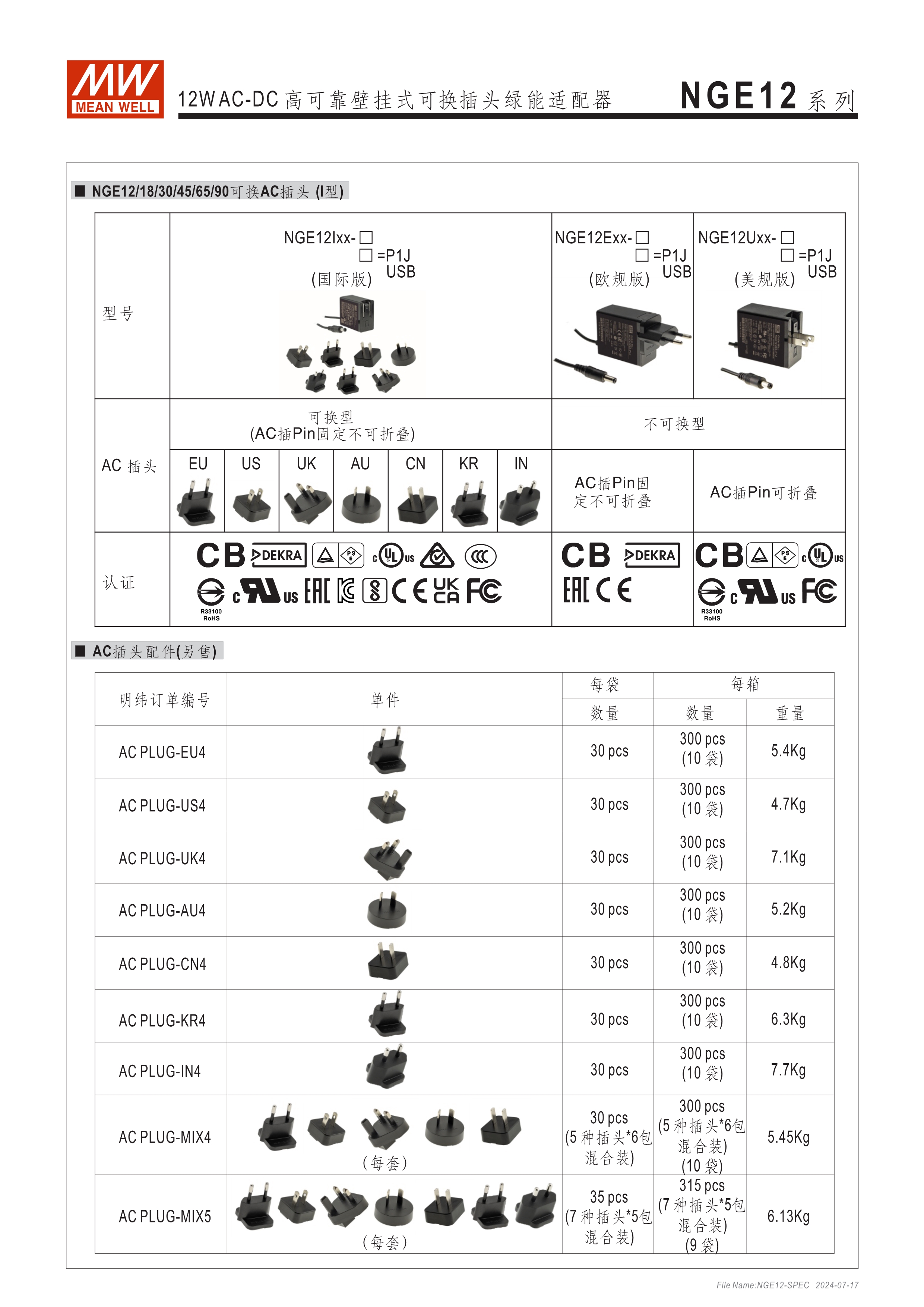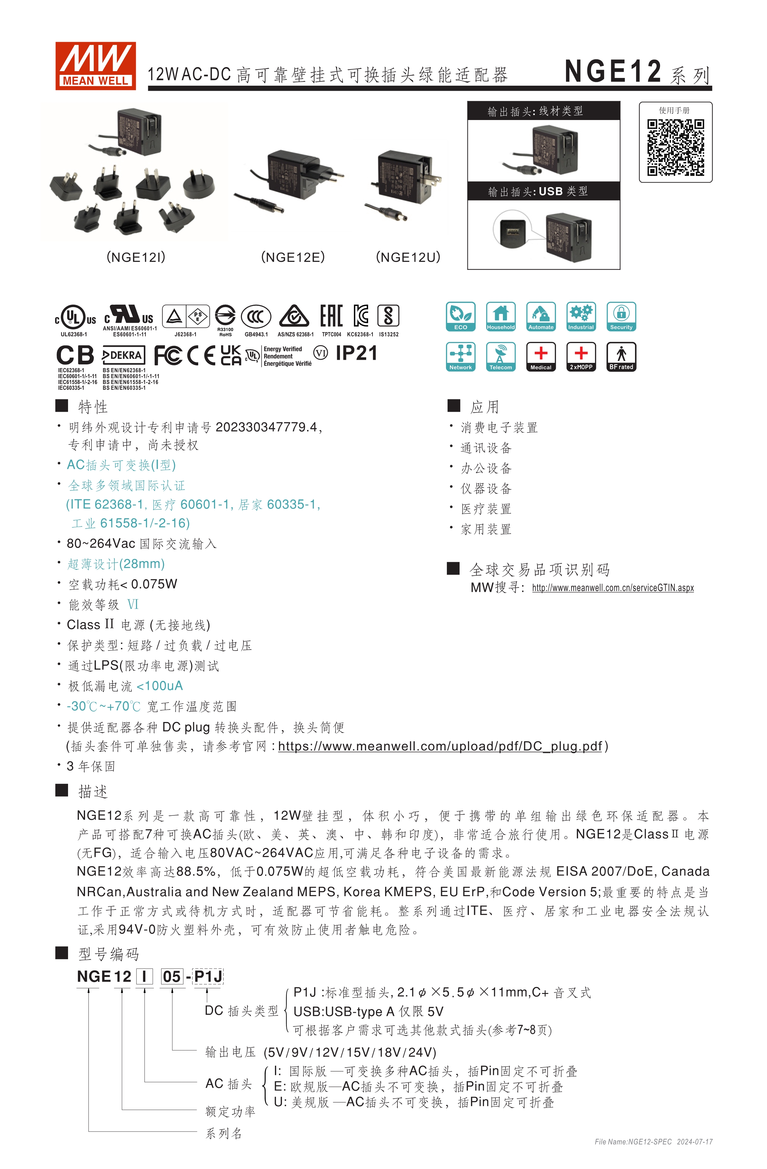 可換AC插頭 符合多領(lǐng)域全球認(rèn)證 (信息類 62368-1、醫(yī)療 60601-1, 家用 60335-1、工業(yè) 61558-1/-2-16) 全范圍AC輸入 2xMOPP, BF應(yīng)用 超窄面寬設(shè)計(jì)(28mm~30mm) 漏電流 <100uA 80~264V輸入 空載損耗<0.075W~0.1W 能效等級Level VII 保護(hù)功能:短路、過載、過電壓 漏電流 <100uA -30~70℃寬工作溫度 多種DC輸出轉(zhuǎn)接頭可更換 3年保固期