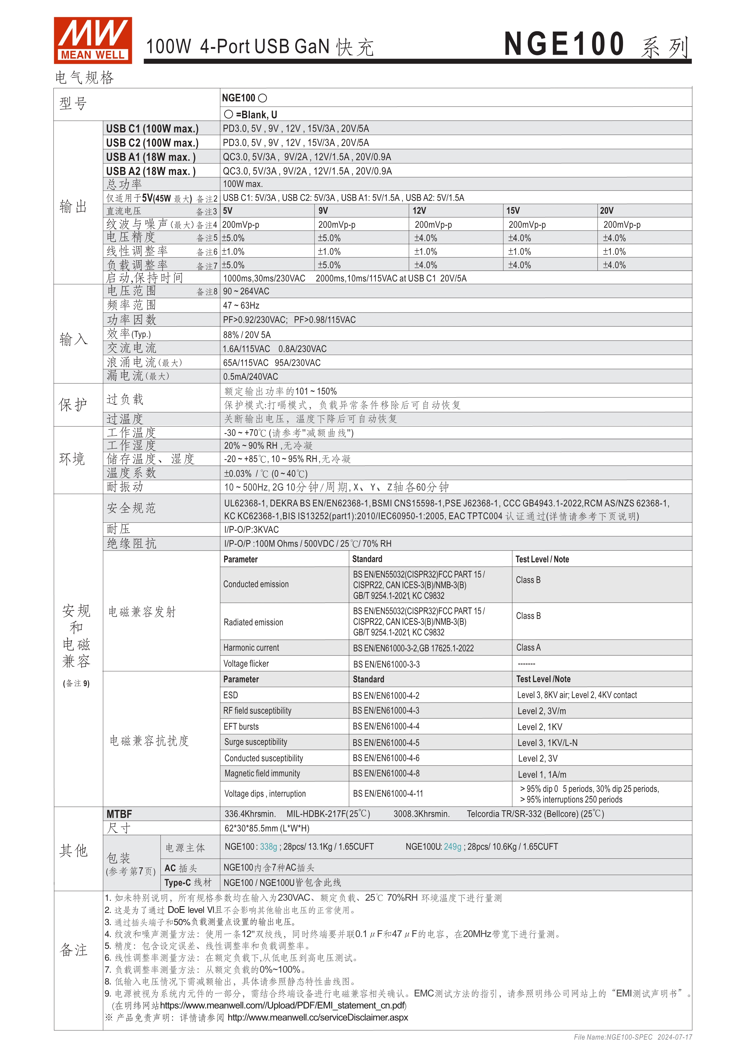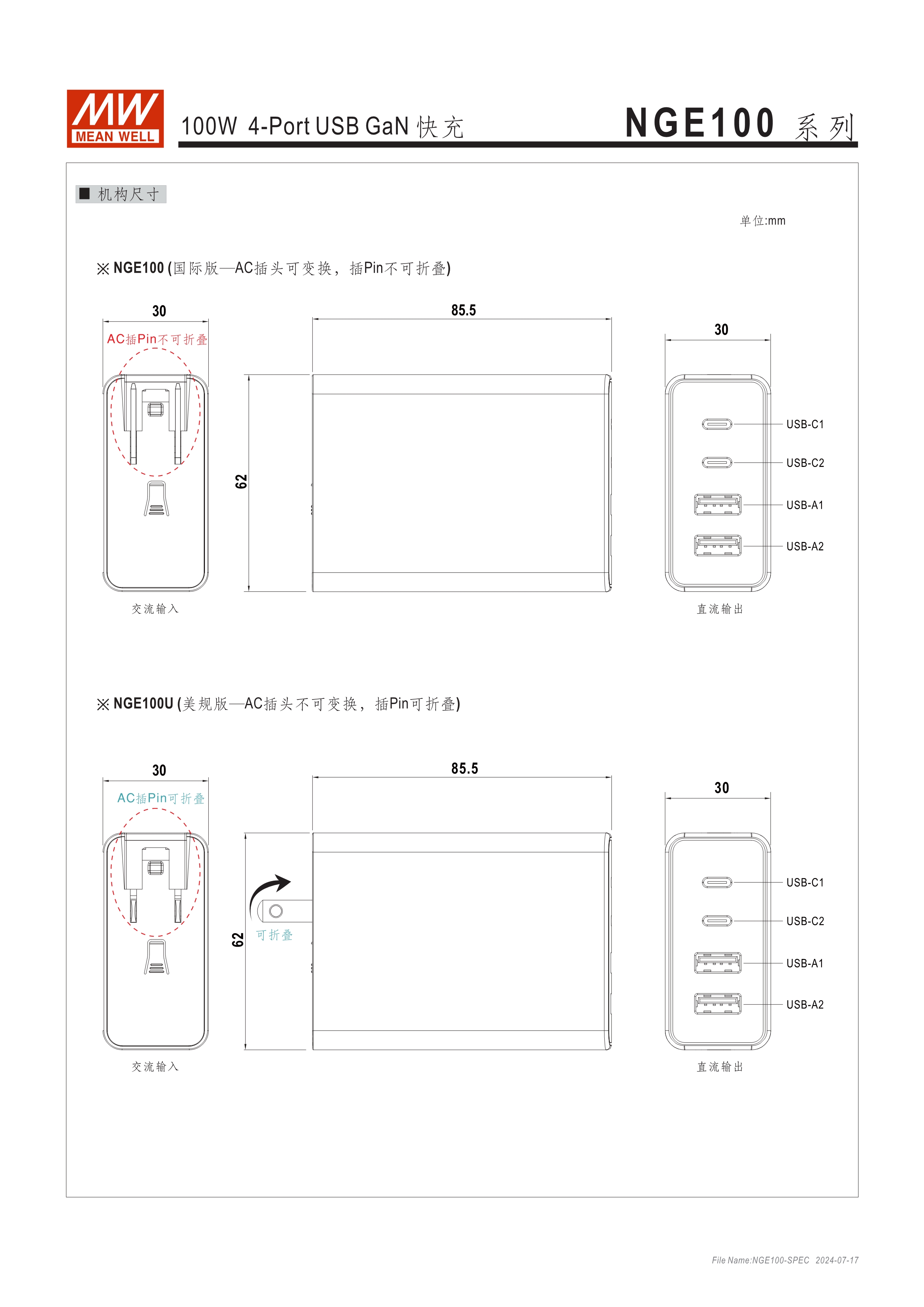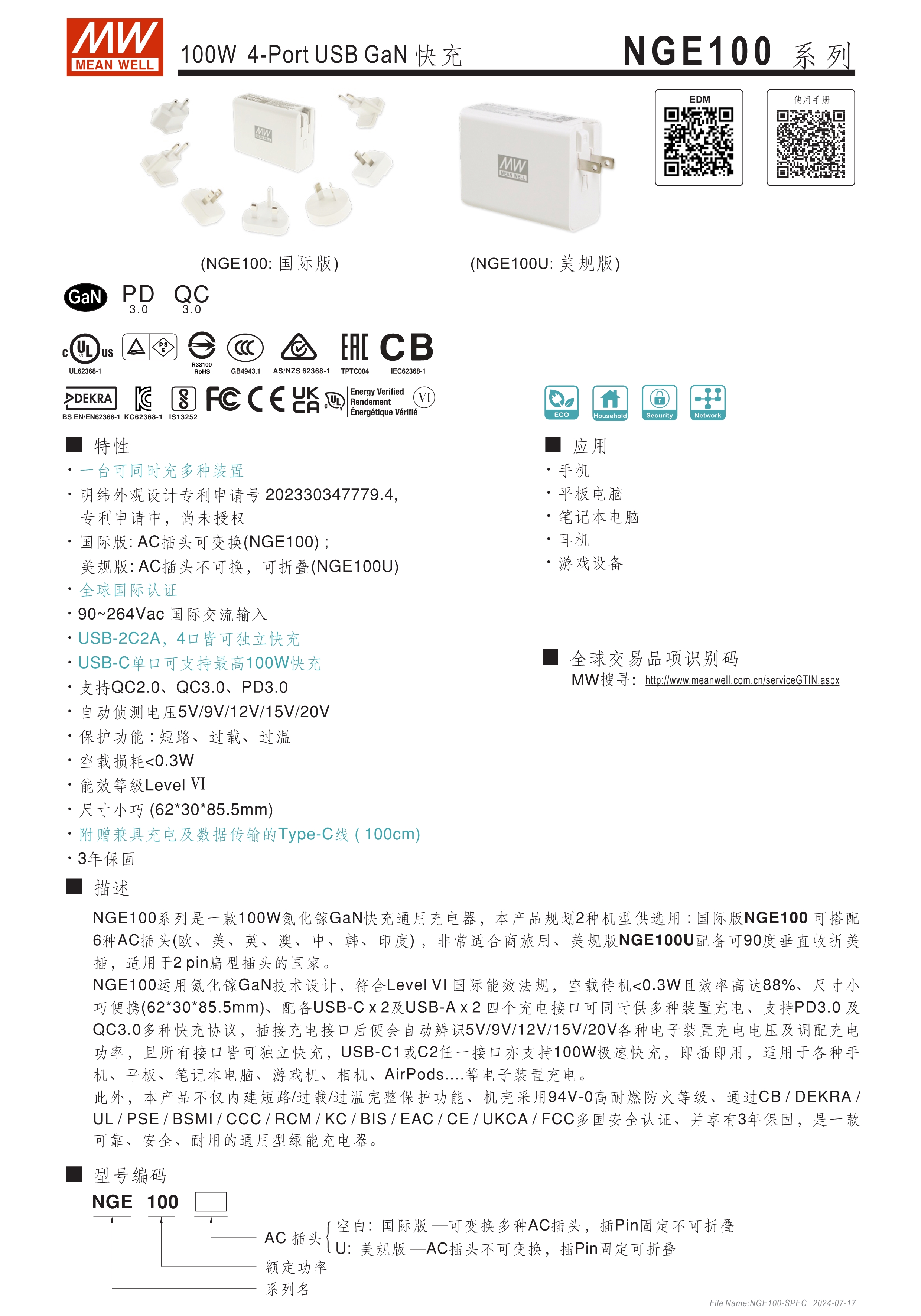 一臺可同時充多種裝置 國際版: AC插頭可變換(NGE100); 美規(guī)版: AC插頭不可換,可折疊(NGE100U) 全球國際認證 USB-2C2A,4-Port皆可獨立快充 USB-C單port可支援最高100W快充 支援QC2.0、QC3.0、PD3.0 自動偵測電壓:5V/ 9V/ 12V/ 15V/ 20V 保護功能 : 短路、過載、過溫 空載損耗<0.3W 能效等級Level VI 尺寸小巧 (62x 30x 85.5mm) 附贈兼具充電及資料傳輸的Type-C線 (100cm) 3年保固