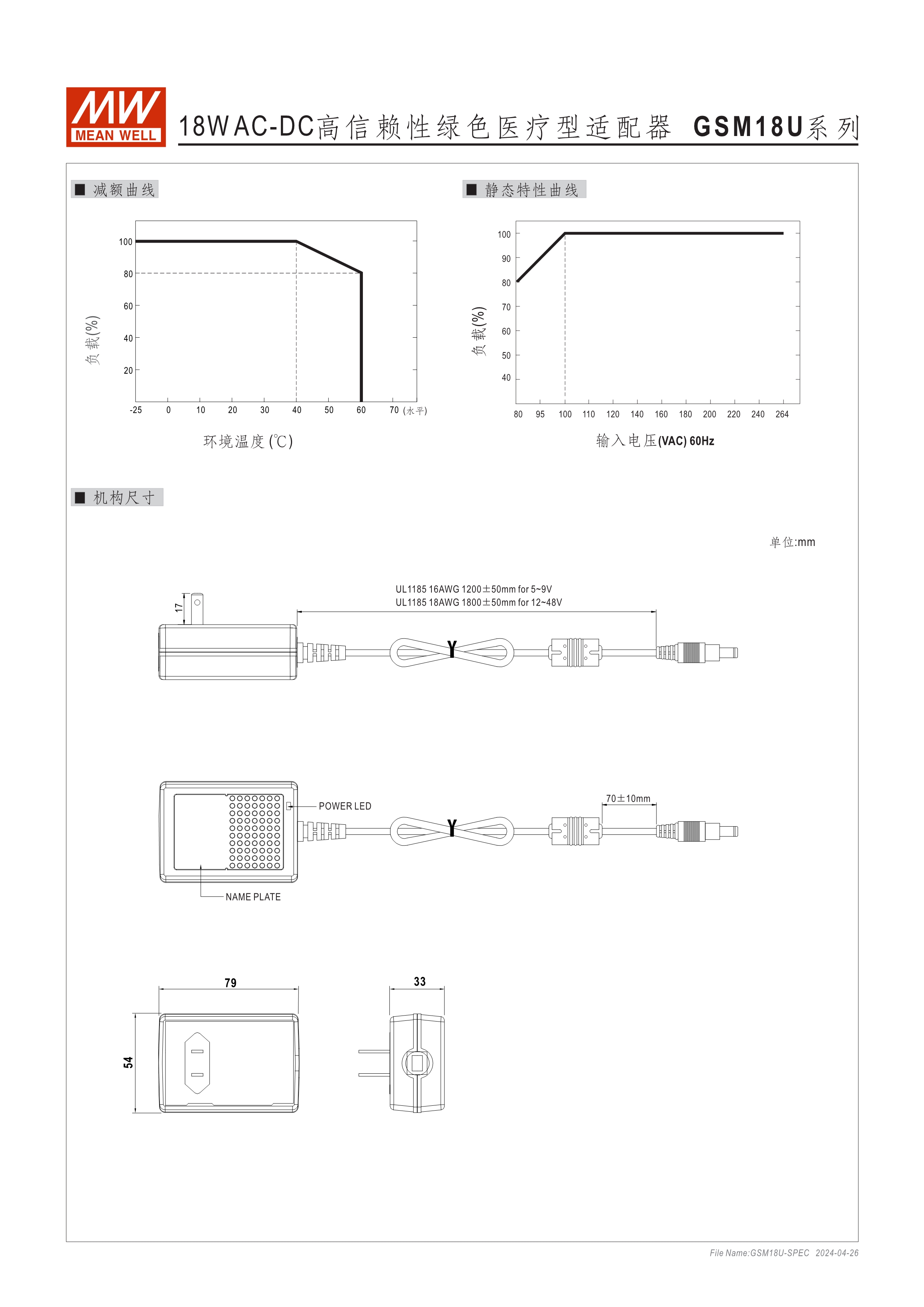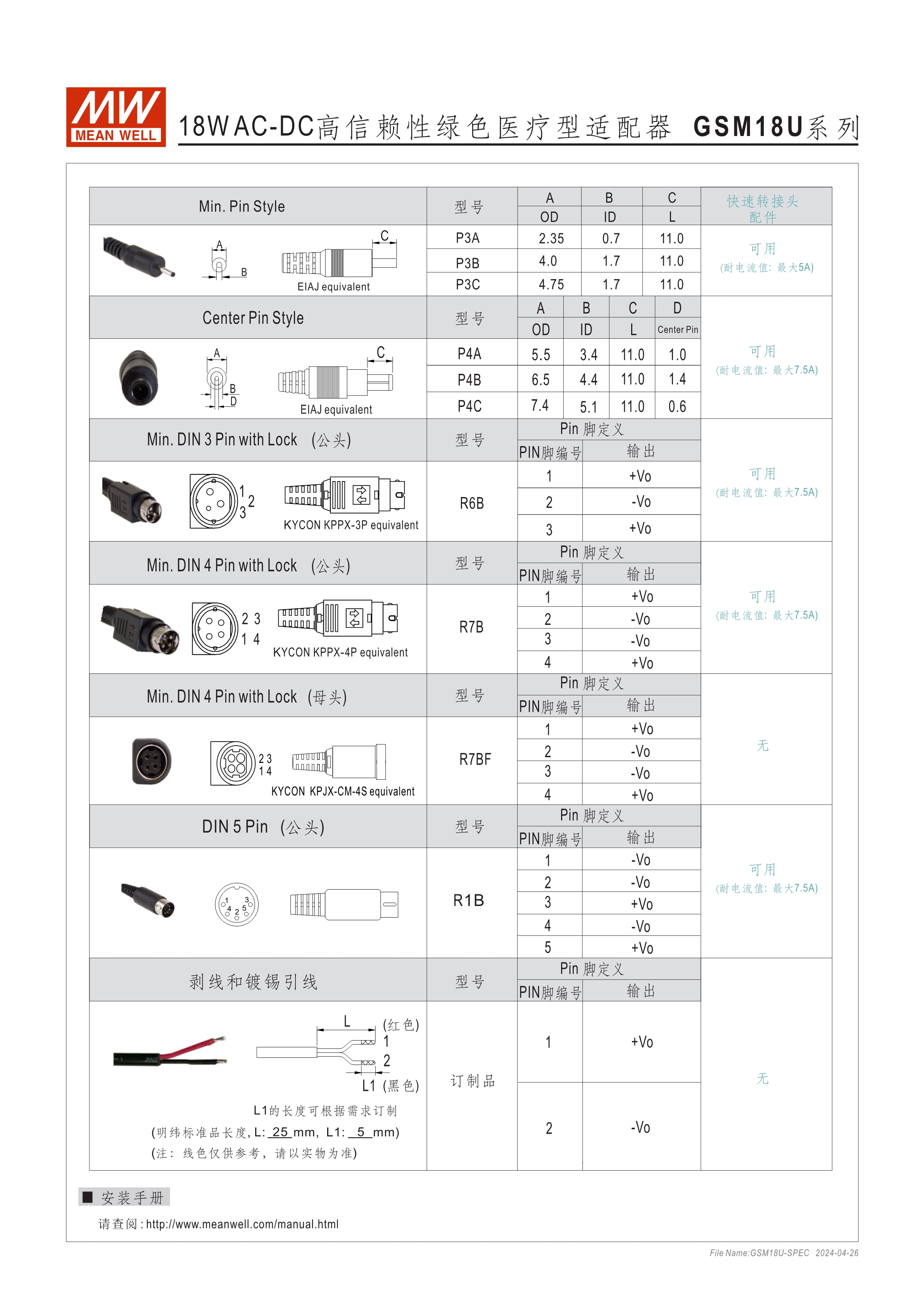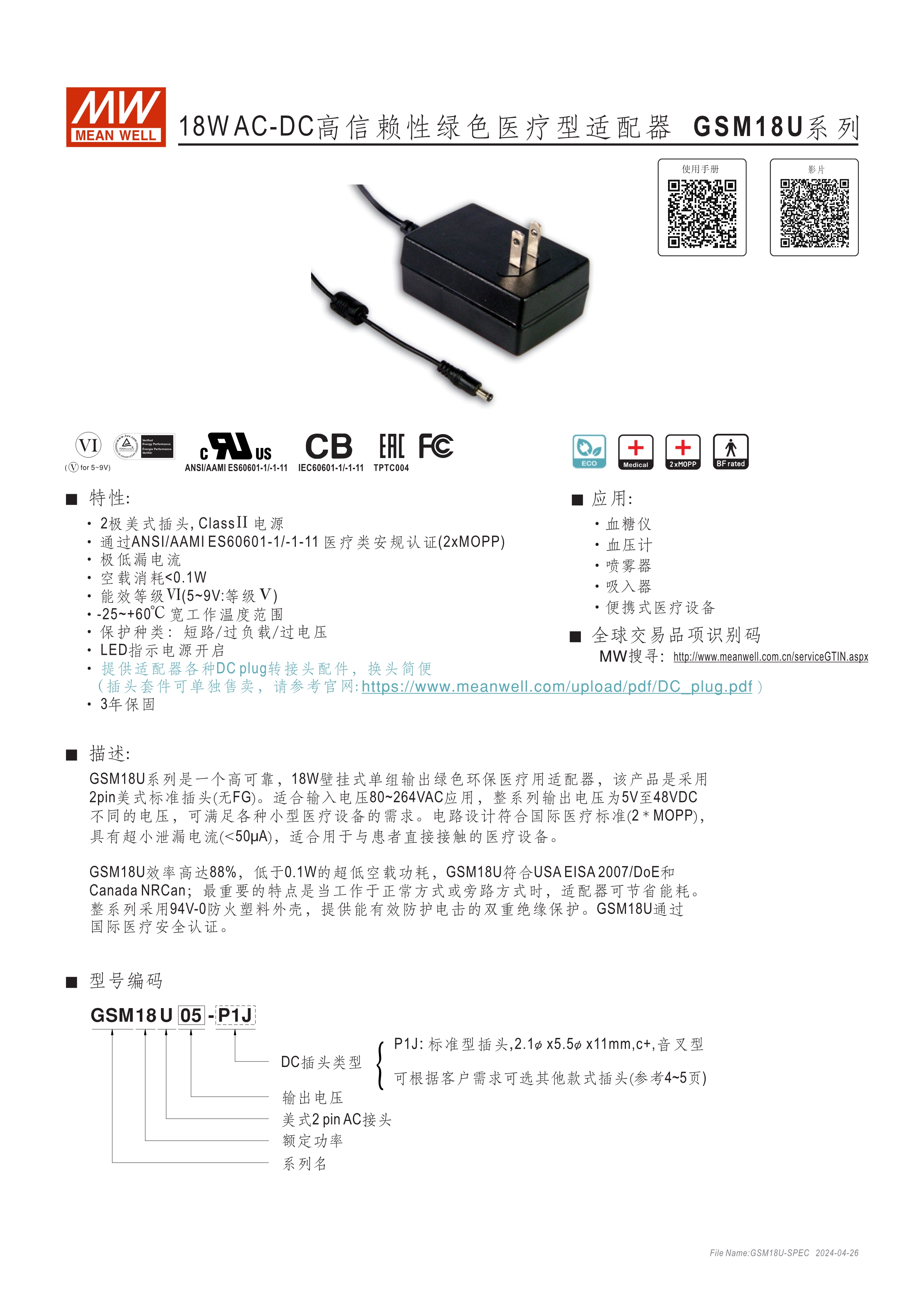 通過(guò)醫(yī)療60601-1/-11認(rèn)證(2xMOPP),BF 應(yīng)用 80~264Vac輸入 空載損耗<0.075W~0.3W 能效等級(jí)Level VI(GSM06/12和GSM18/25/36 5~9V為L(zhǎng)evel V) 2極美插(U型)/ 歐插(E型) 極端漏電流<50~100uA(依型號(hào)) 多種DC輸出轉(zhuǎn)接頭可更換 3年保固