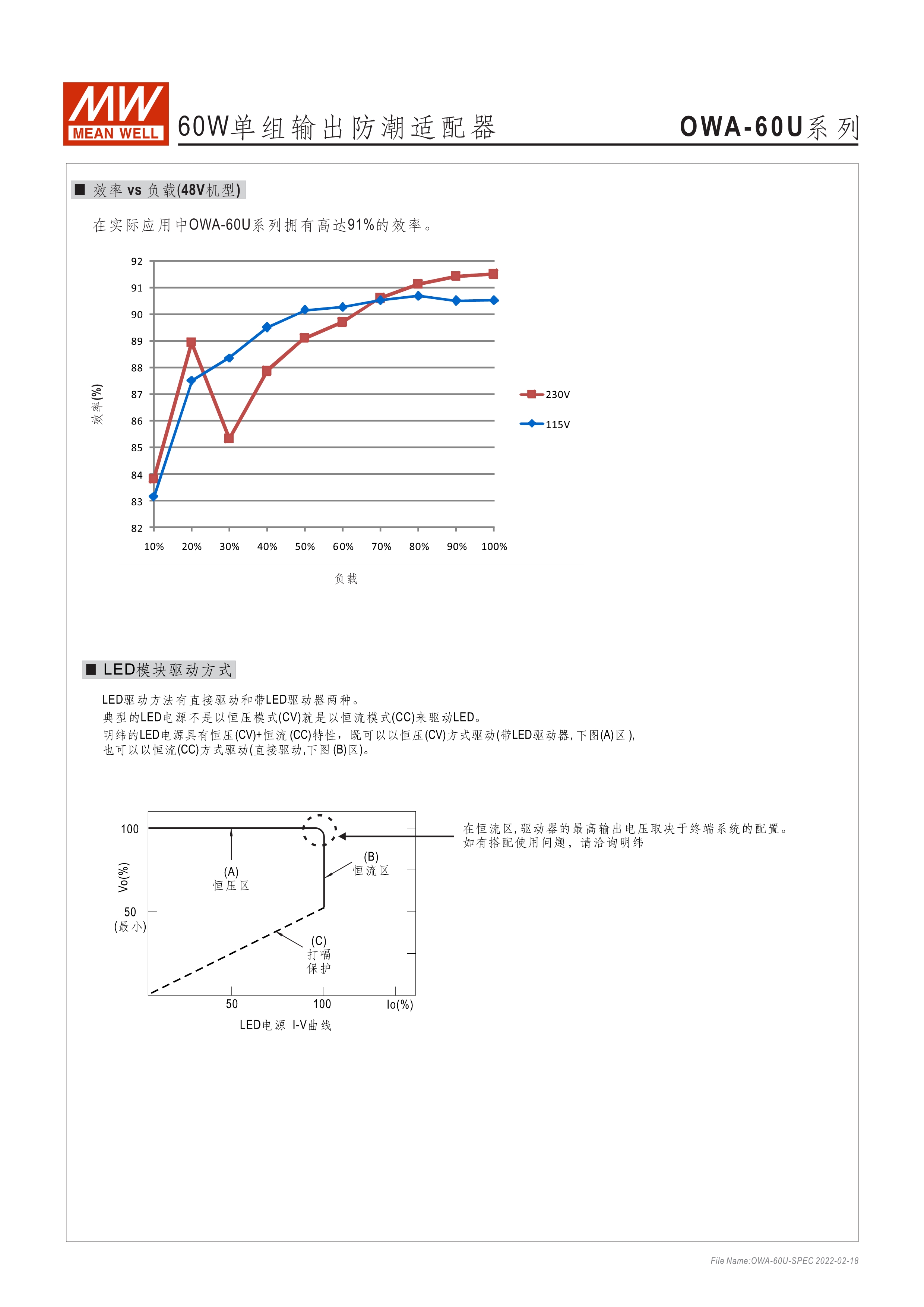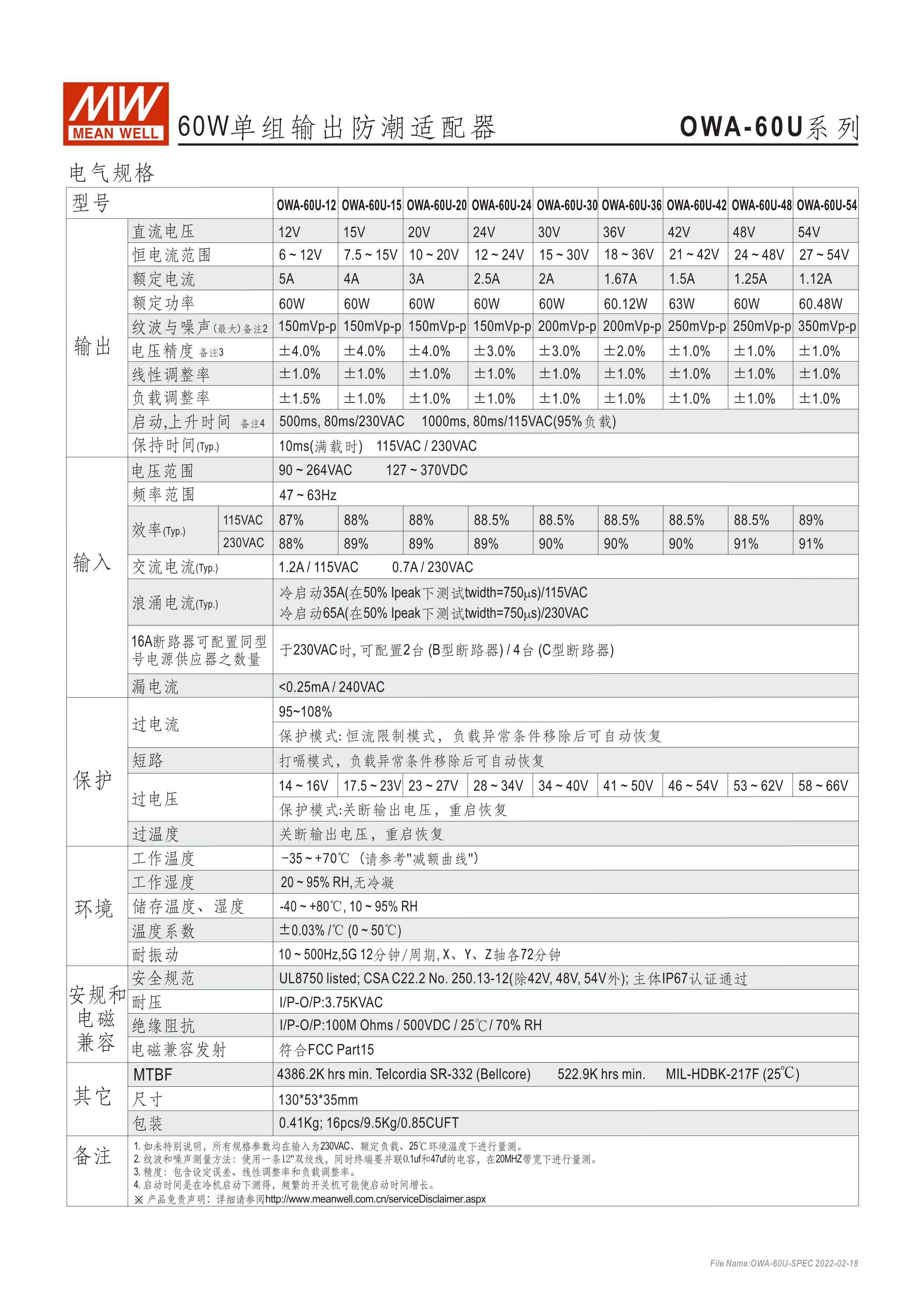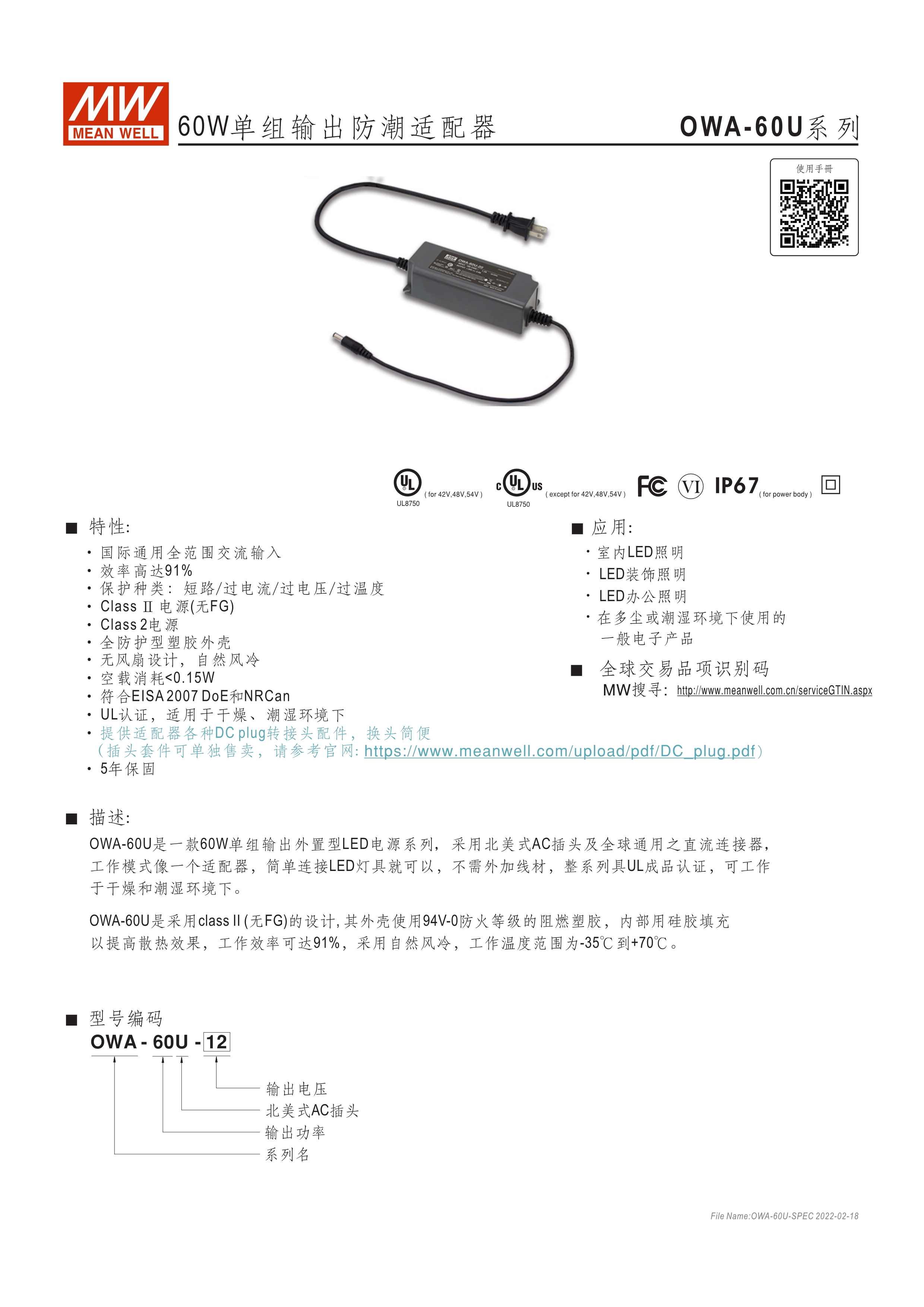 電源主體達IP67防護等級 90~264VAC交流輸入(OWA-120E為180~264VAC交流輸入) 空載損耗<0.15W 能效等級Level VI E型: 符合EU ErP 及 CoC Version 5 (OWA-120E 僅符合EU ErP) U型: 符合EISA 2007/DoE 及 NRCan Class II電源 (無FG) U型:2極美插,E型:2極歐插 多種DC輸出轉(zhuǎn)接頭可更換 5年保固期