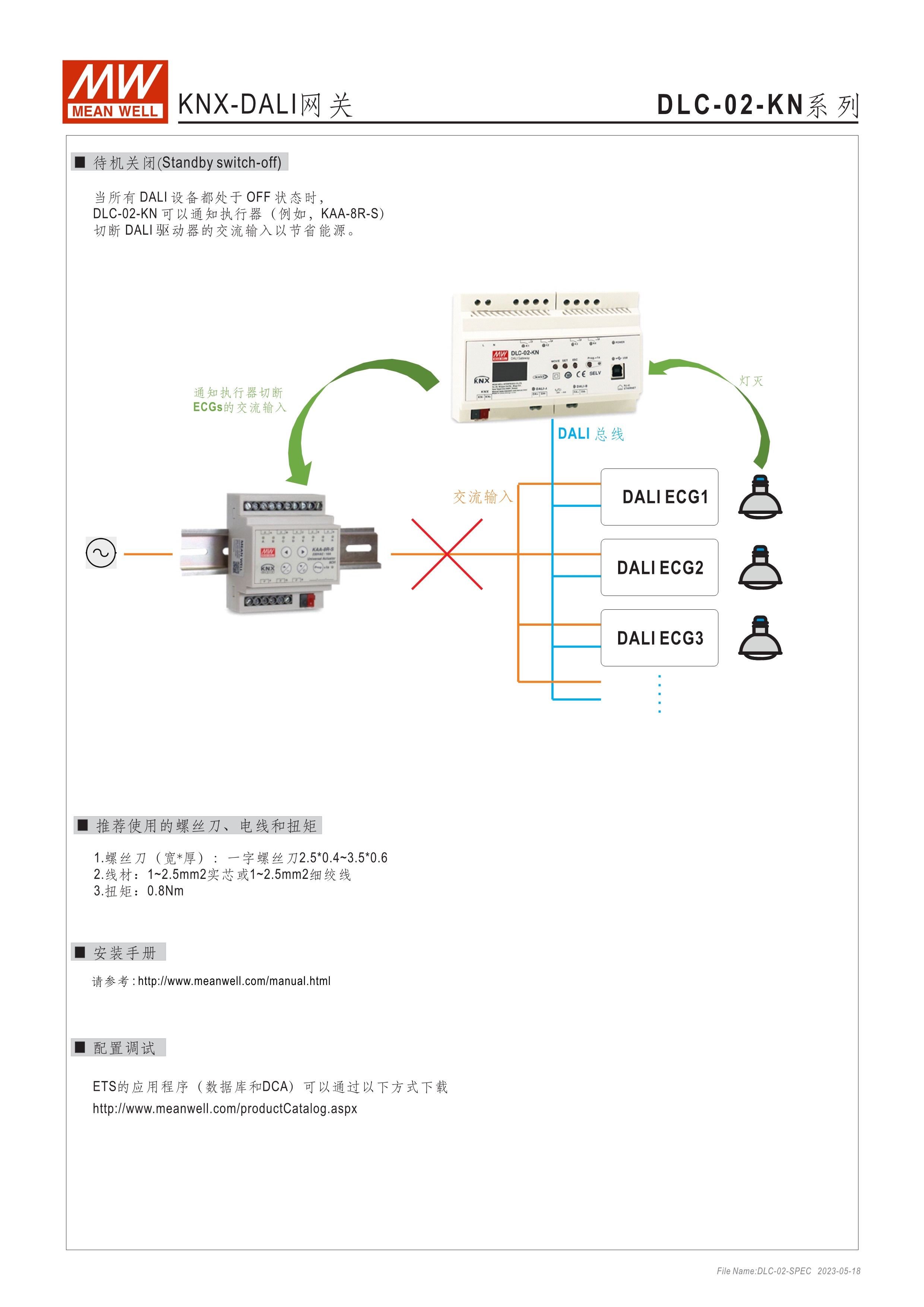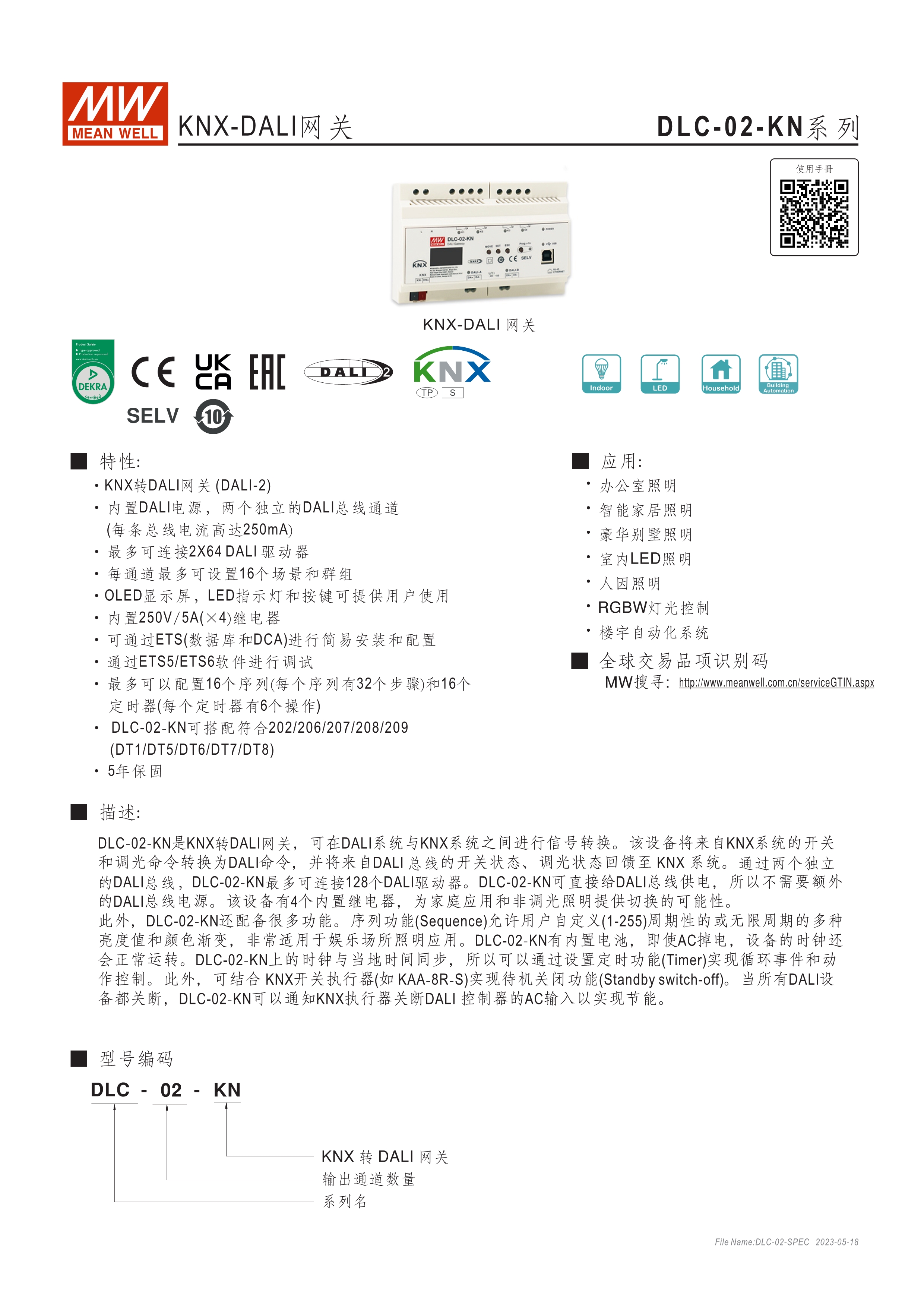 符合IEC 62386 DALI-2,Part 101/103/207/208標準 2組獨立DALI總線,可接Control Gear及Control Device搭配使用 4路可控繼電器,接觸容量5A,可當電器開關(guān)或兩組電動窗簾使用 可搭配DLC軟體做現(xiàn)場系統(tǒng)設(shè)定,或透過網(wǎng)路線從遠端做修改設(shè)定 透過本體液晶顯示螢?zāi)患安倏匕粹o,可做簡單設(shè)定和狀態(tài)查詢 內(nèi)建Timer晶片,可搭配DLC軟體做行程控制設(shè)定 通訊介面接口:RJ-45及KNX,可與其他樓宇自動化系統(tǒng)做連線擴充使用 采導軌式設(shè)計,體積小巧僅8SU寬度(144x 90x 58.4mm)