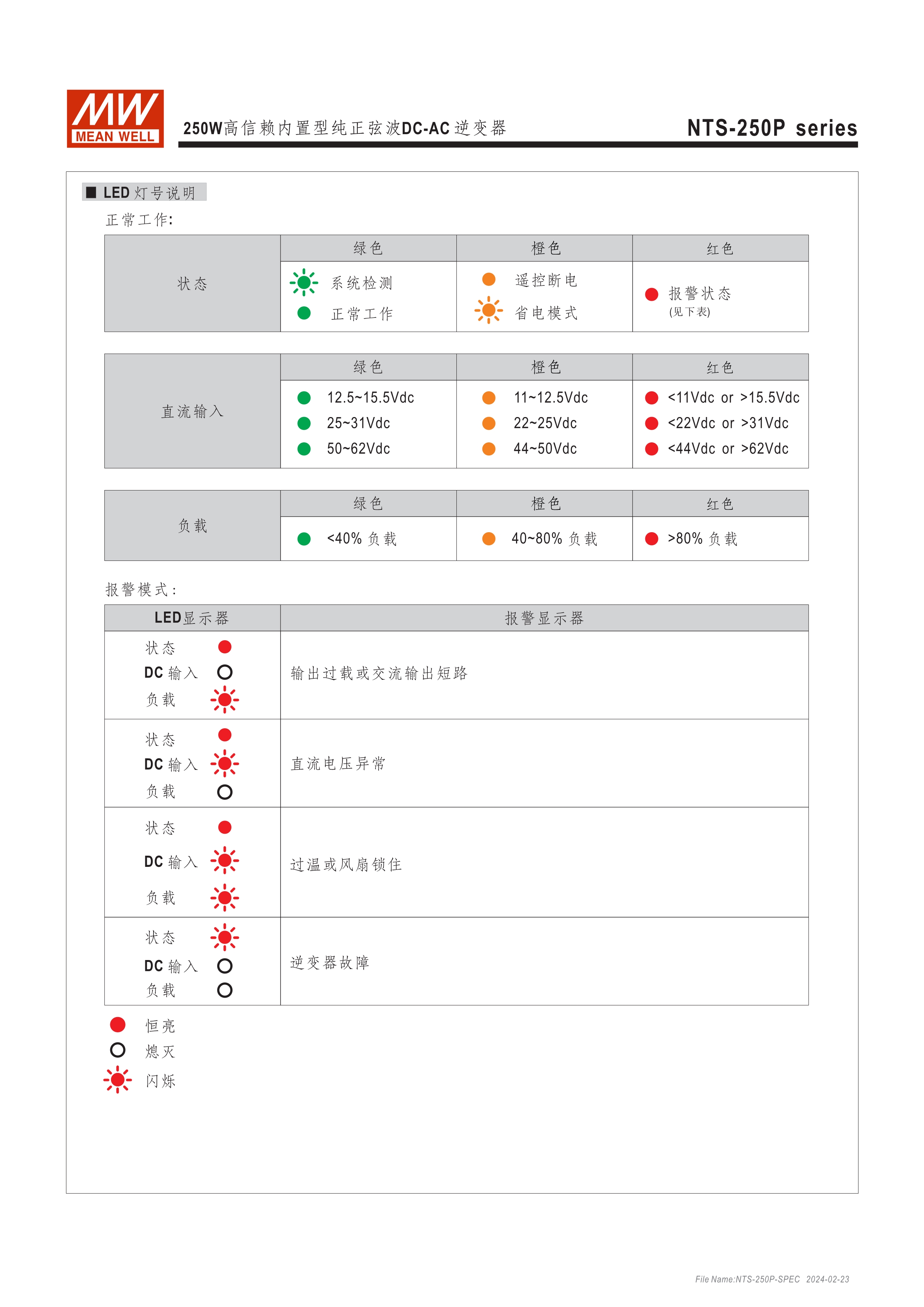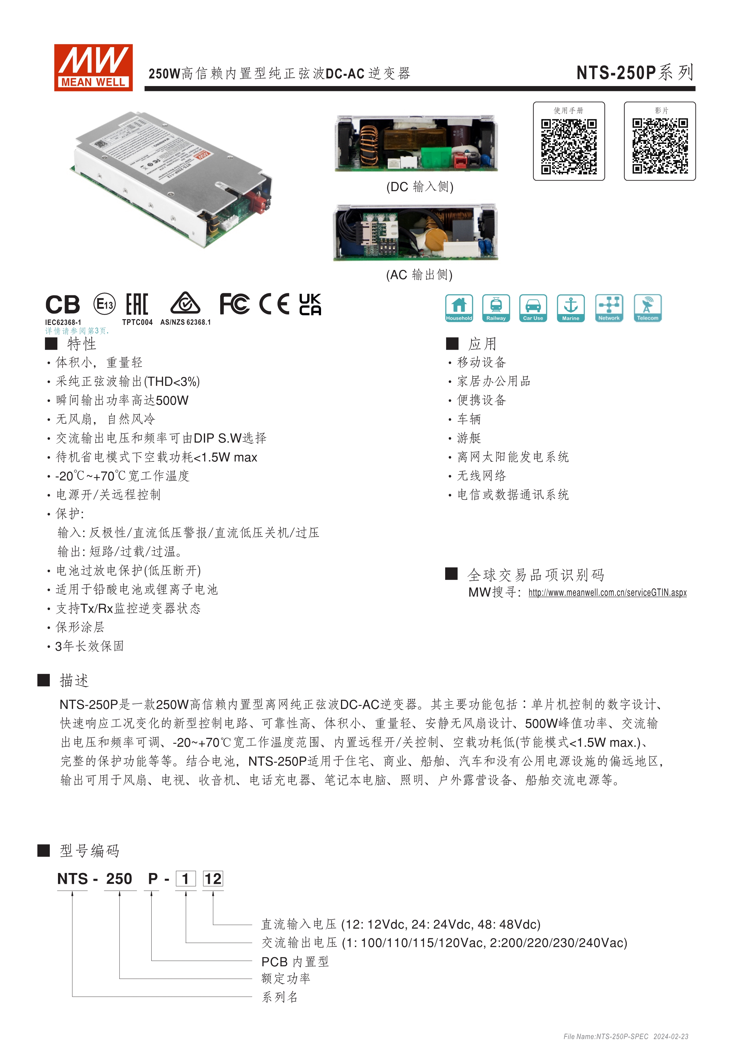 DC-AC純正弦波輸出 (THD<3%) 無風(fēng)扇設(shè)計(jì),效率最高達(dá)93%,可自然風(fēng)冷散熱 瞬間峰值功率達(dá)雙倍輸出 內(nèi)建DIP S.W可彈性自調(diào)AC輸出電壓、頻率、節(jié)能模式 多重智能保護(hù)功能: DC輸入側(cè) - 極性反接、電壓過低、電壓過高保護(hù) AC輸出側(cè) - 短路、超載、過熱保護(hù)