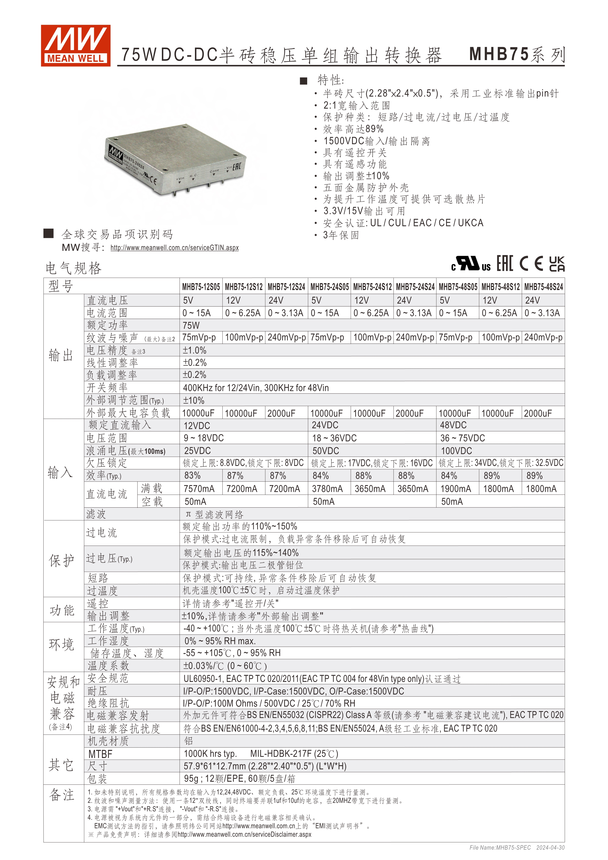 模塊型快選表 2.28” x 2.4” x 0.5”半磚尺寸 DIP封裝 2:1 寬輸入范圍 1.5KVDC 輸入/輸出隔離 內建遙控及遙感功能 可2.5V / 3.3V / 15V 輸出 可選購散熱片