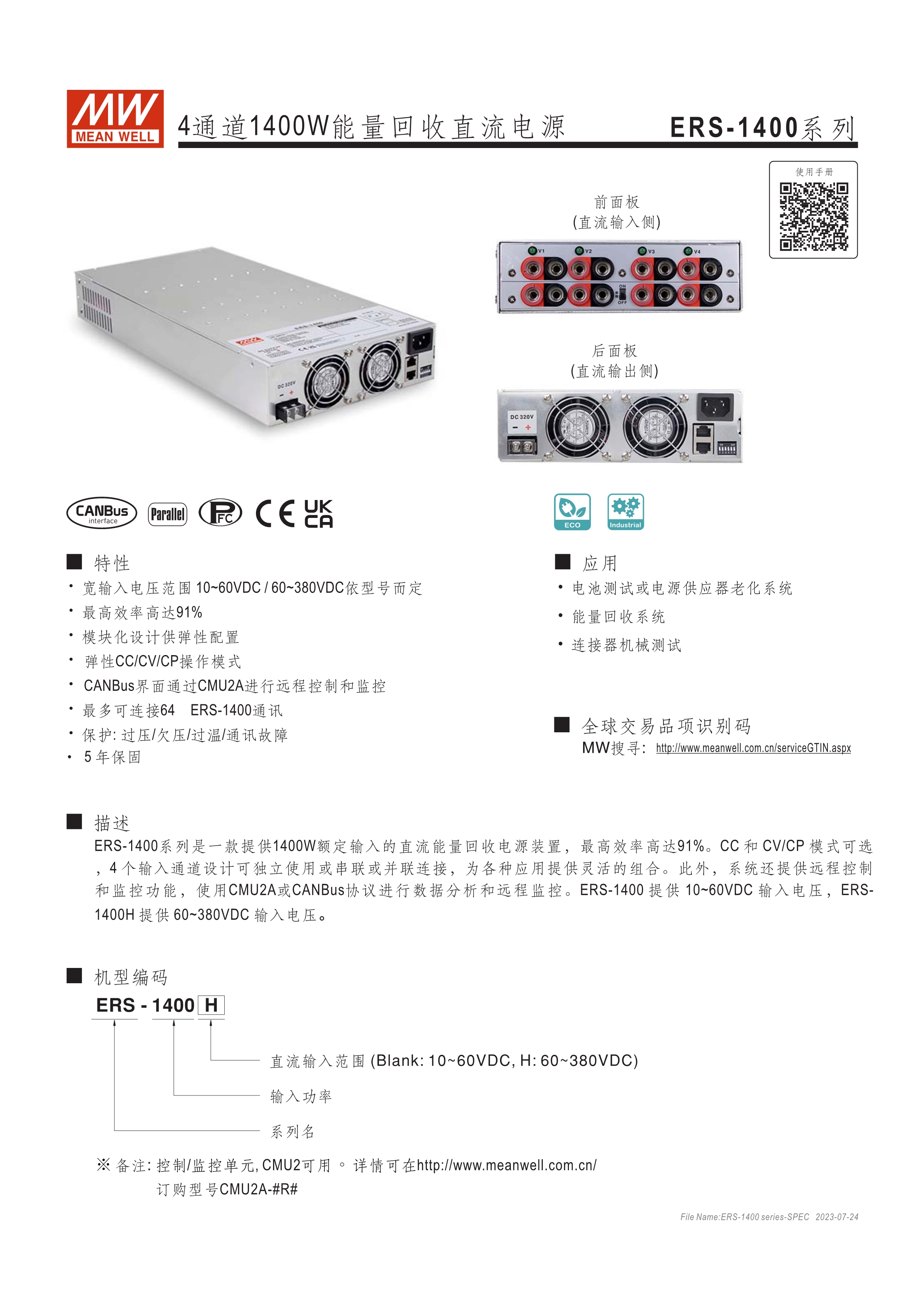 寬輸入電壓范圍10~60VDC/60~380VDC(視機型而定) 效率高達91% 靈活配置的模塊化設(shè)計 彈性的CC/CV/CP操作模式 通過CMU2A實現(xiàn)CAN總線協(xié)議遠程控制和監(jiān)控控制 可連接最多64臺ERS-1400系列 保護功能: 過電壓、欠電壓、過熱、通信錯誤 3年保固期