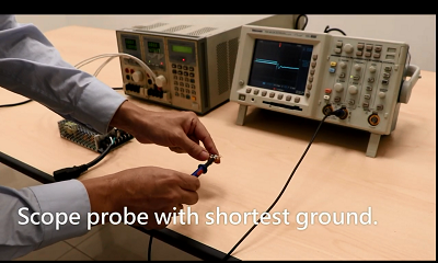 在S.P.S.漣波噪聲中含有2 種成分,一是交流輸入電壓的倍頻頻率,另一為S.P.S.本身的切換頻率。由于是高頻噪聲,在量測時,示波器帶寬應設在20MHz,且探棒應以最短距離來量測;并在待測端加一小電容(0.1uF)來濾除噪聲干擾,如下圖所示。