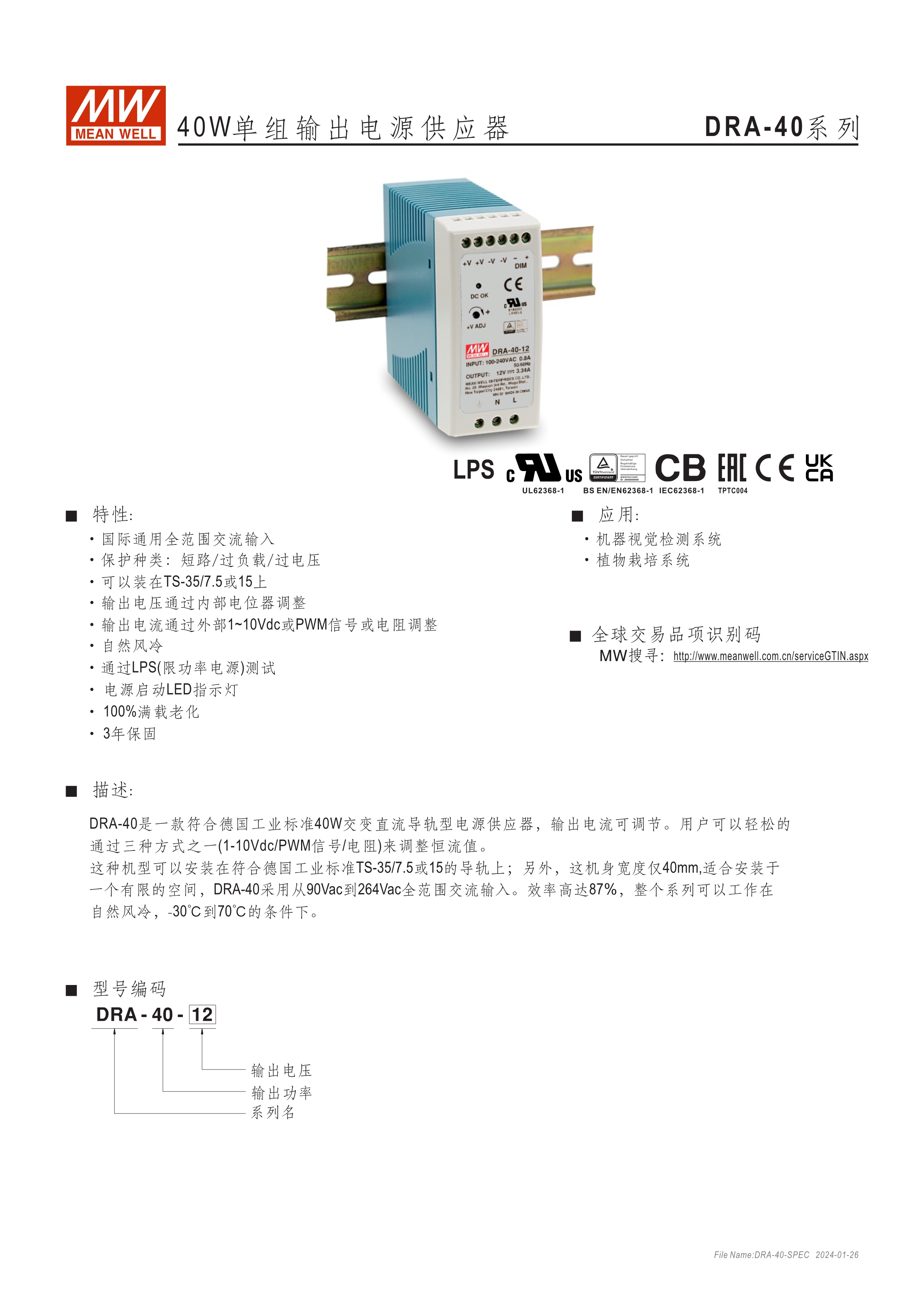 塑料機(jī)殼 單相,全范圍輸入 輸出電流可透過(guò)1~10VDC, PWM信號(hào)或電阻調(diào)設(shè)于原額定值的 10~100% 適合安裝于DIN Rail TS-35 / 7.5或15 適合于視覺(jué)檢測(cè)設(shè)備及植物栽培系統(tǒng)