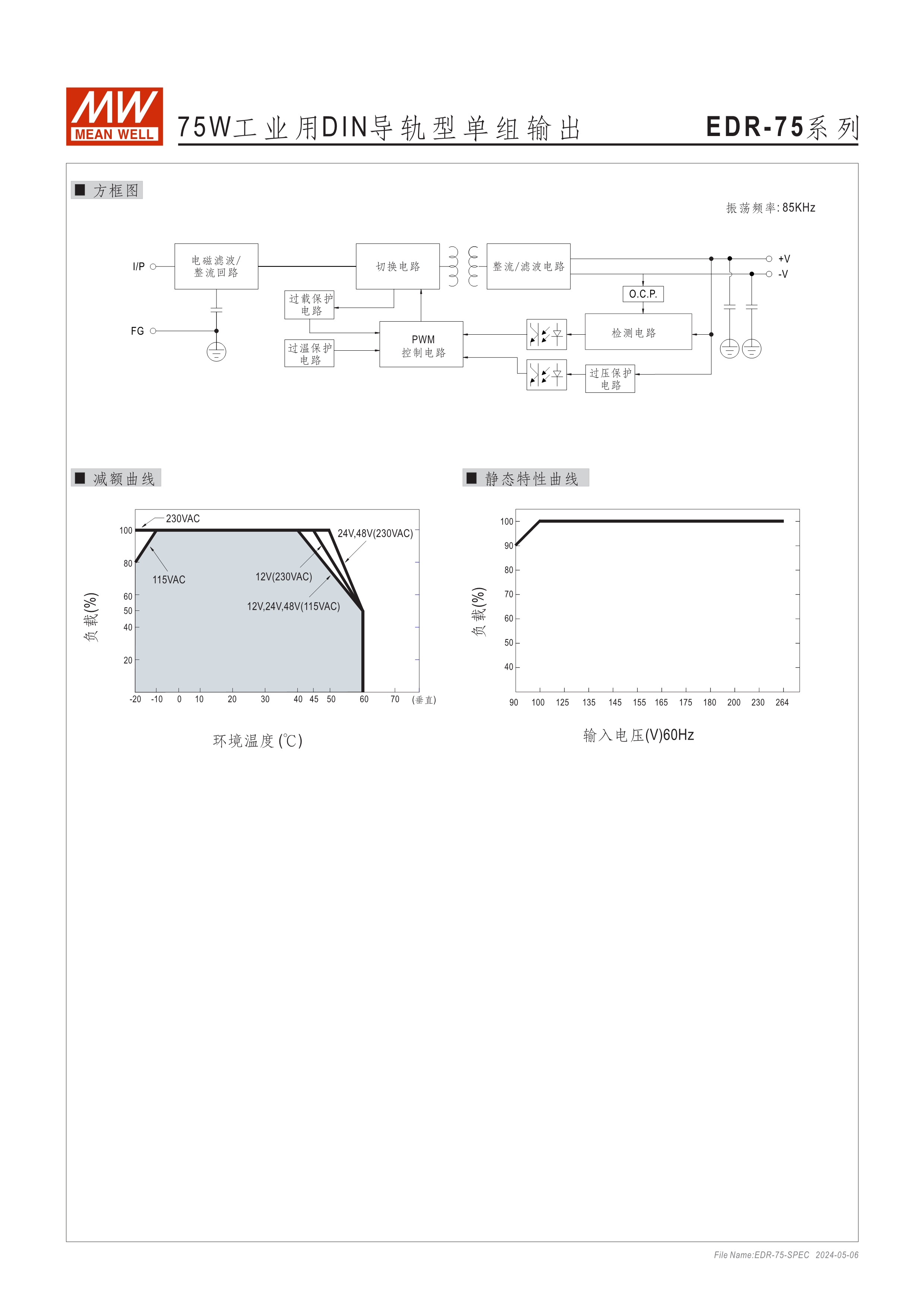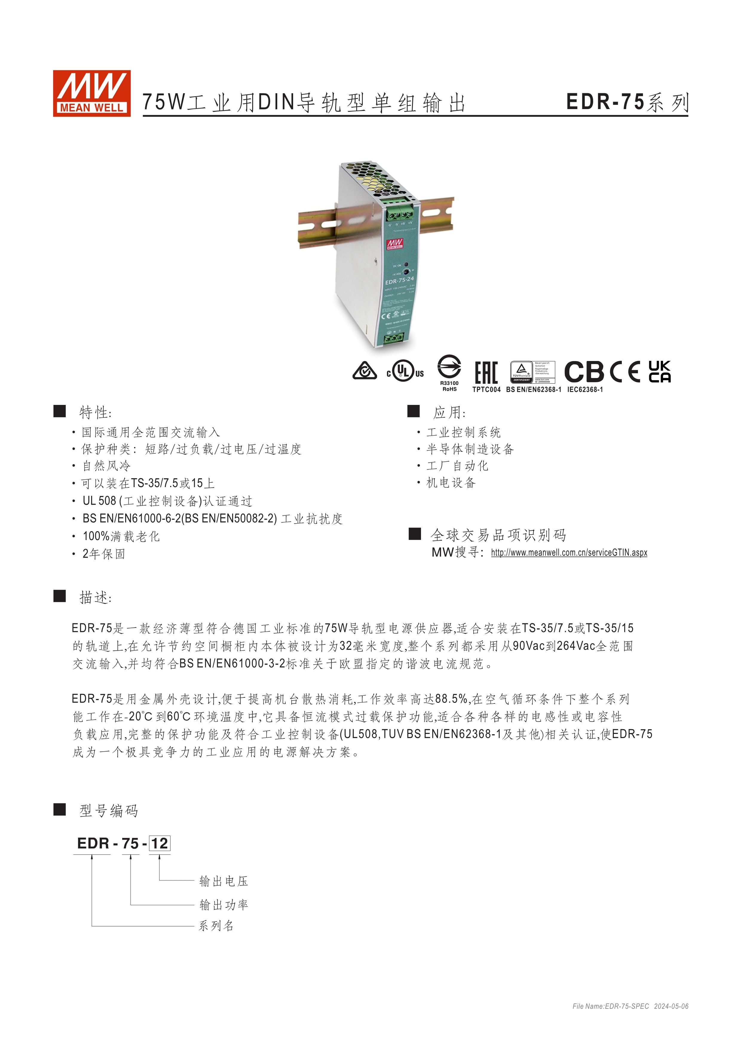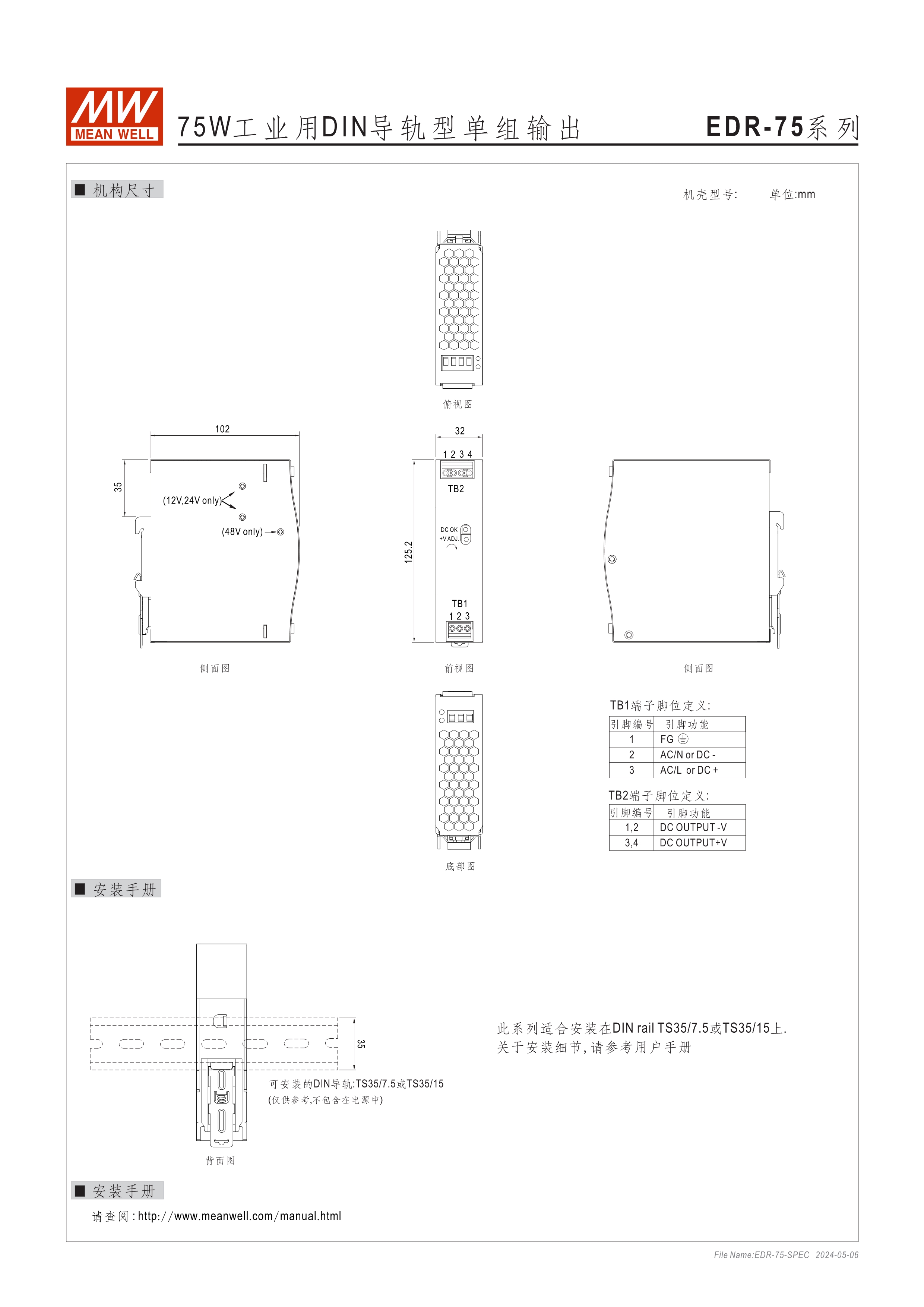 金屬殼,低價款 單相, 全范圍輸入 窄面寬設(shè)計:32~40mm EMC EN55022 class A 適合安裝于DIN rail TS-35 / 7.5或15 2年保固期