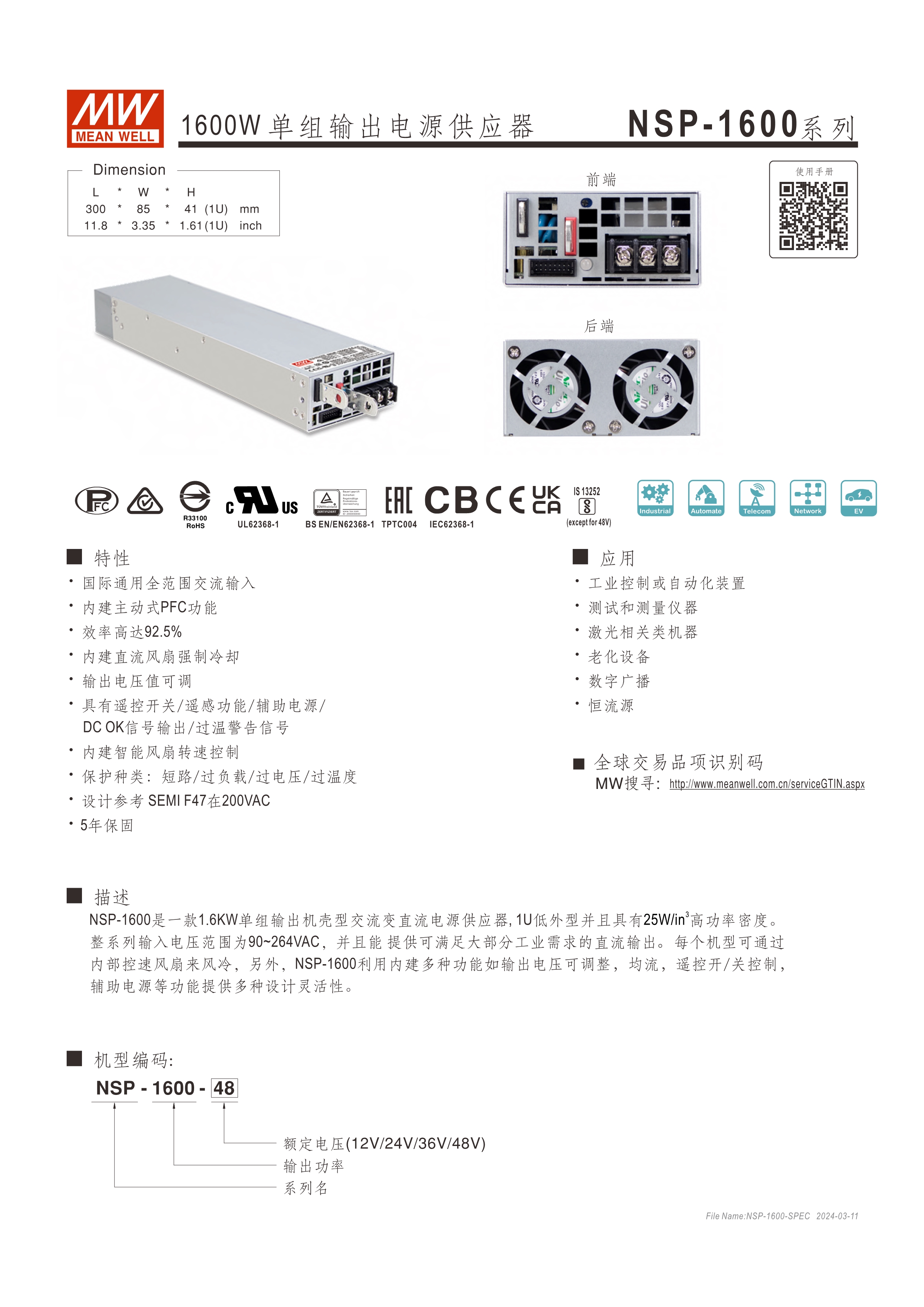 電氣規(guī)格及安規(guī)認證皆參照RSP或DPU系列,客戶可直接選用取代,立即導入使用 環(huán)境友善制程與用料 全范圍電壓輸入 效率最高可達94.5% 內(nèi)建PV功能 設計符合SEMI F47 @200Vac