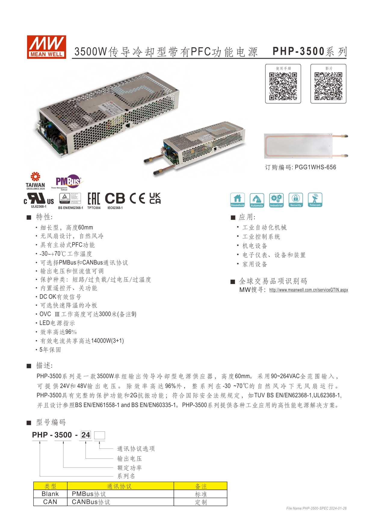水冷散熱設計 可程序化輸出功能: 輸出電壓與輸出電流恒流點可調(diào)整 支持PMBus通訊協(xié)議 (可選配CANBus協(xié)議) 支持輸出并聯(lián)功能 HV款式為高壓輸出機型 主動式均流設計,系統(tǒng)電力高可達14000W (3+1) 可選購水冷板,ordering no.: HS-656