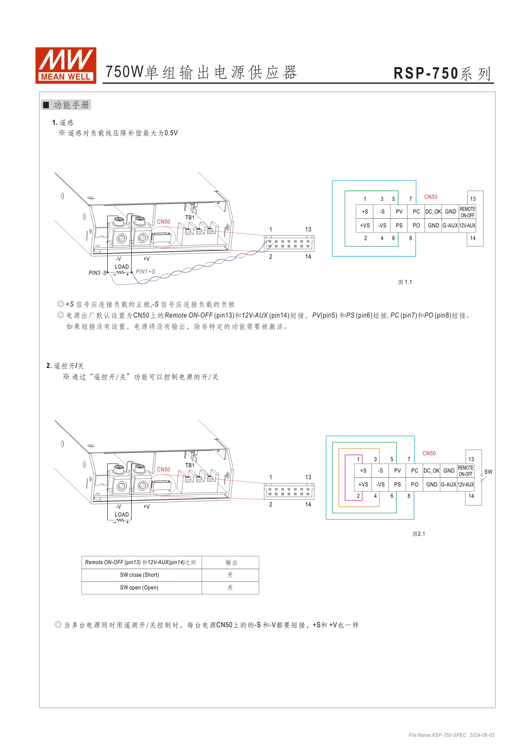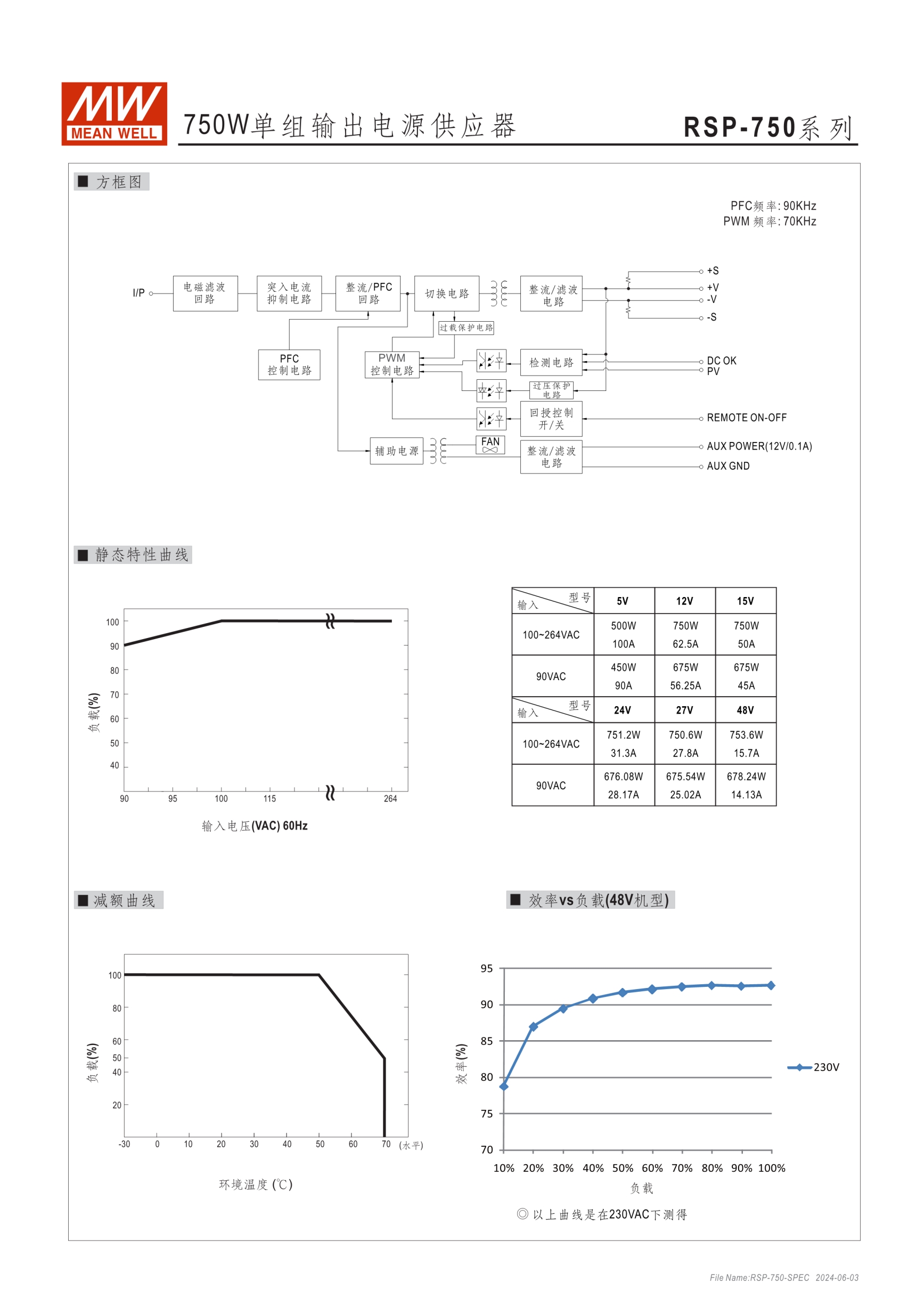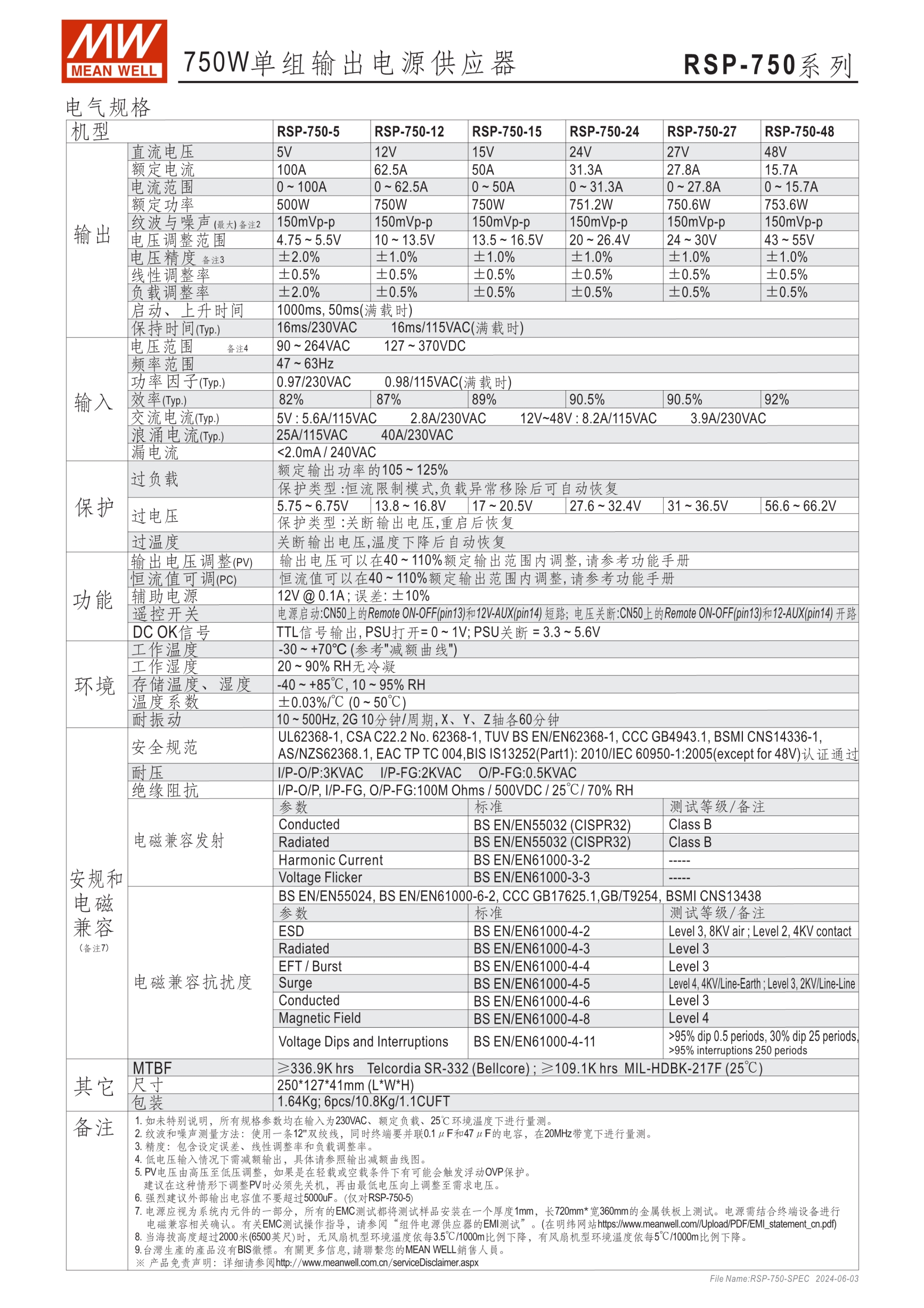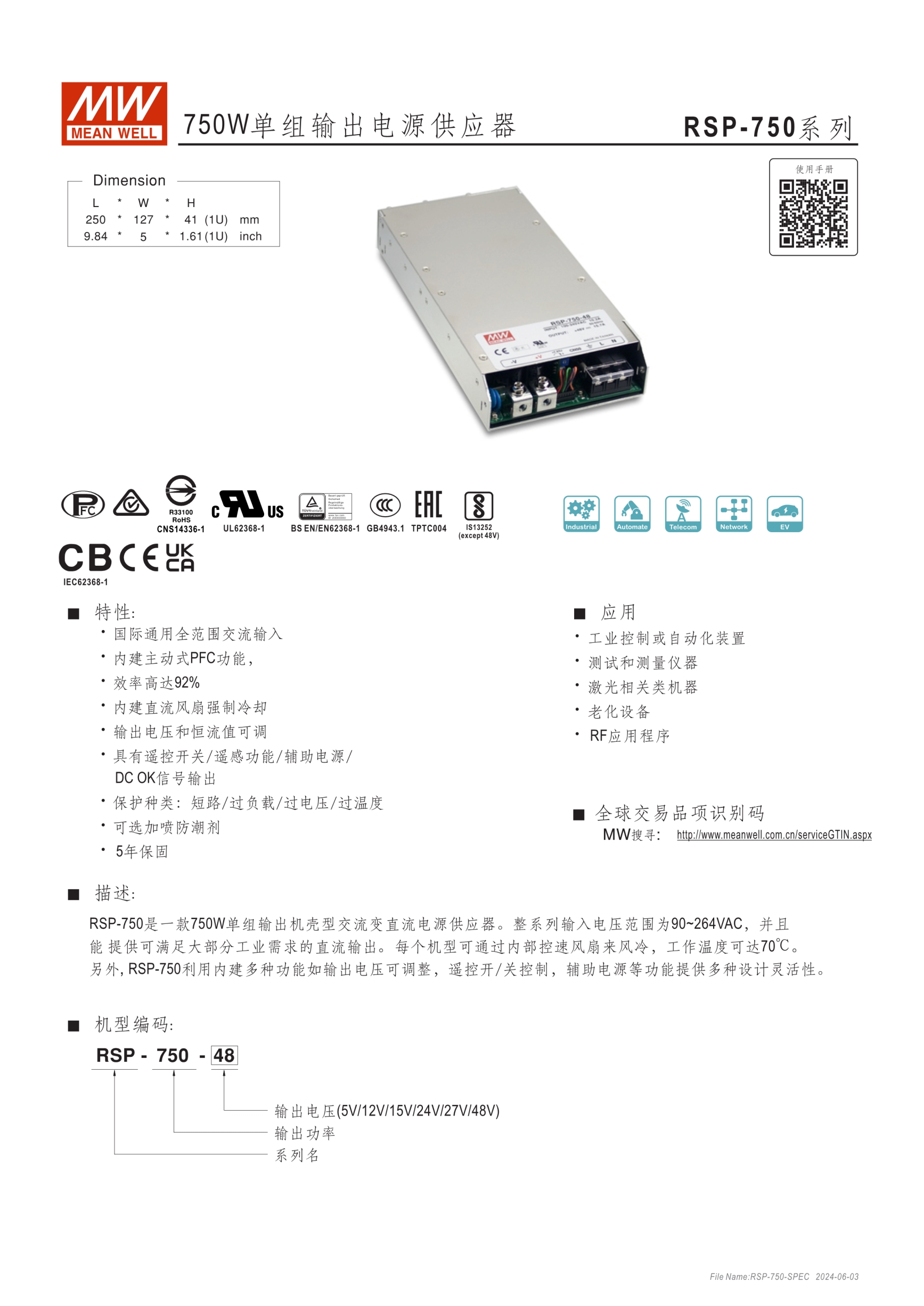 內建主動式功率因子矯正功能(active PFC) 輸出電壓可程序 輸出電流(Icc)可程序 (RSP-750/1600 only) RSP-750/1000/1600/2000為1U(41mm)低高度設計,(RSP-1500/2400/3000為2U) 內建主動式并聯功能(除RSP-750) 5年保固期