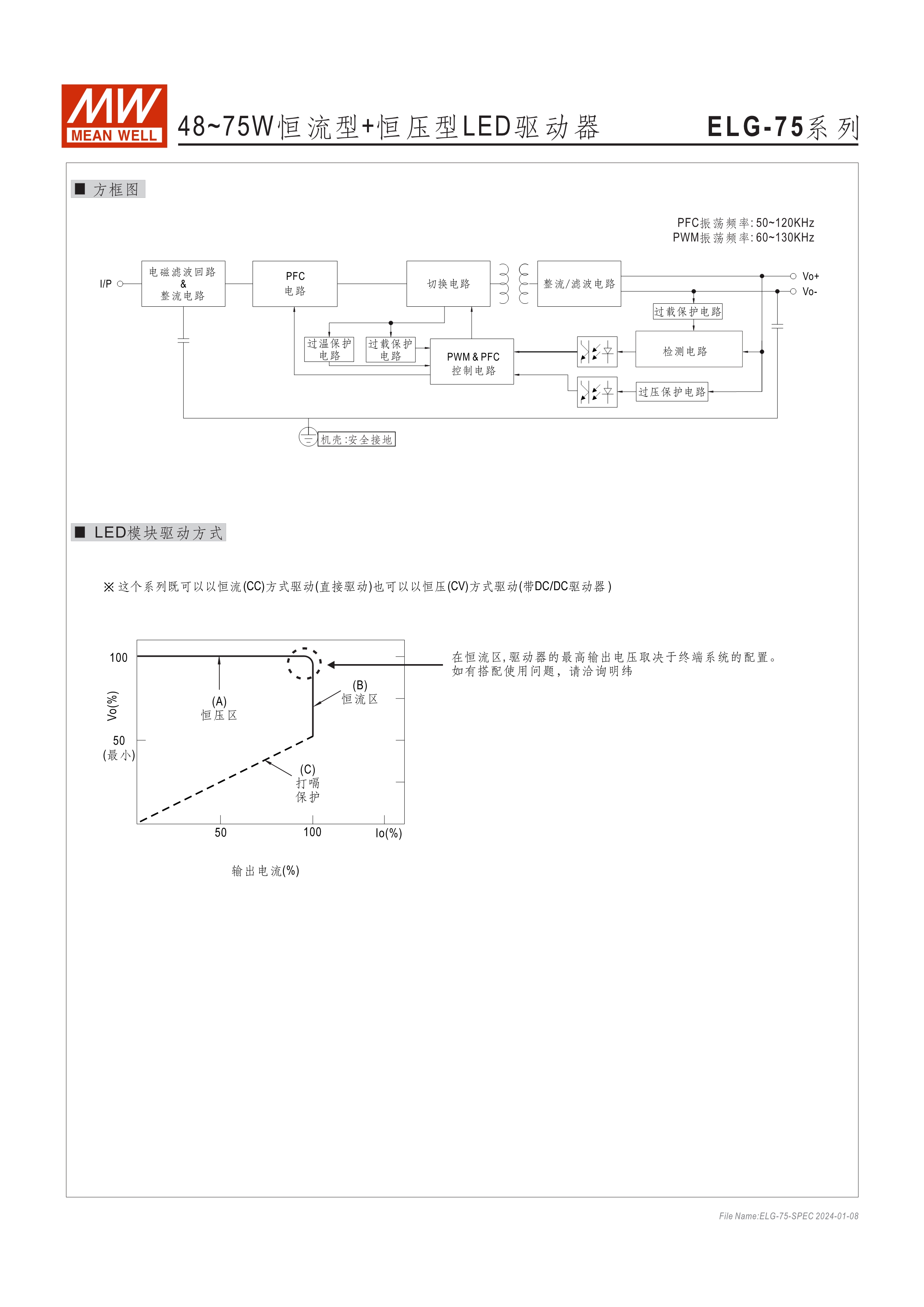 輸入范圍100~305VAC 金屬外殼,IP67/IP65防護等級可用于戶外與室內(nèi) 功能選項 : 輸出可經(jīng)由電位器調(diào)整;三合一調(diào)光(0~10Vdc或10V PWM信號或電阻,可關斷);智能定時調(diào)光;DALI;輔助直流輸出(ELG-150 BE-Type) Type "HL" LED電源適用在安裝于Class I, Division 2 類 危險地點之照明燈具 適合于LED路燈及戶外LED照明等應用 5年保固期