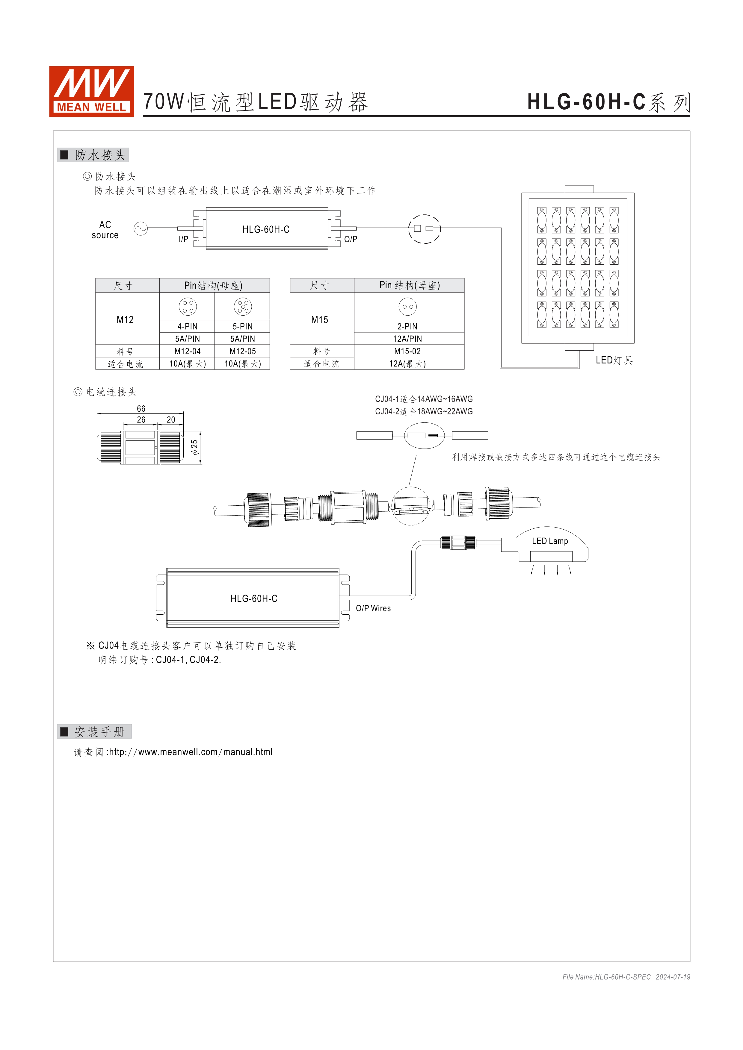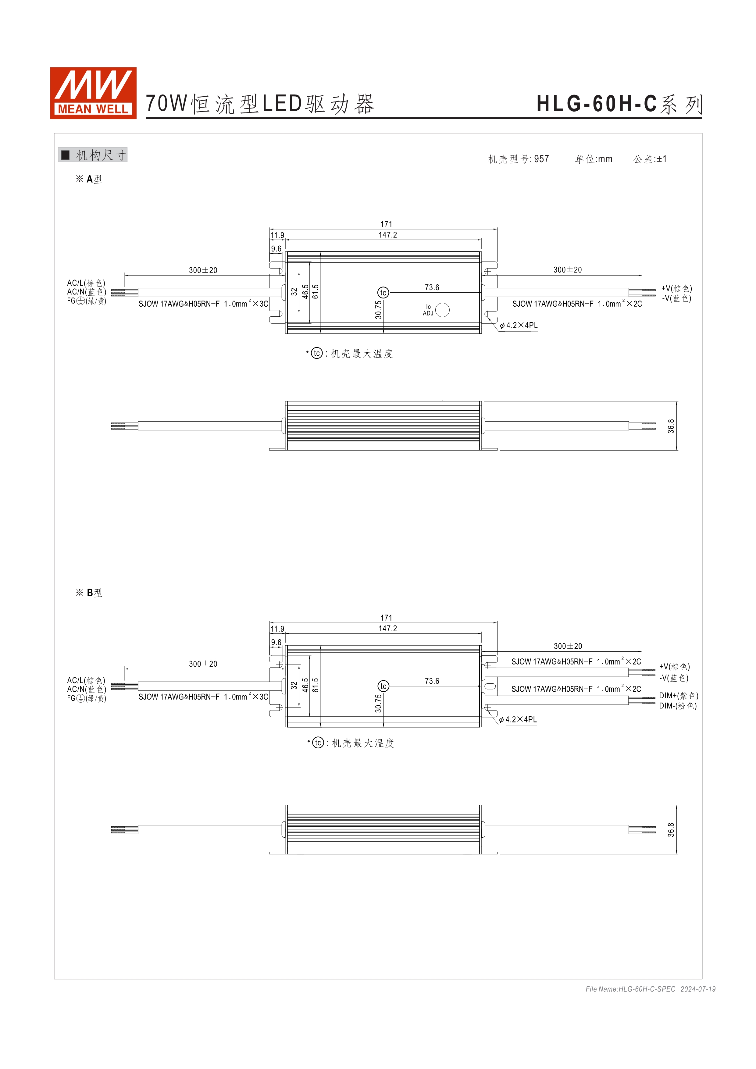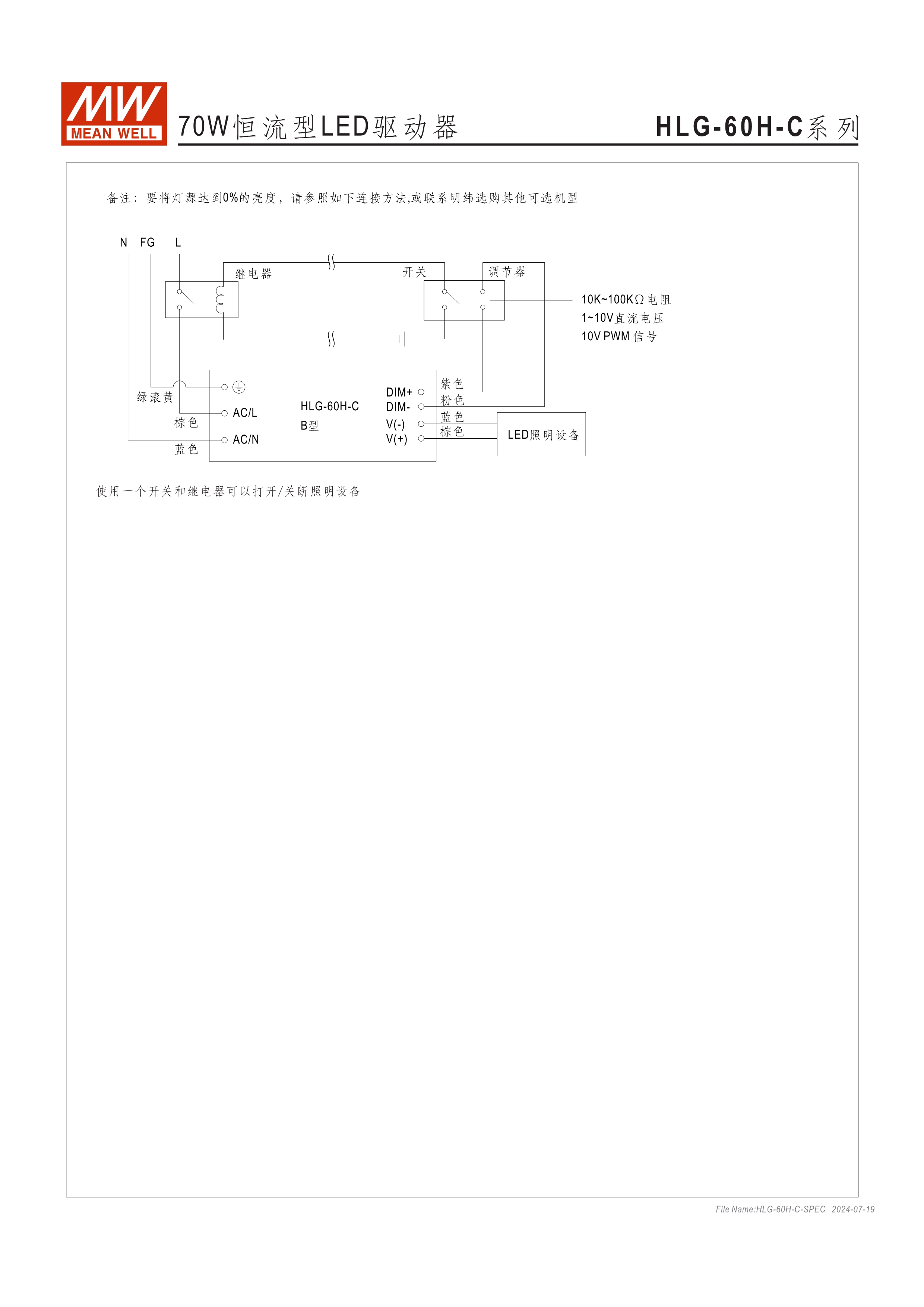 90~305VAC交流輸入,內(nèi)建主動式功率因子矯正功能(active PFC) 高壓(大于60VDC)恒流輸出機種 金屬外殼,IP67/IP65防護等級可用于戶外與室內(nèi) 功能選項 : 輸出可經(jīng)由電位器調(diào)整;三合一調(diào)光(1~10Vdc或10V PWM信號或電阻);定時調(diào)光;智能定時調(diào)光 Type "HL" LED電源適用在安裝于Class I, Division 2 類 危險地點之照明燈具 (僅HLG-240H-C/320H-C) 適合于LED路燈及戶外LED照明等應(yīng)用 7年保固期