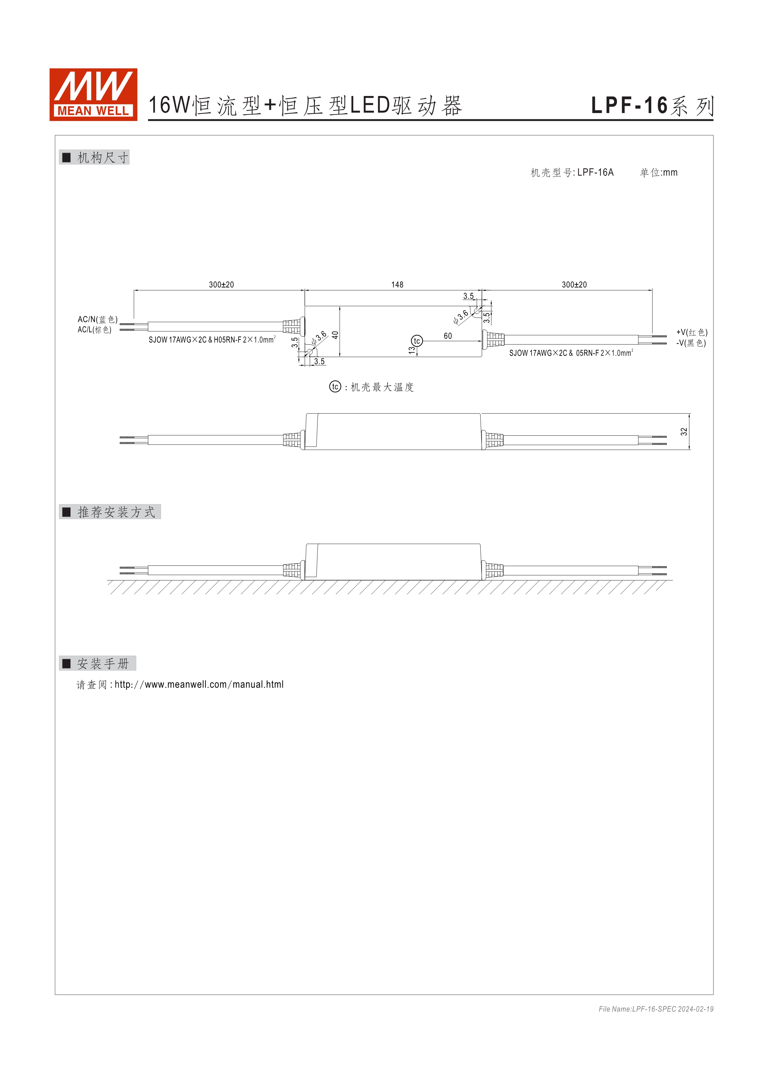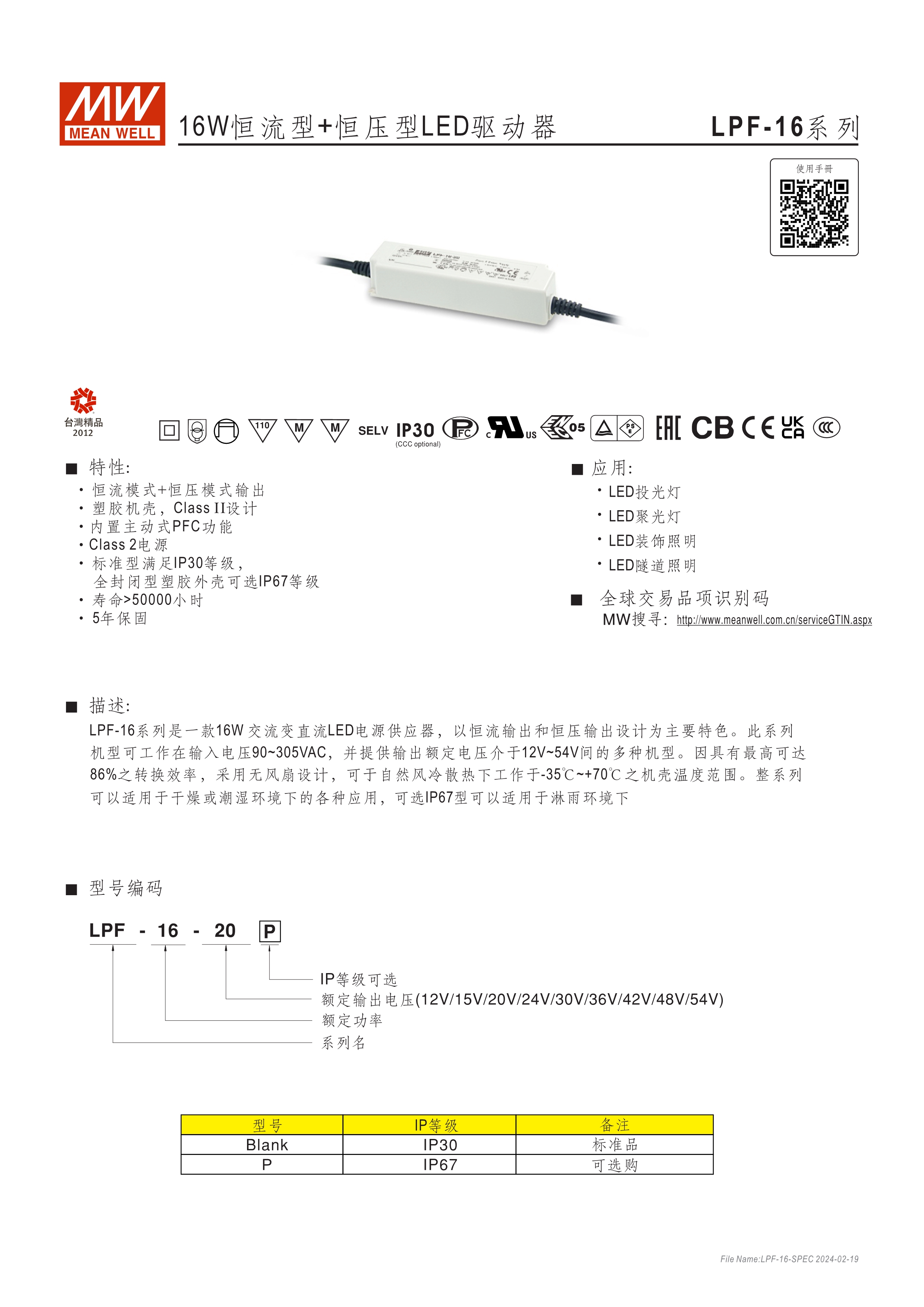 90~305VAC交流輸入, 內(nèi)建主動式功率因子矯正功能(active PFC) 塑料外殼,IP67防護等級(16W需選購) Class II設計,無FG D type 機種內(nèi)建三合一調(diào)光功能(1~10VDC,PWM信號或電阻) Type "HL" LED電源適用在安裝于Class I, Division 2 類 危險地點之照明燈具(LPF-90/90D) 適合于LED照明及LED電子廣告牌相關應用 5年保固期