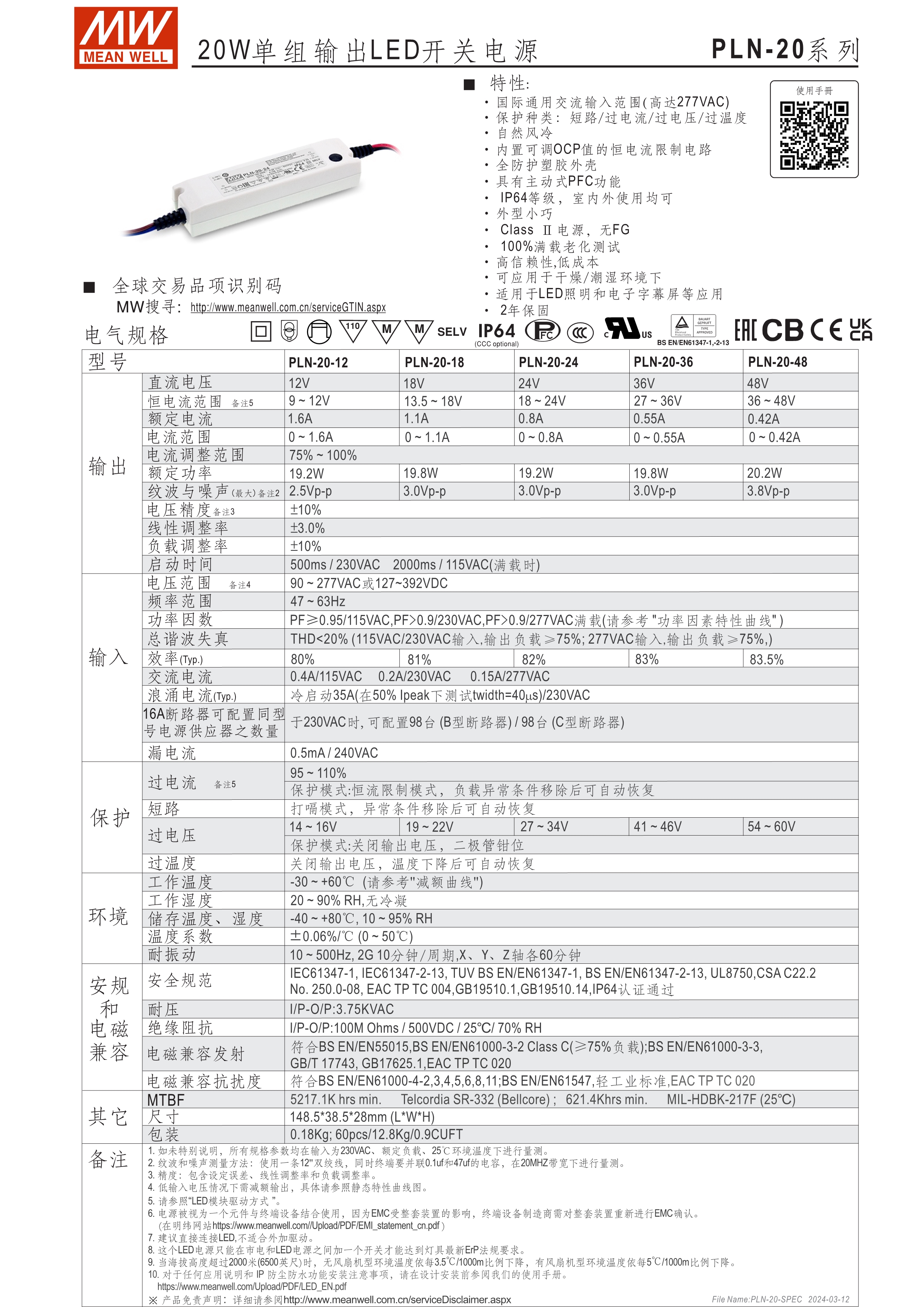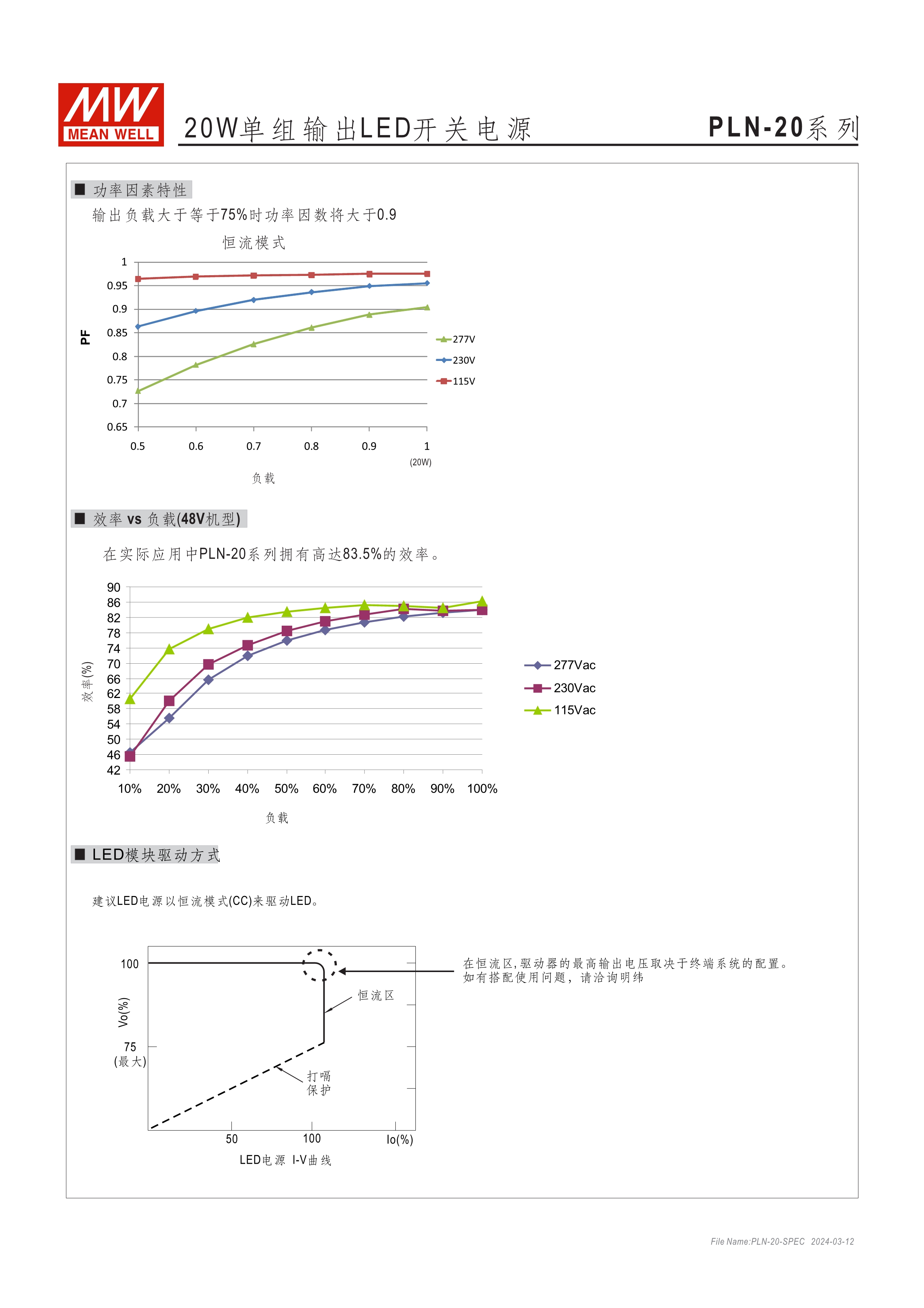 90~295VAC交流輸入(PLN-20為90~277VAC), 內(nèi)建主動(dòng)式功率因子矯正功能(active PFC) 塑料外殼,IP64防護(hù)等級(jí) 適合于LED室內(nèi)照明及LED電子廣告牌相關(guān)應(yīng)用