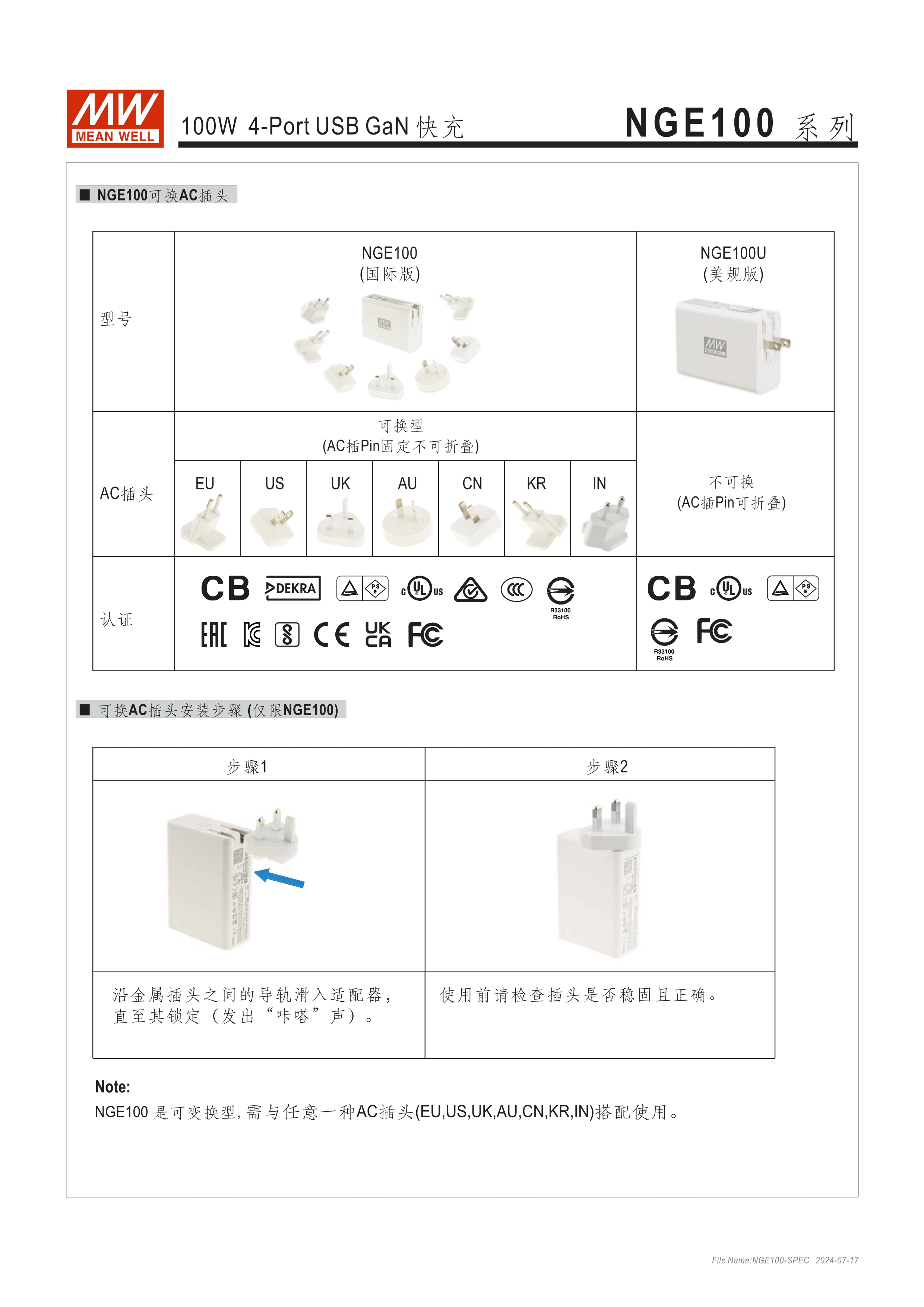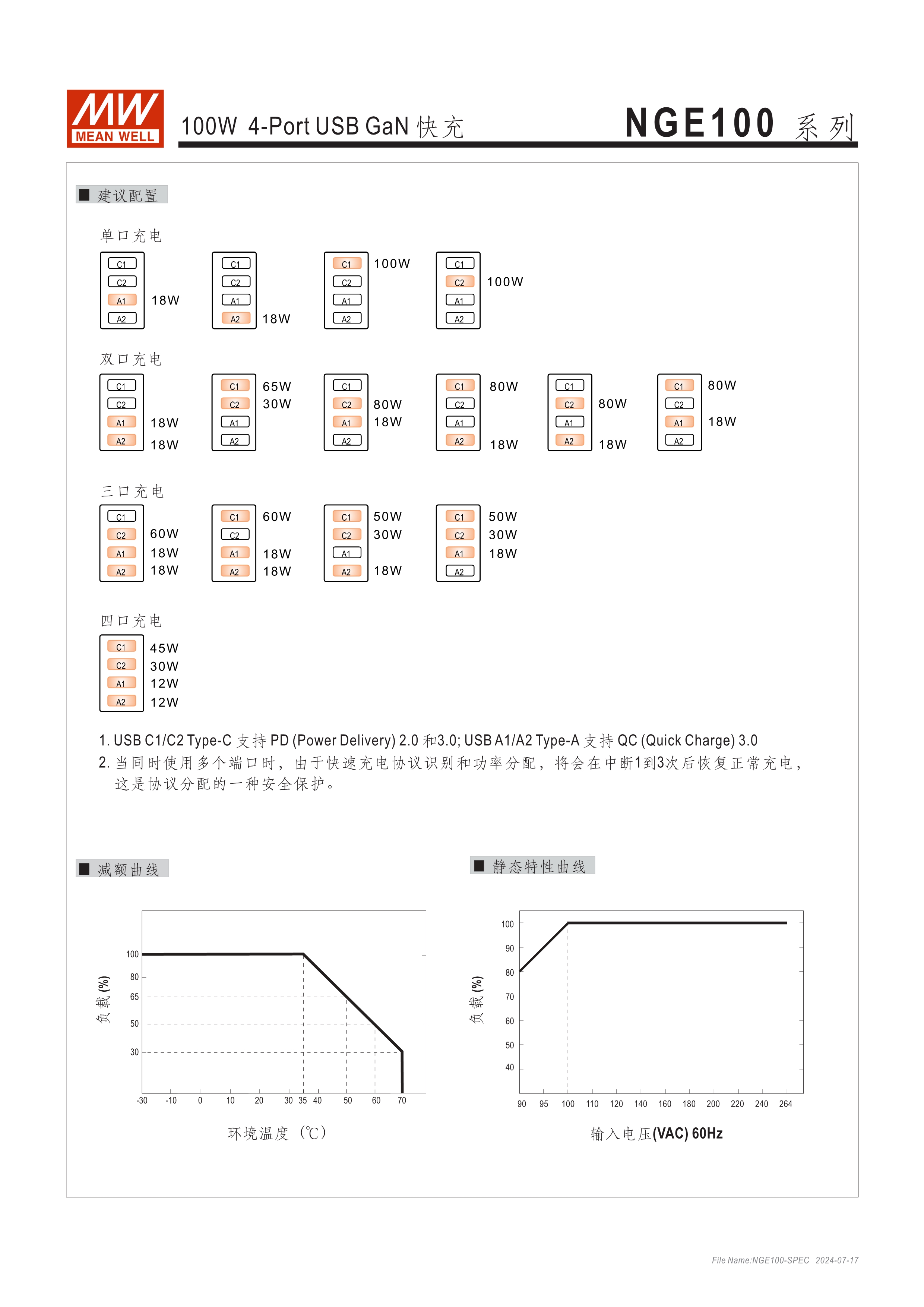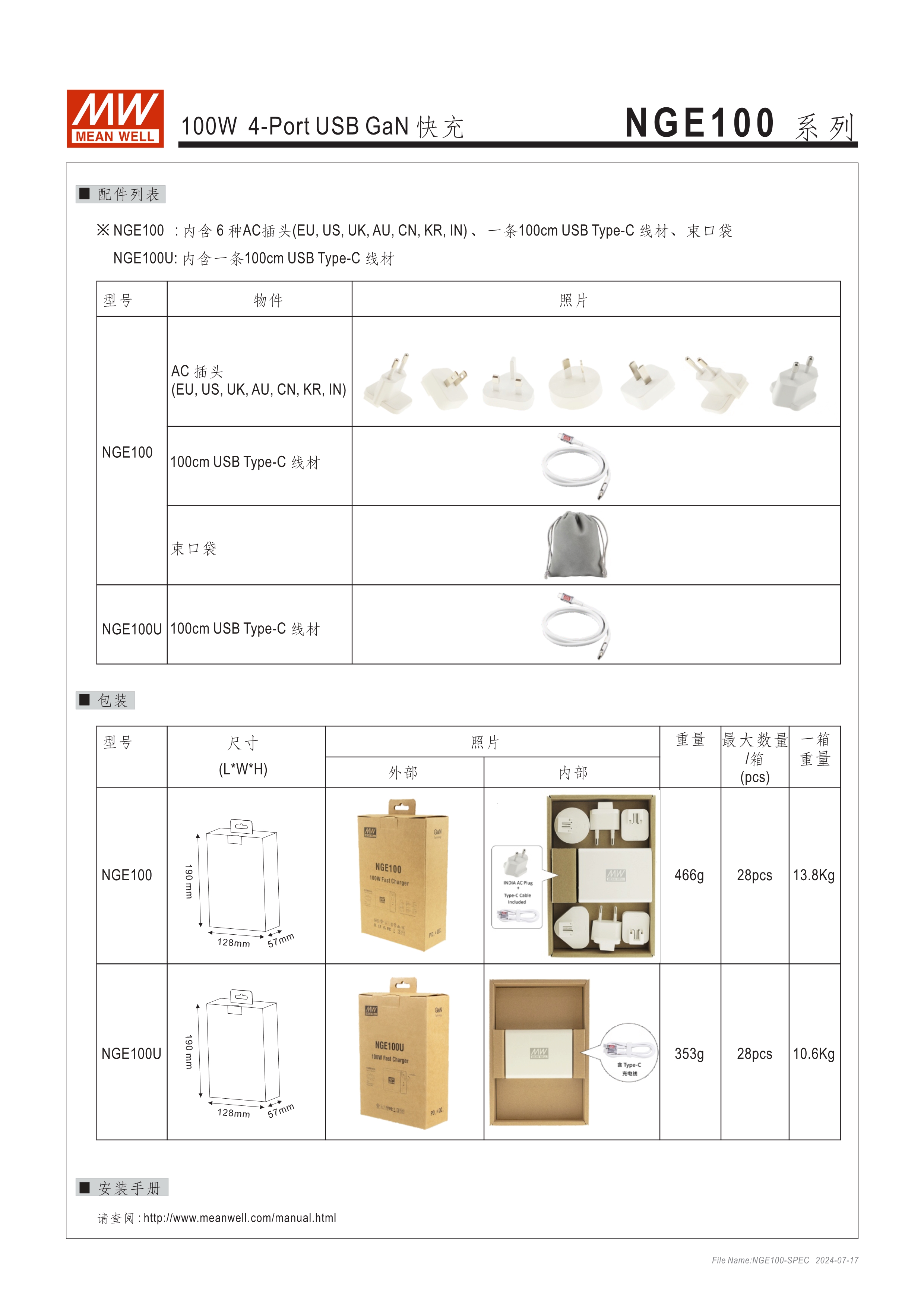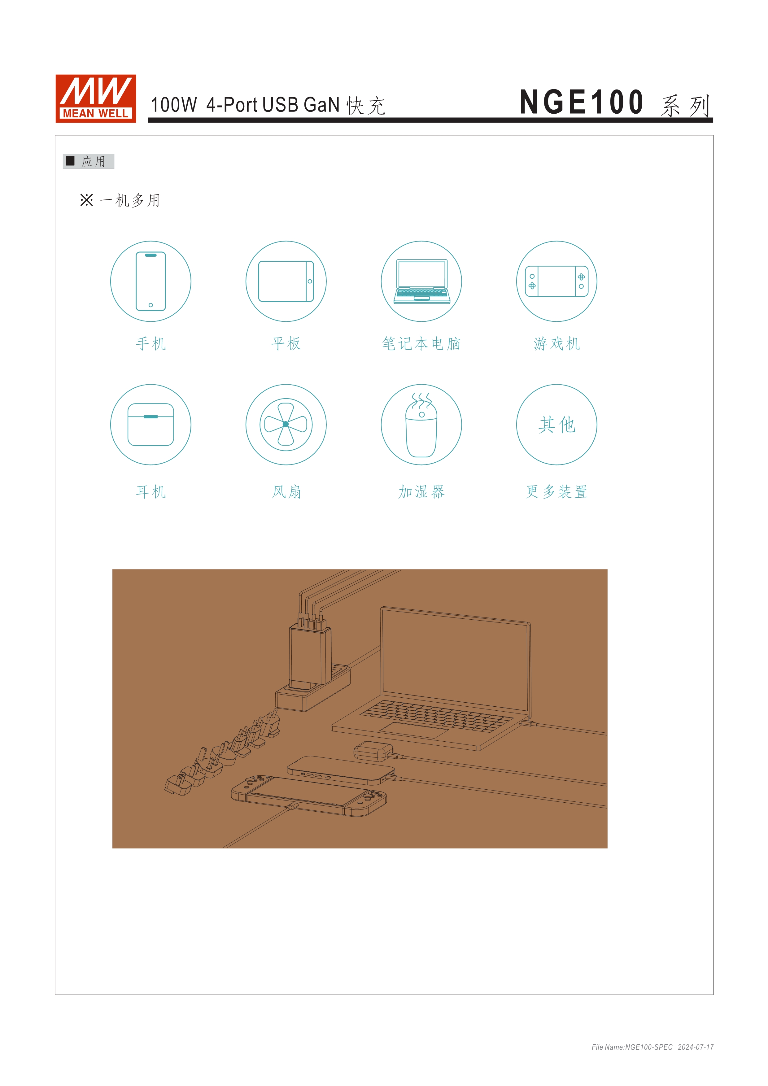 一臺可同時充多種裝置 國際版: AC插頭可變換(NGE100); 美規(guī)版: AC插頭不可換,可折疊(NGE100U) 全球國際認證 USB-2C2A,4-Port皆可獨立快充 USB-C單port可支援最高100W快充 支援QC2.0、QC3.0、PD3.0 自動偵測電壓:5V/ 9V/ 12V/ 15V/ 20V 保護功能 : 短路、過載、過溫 空載損耗<0.3W 能效等級Level VI 尺寸小巧 (62x 30x 85.5mm) 附贈兼具充電及資料傳輸的Type-C線 (100cm) 3年保固