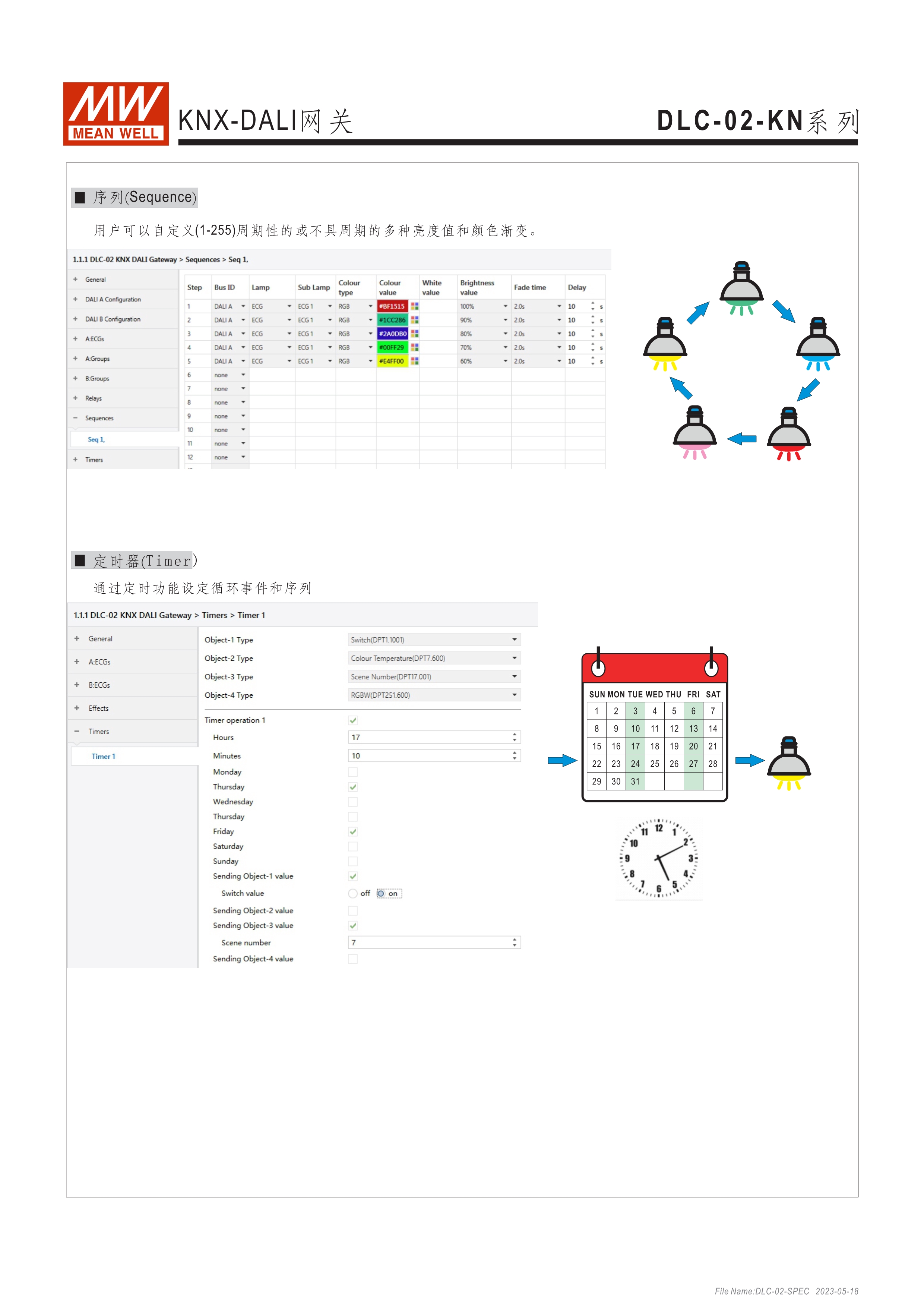 符合IEC 62386 DALI-2,Part 101/103/207/208標準 2組獨立DALI總線,可接Control Gear及Control Device搭配使用 4路可控繼電器,接觸容量5A,可當電器開關(guān)或兩組電動窗簾使用 可搭配DLC軟體做現(xiàn)場系統(tǒng)設(shè)定,或透過網(wǎng)路線從遠端做修改設(shè)定 透過本體液晶顯示螢?zāi)患安倏匕粹o,可做簡單設(shè)定和狀態(tài)查詢 內(nèi)建Timer晶片,可搭配DLC軟體做行程控制設(shè)定 通訊介面接口:RJ-45及KNX,可與其他樓宇自動化系統(tǒng)做連線擴充使用 采導軌式設(shè)計,體積小巧僅8SU寬度(144x 90x 58.4mm)