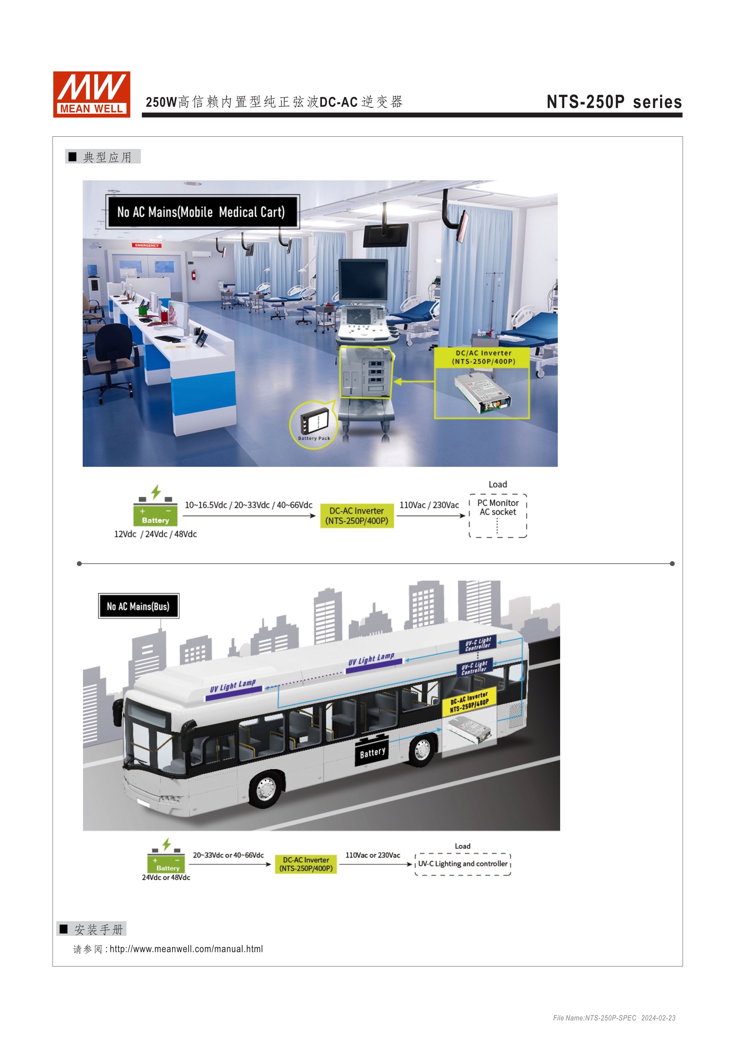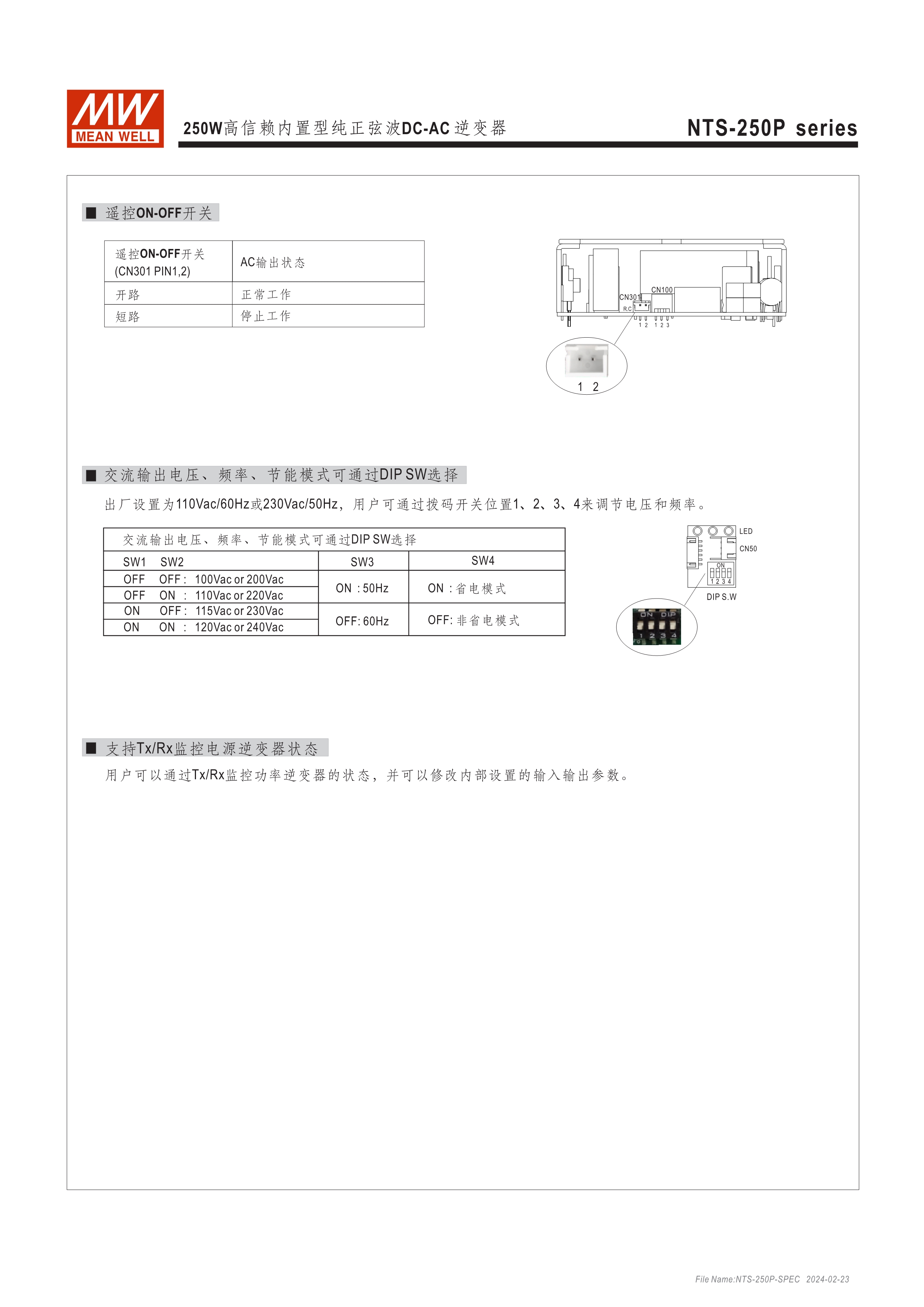 DC-AC純正弦波輸出 (THD<3%) 無風(fēng)扇設(shè)計(jì),效率最高達(dá)93%,可自然風(fēng)冷散熱 瞬間峰值功率達(dá)雙倍輸出 內(nèi)建DIP S.W可彈性自調(diào)AC輸出電壓、頻率、節(jié)能模式 多重智能保護(hù)功能: DC輸入側(cè) - 極性反接、電壓過低、電壓過高保護(hù) AC輸出側(cè) - 短路、超載、過熱保護(hù)
