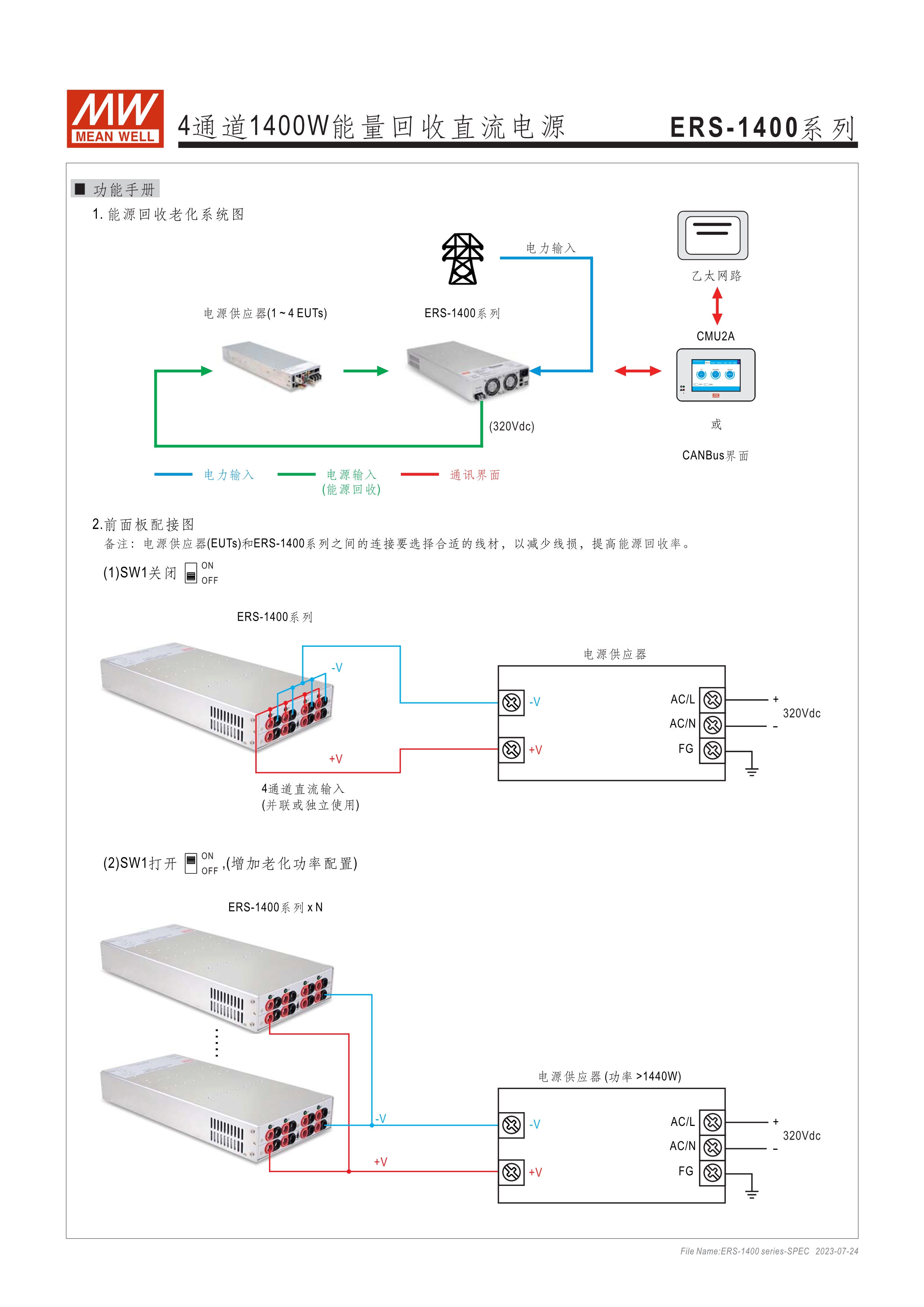 寬輸入電壓范圍10~60VDC/60~380VDC(視機型而定) 效率高達91% 靈活配置的模塊化設(shè)計 彈性的CC/CV/CP操作模式 通過CMU2A實現(xiàn)CAN總線協(xié)議遠程控制和監(jiān)控控制 可連接最多64臺ERS-1400系列 保護功能: 過電壓、欠電壓、過熱、通信錯誤 3年保固期